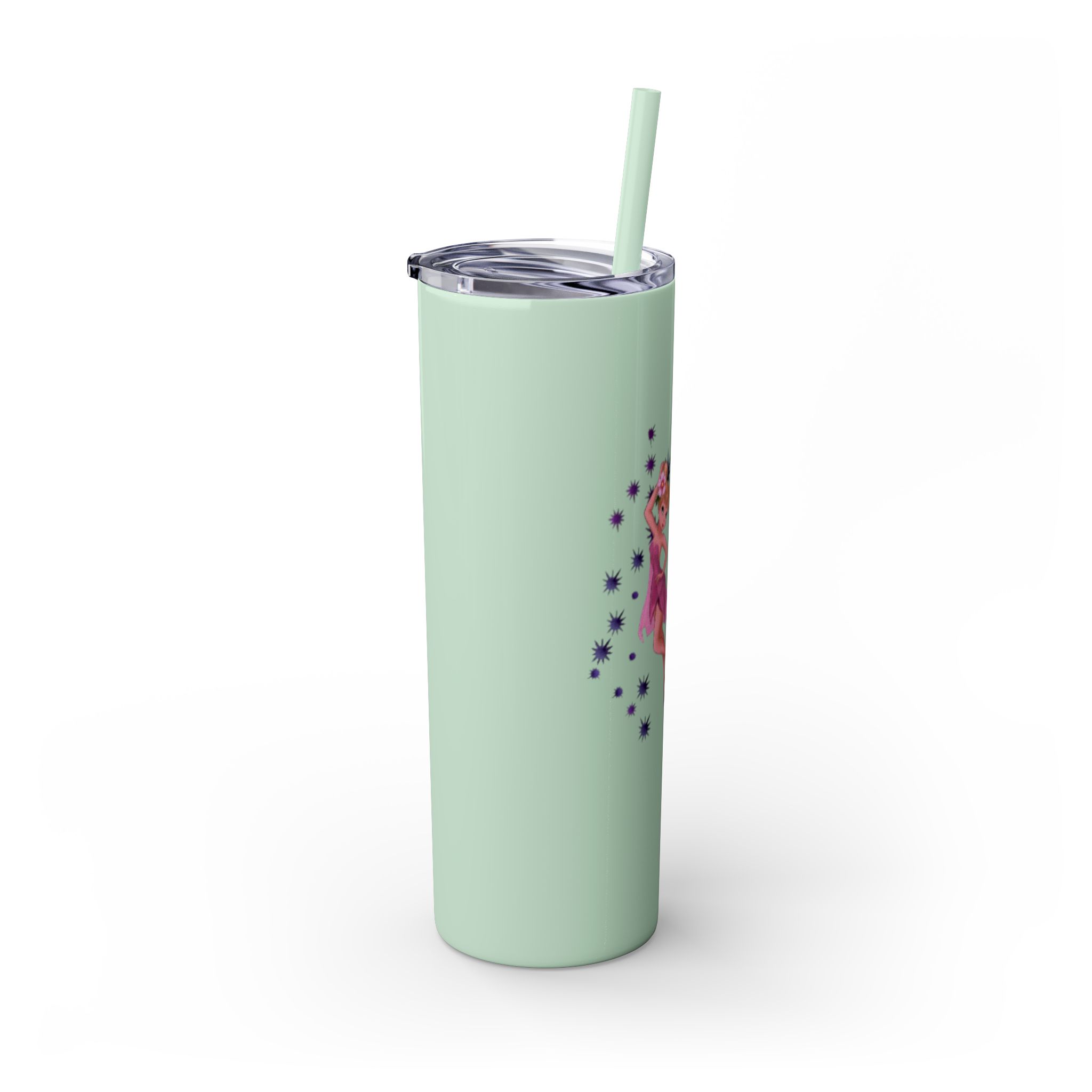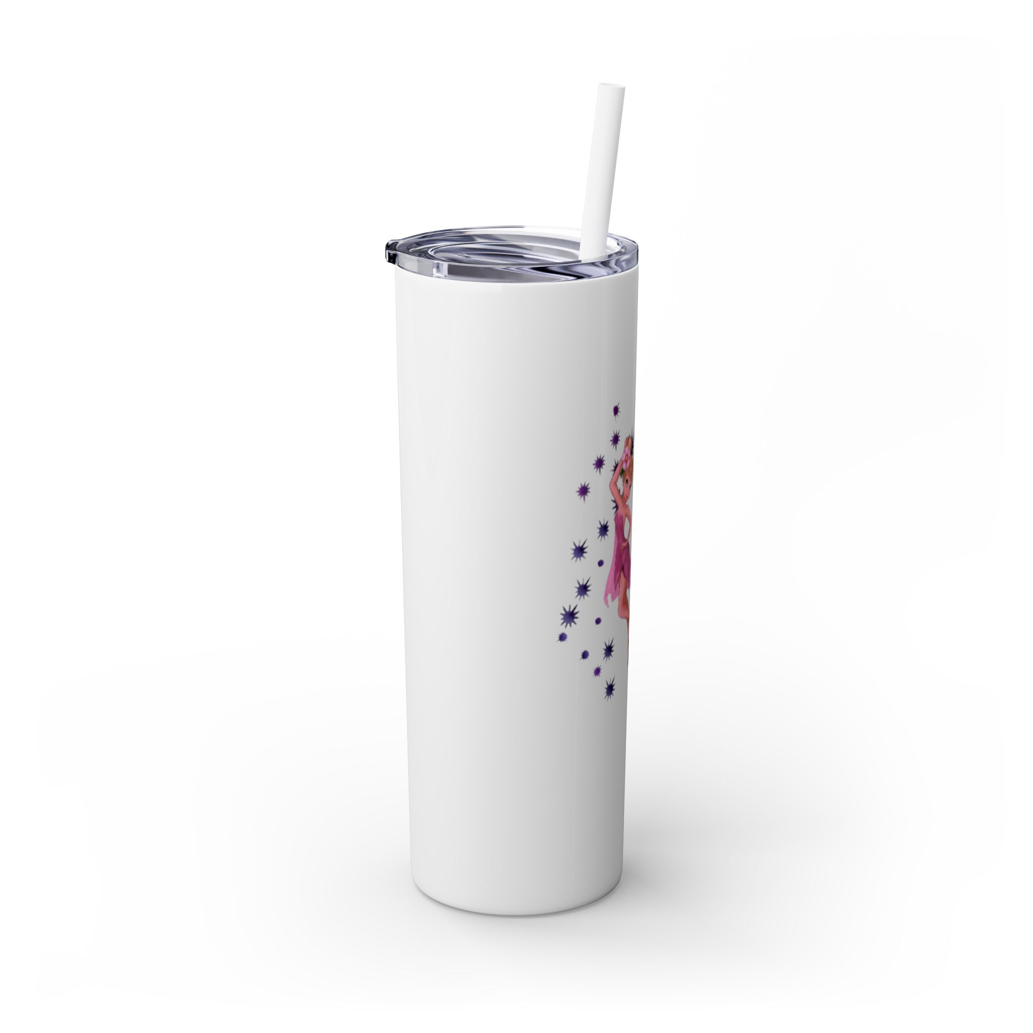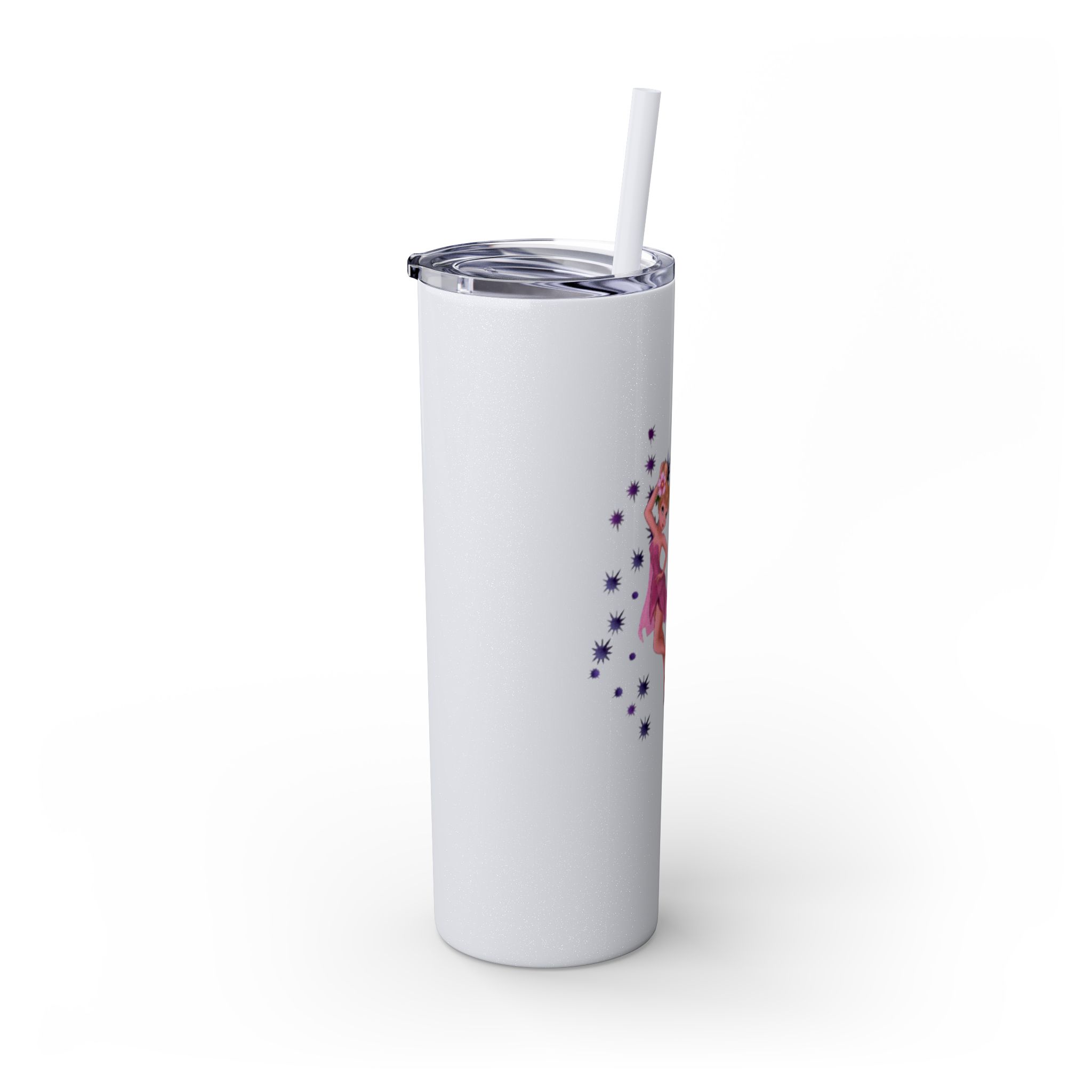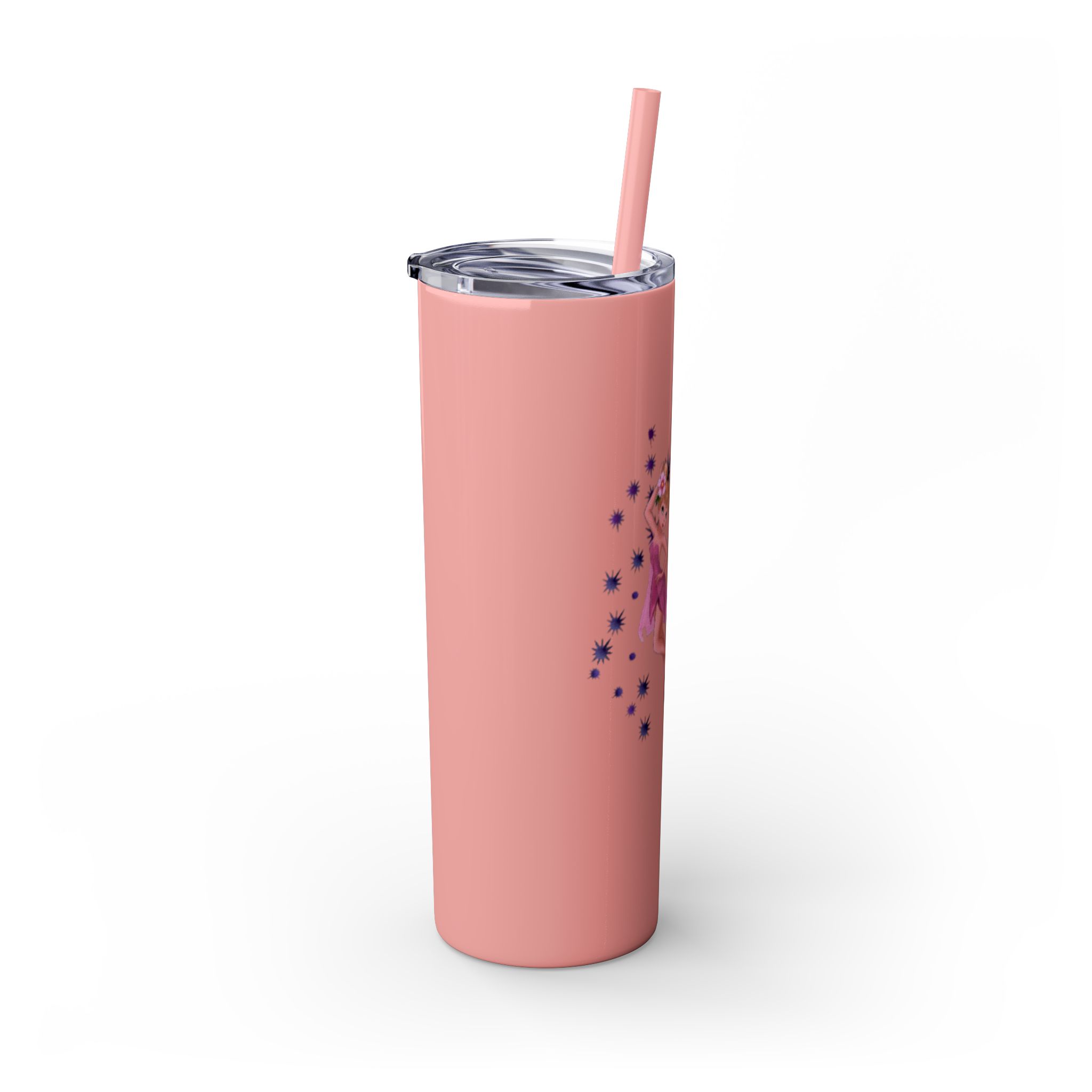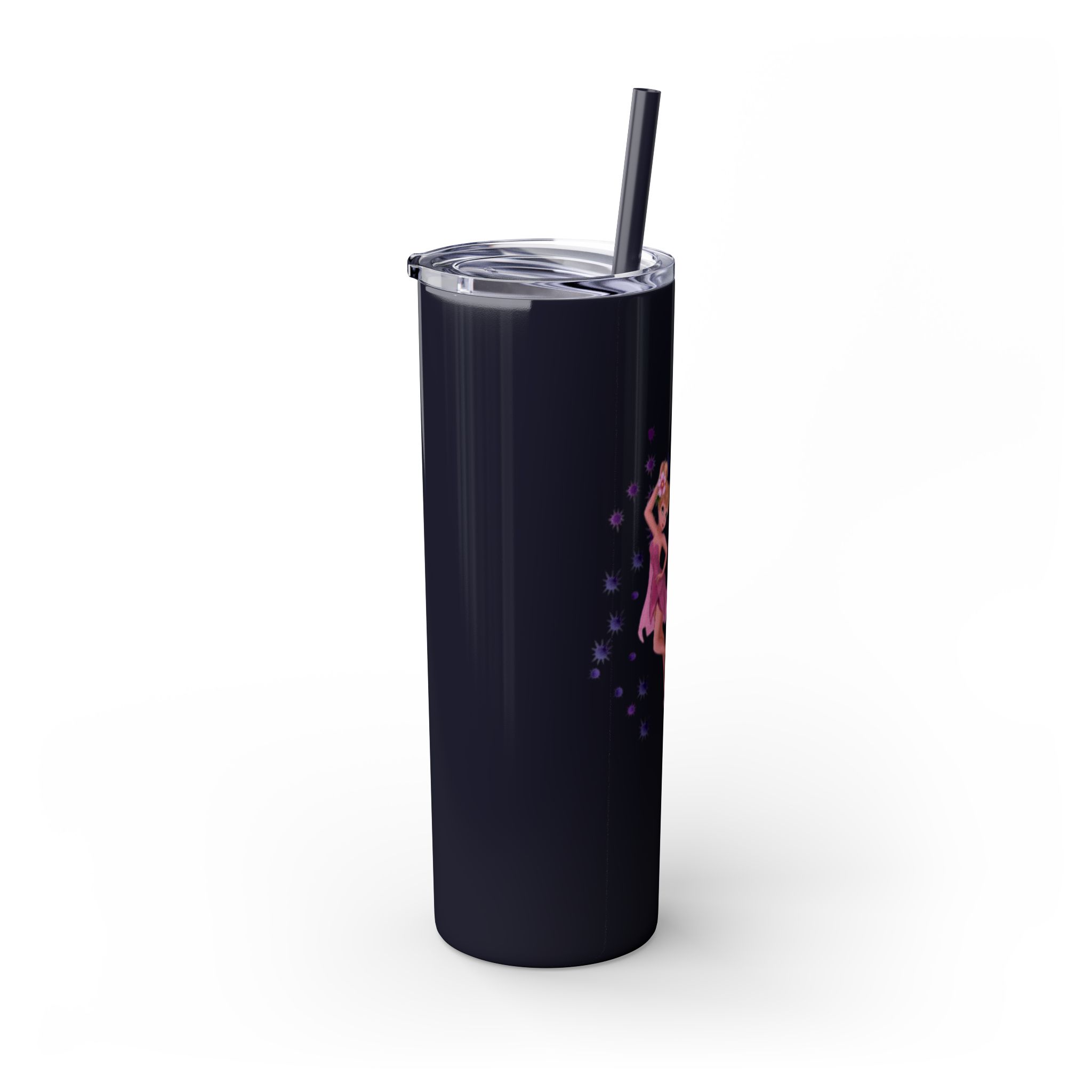 Slim, stainless steel tumbler wrapped in bright, playful artwork that brings a little sparkle to everyday sips. The tapered 20oz design slides easily into cup holders and bags, while double-wall insulation keeps drinks cold for up to 24 hours or warm for up to 12. A clear press-on lid and color-matching straw make sipping on the go simple and spill-conscious. Lightweight and durable, the tumbler’s matte or glossy powder-coated exterior holds vibrant printed colors true, and the slim profile is made for commuters, dancers, or anyone who loves a little retro-glam in their routine. Hand wash to preserve the print and finish.
