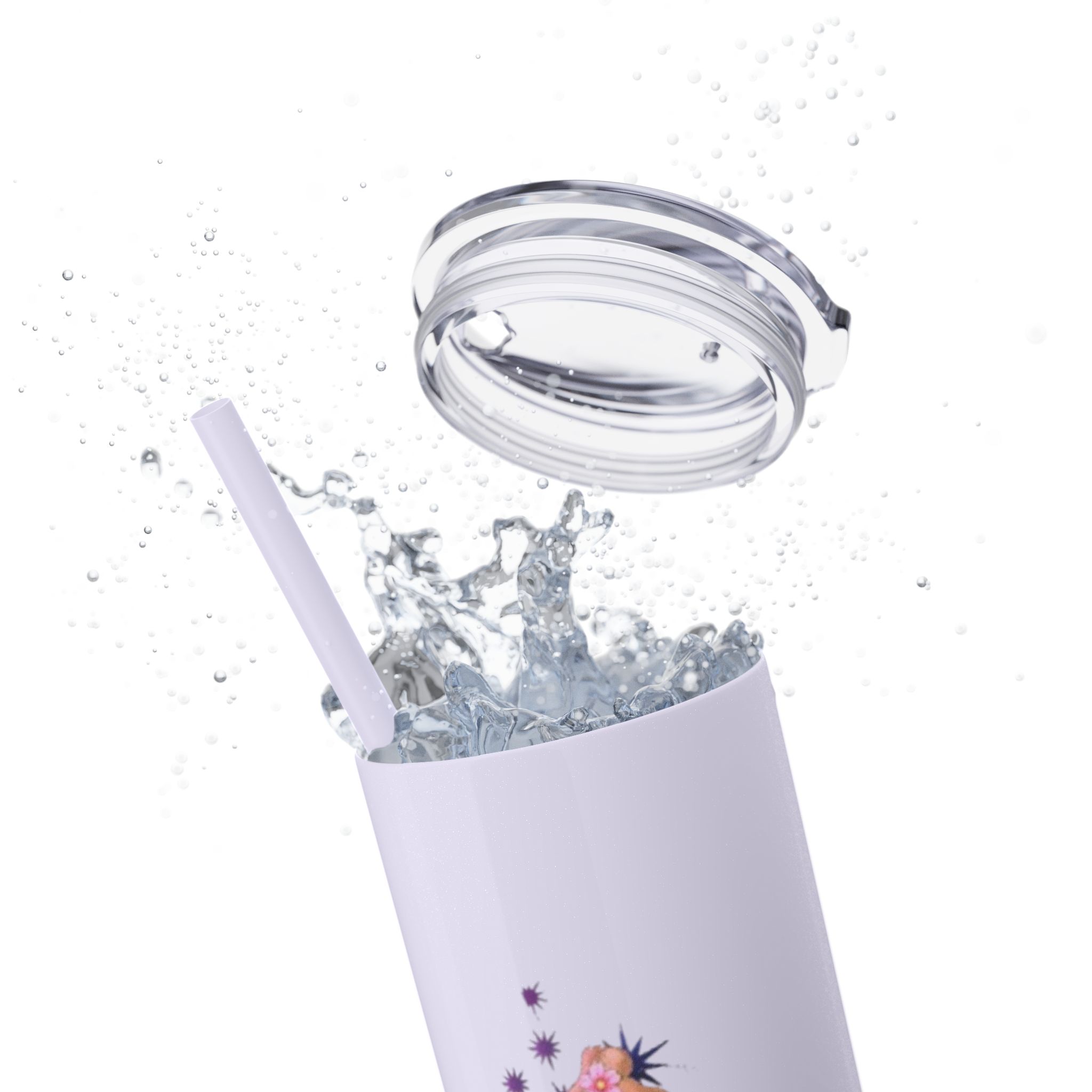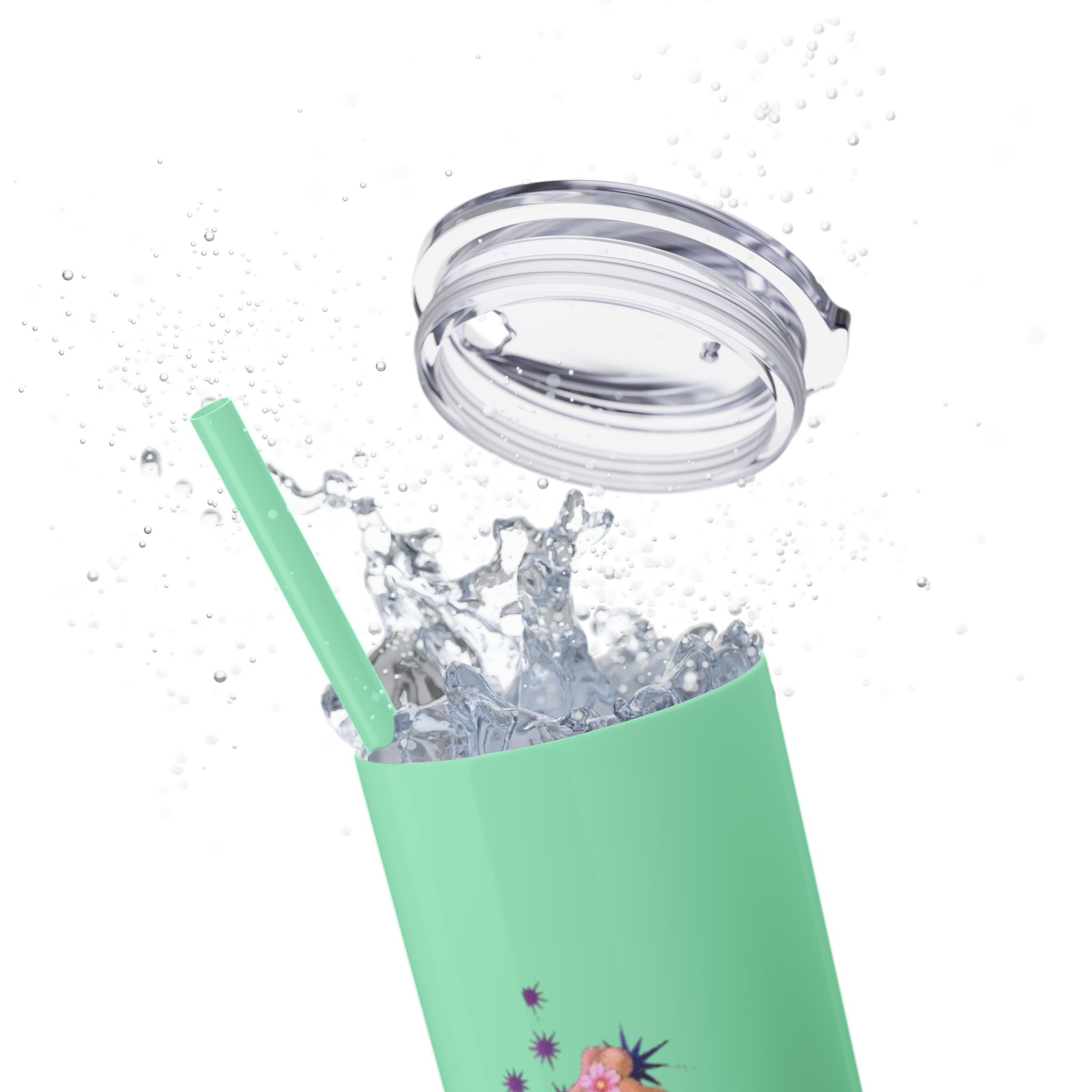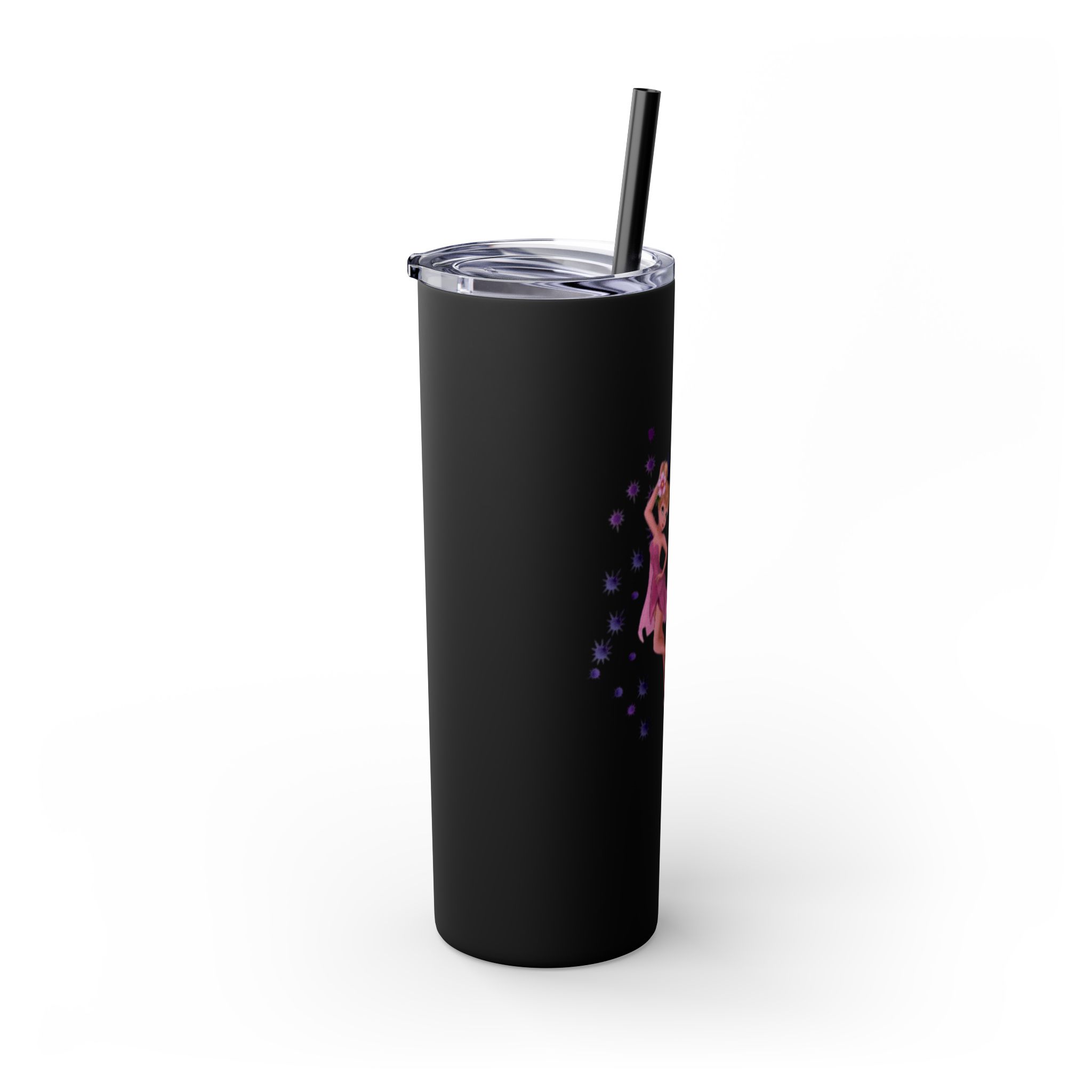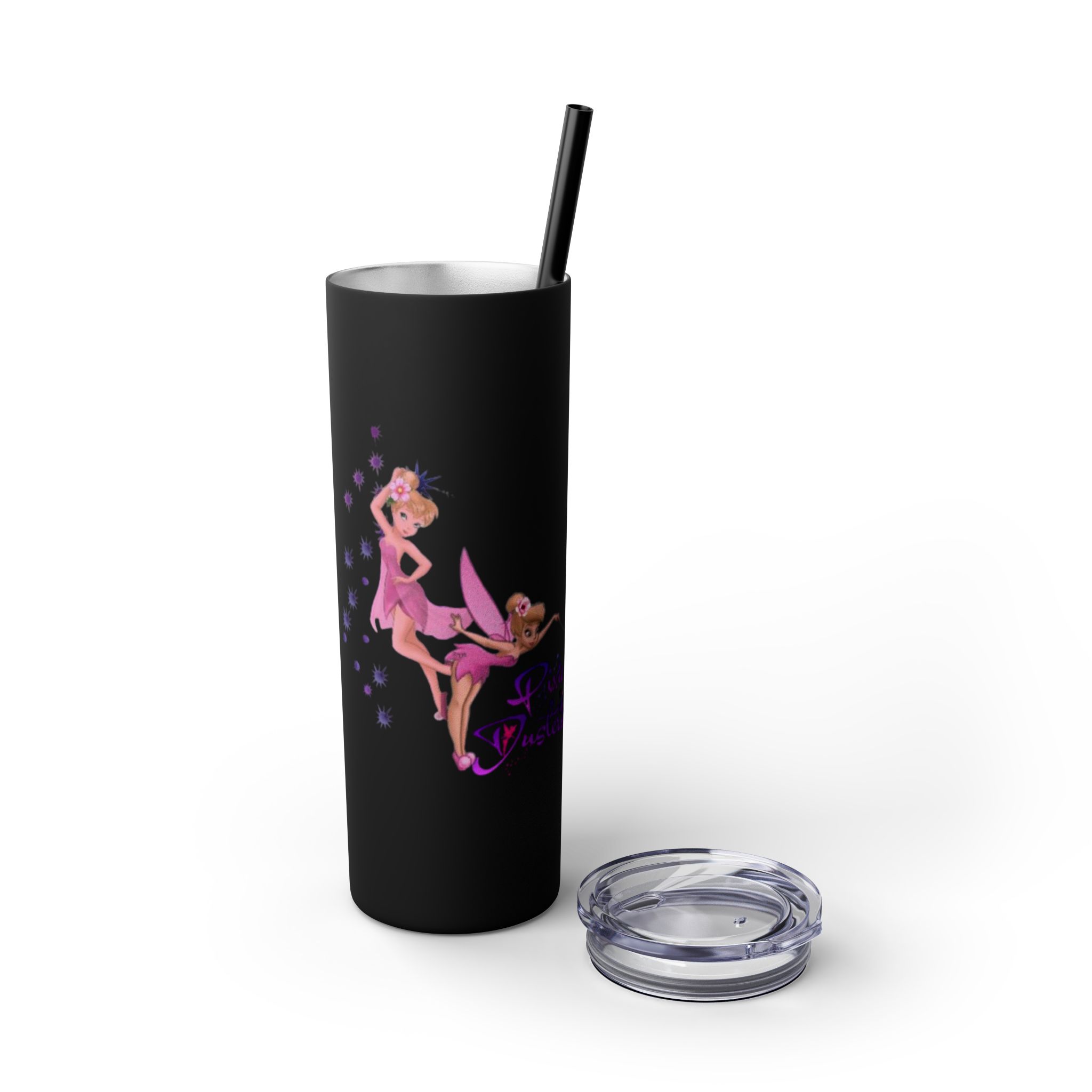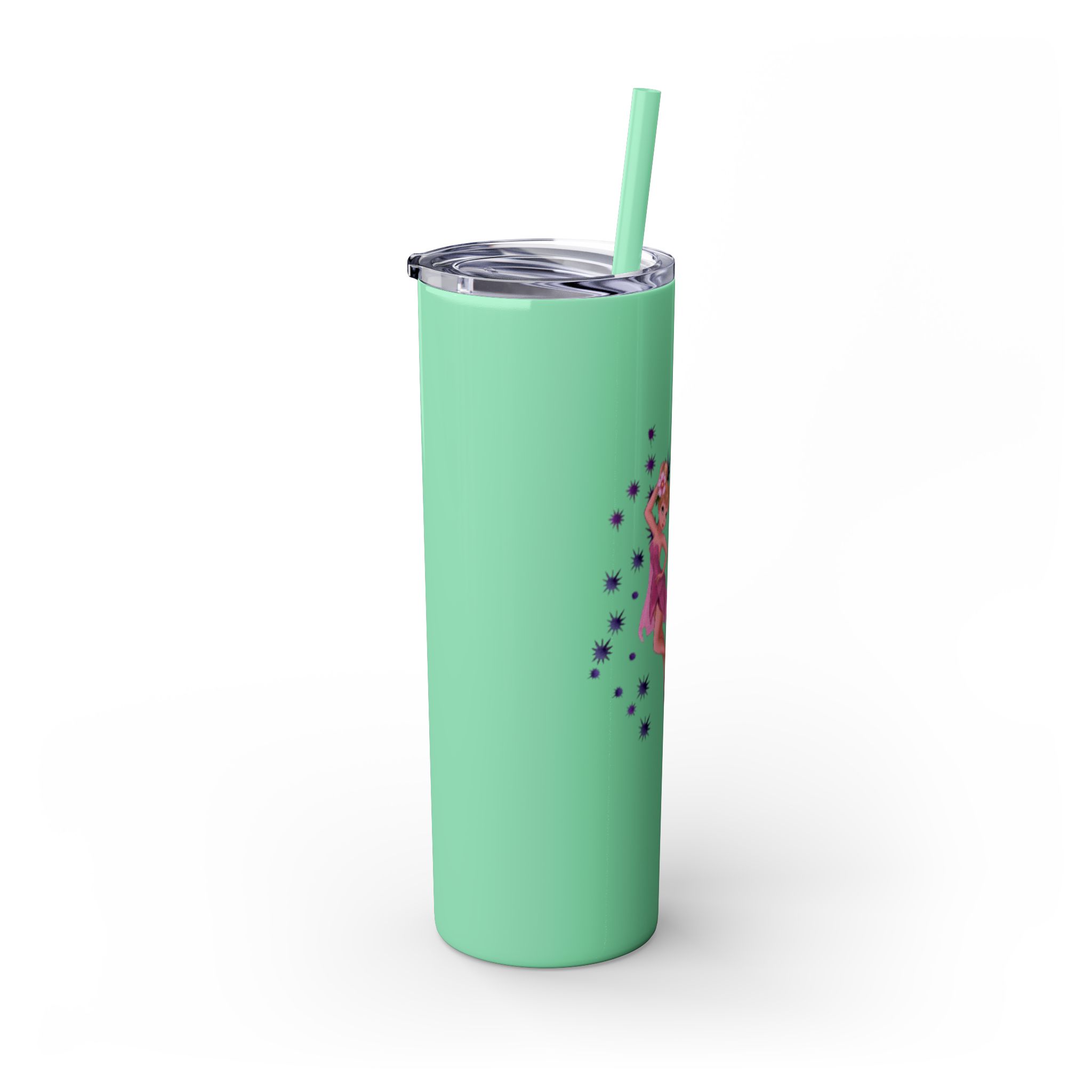 Slim, stainless steel tumbler wrapped in bright, playful artwork that brings a little sparkle to everyday sips. The tapered 20oz design slides easily into cup holders and bags, while double-wall insulation keeps drinks cold for up to 24 hours or warm for up to 12. A clear press-on lid and color-matching straw make sipping on the go simple and spill-conscious. Lightweight and durable, the tumbler’s matte or glossy powder-coated exterior holds vibrant printed colors true, and the slim profile is made for commuters, dancers, or anyone who loves a little retro-glam in their routine. Hand wash to preserve the print and finish.