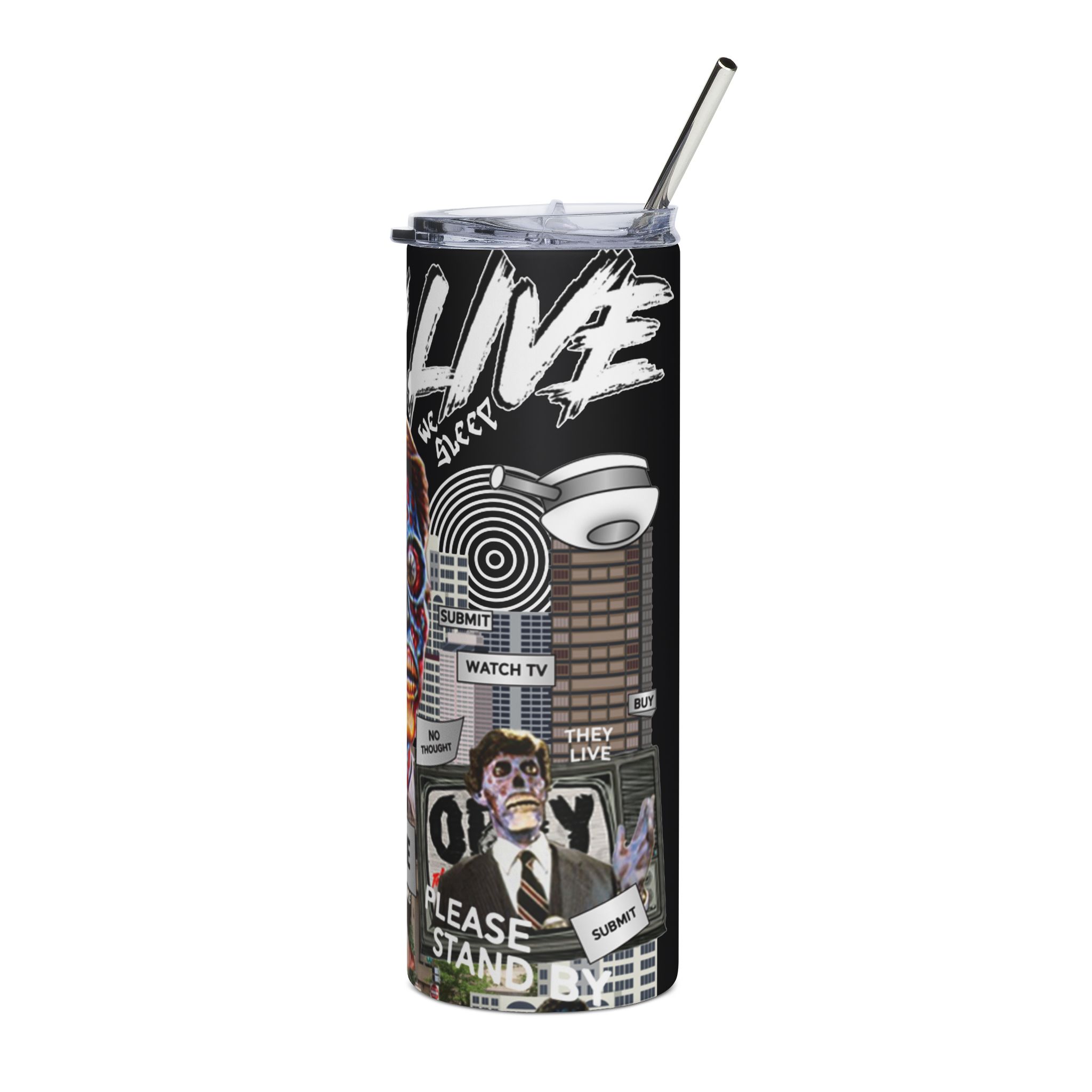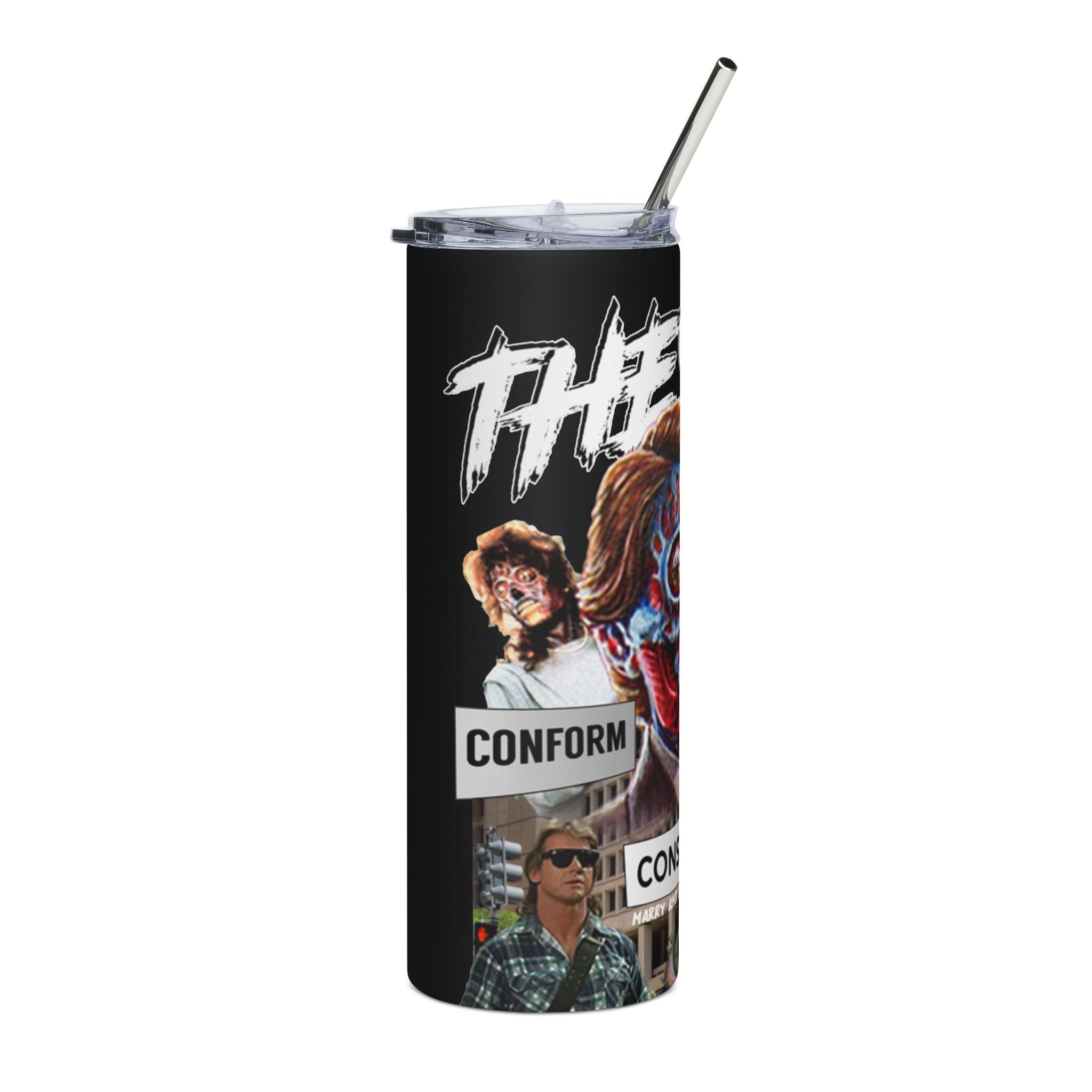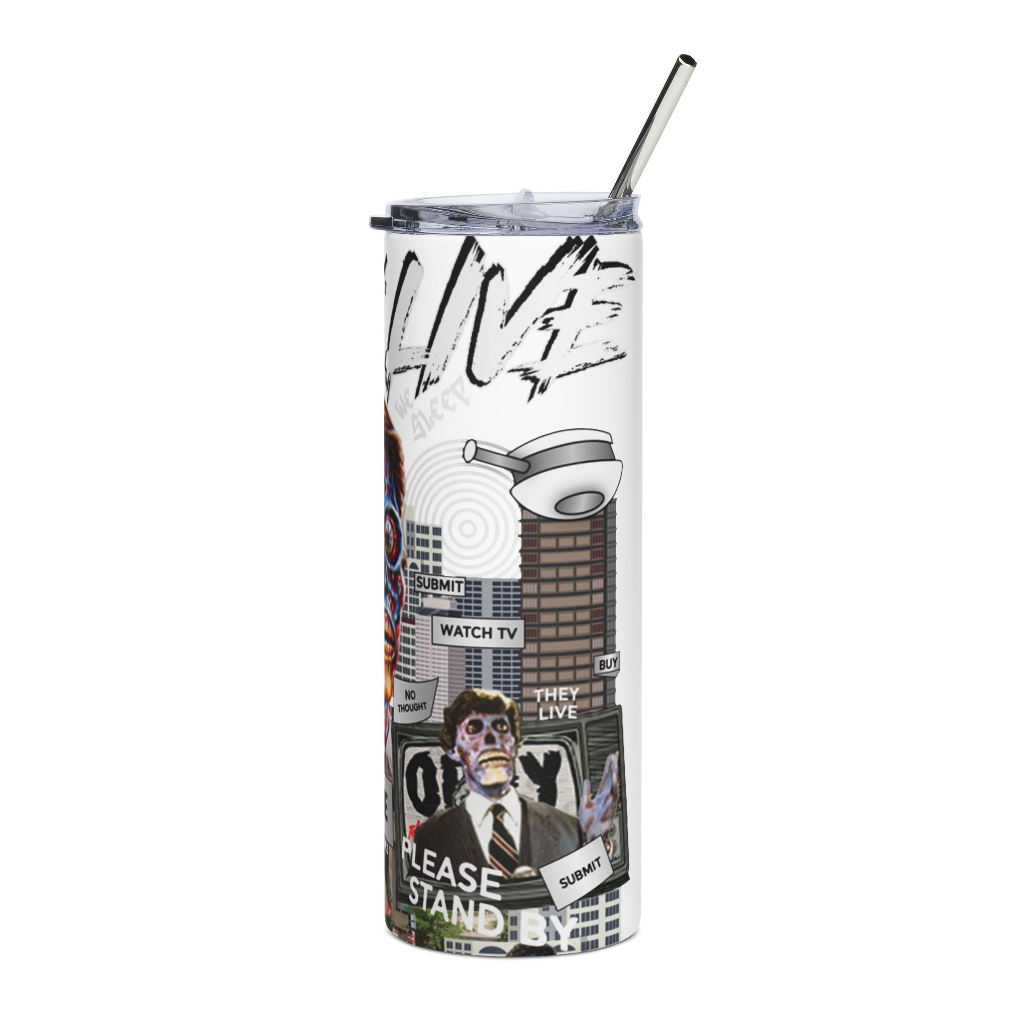 This slim 20 oz stainless steel tumbler carries a rebellious, collage-style design that speaks to fans of cult sci-fi and counterculture art. The tall, cylindrical shape keeps drinks at hand while the clear lid and included metal straw make sipping easy on the go. The artwork wraps fully around the tumbler, blending bold, gritty imagery with text elements that nod to resistance and awareness. Its glossy protective coat keeps the print vivid and adds an eye-catching shine. Durable stainless construction resists rust and everyday wear, making it a reliable companion from commutes to late-night movie marathons.