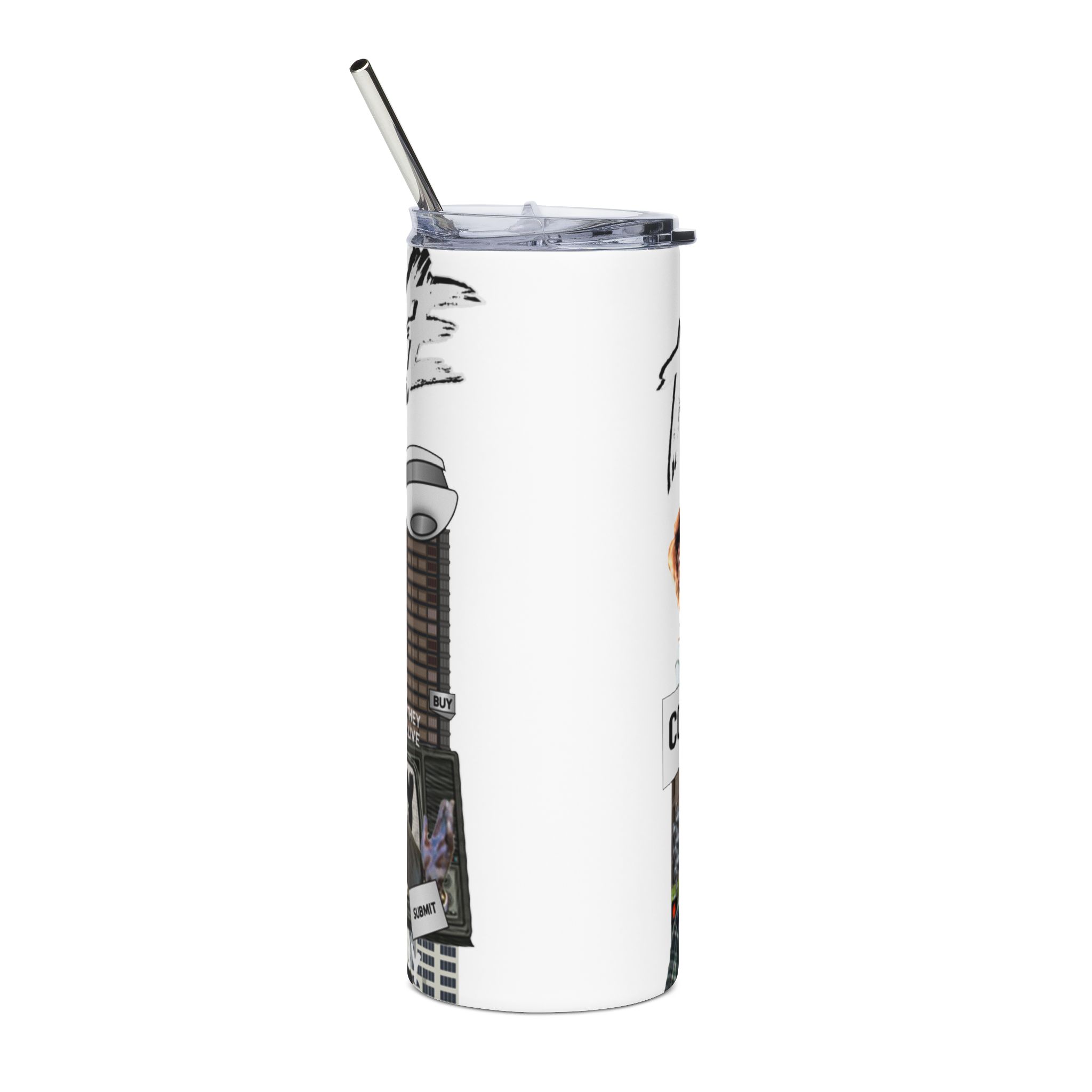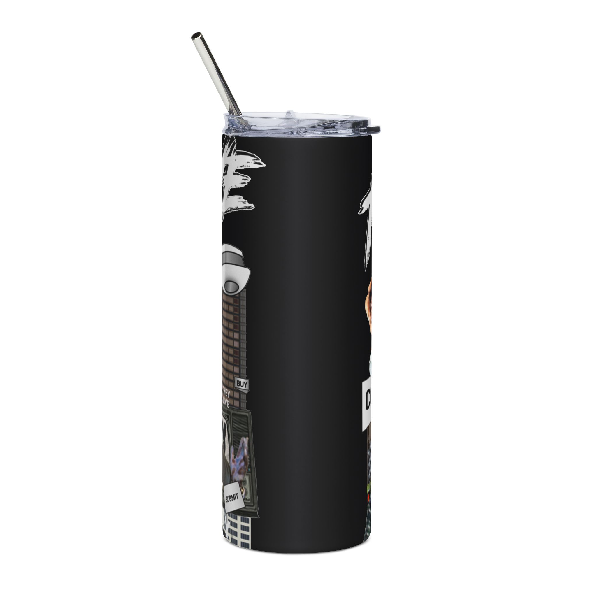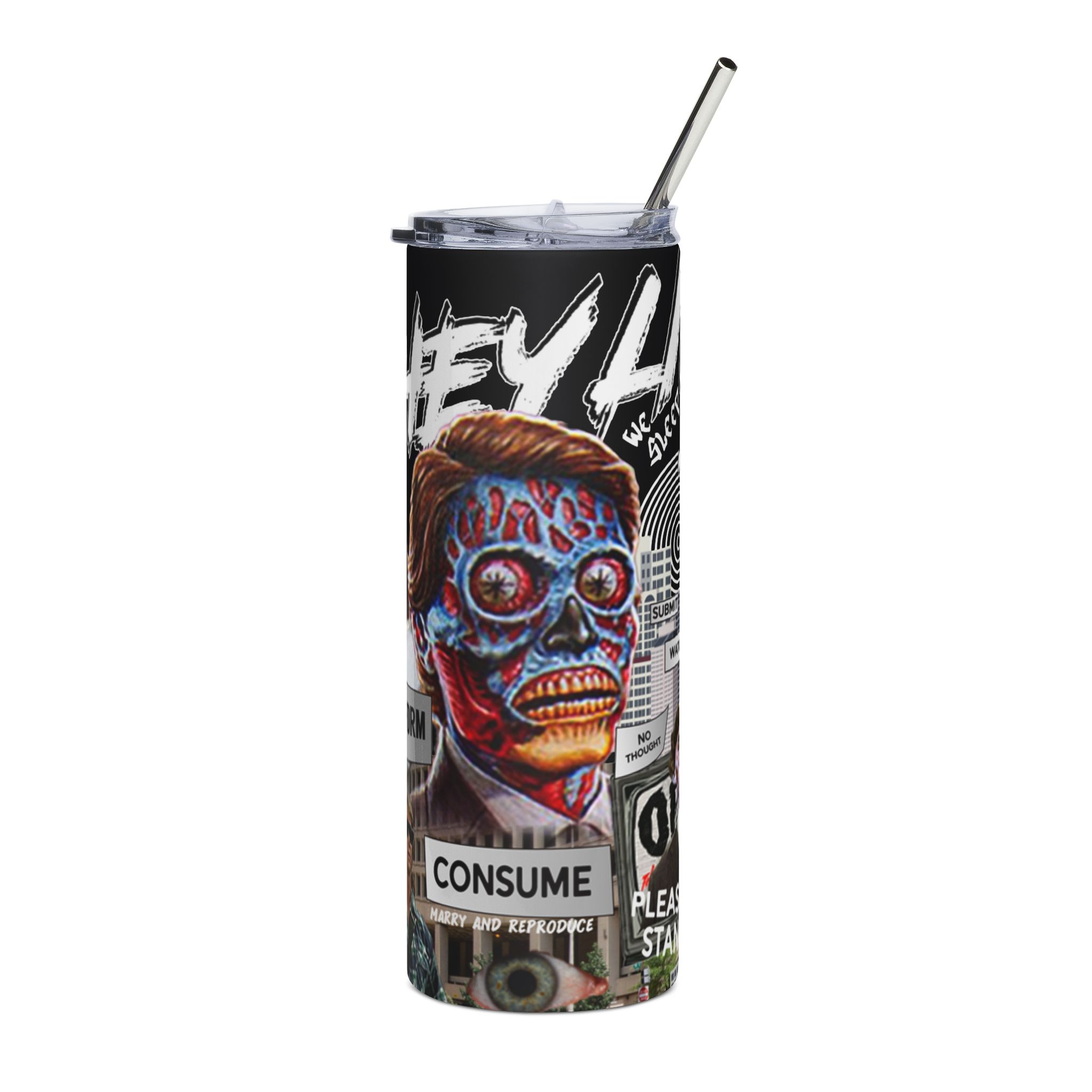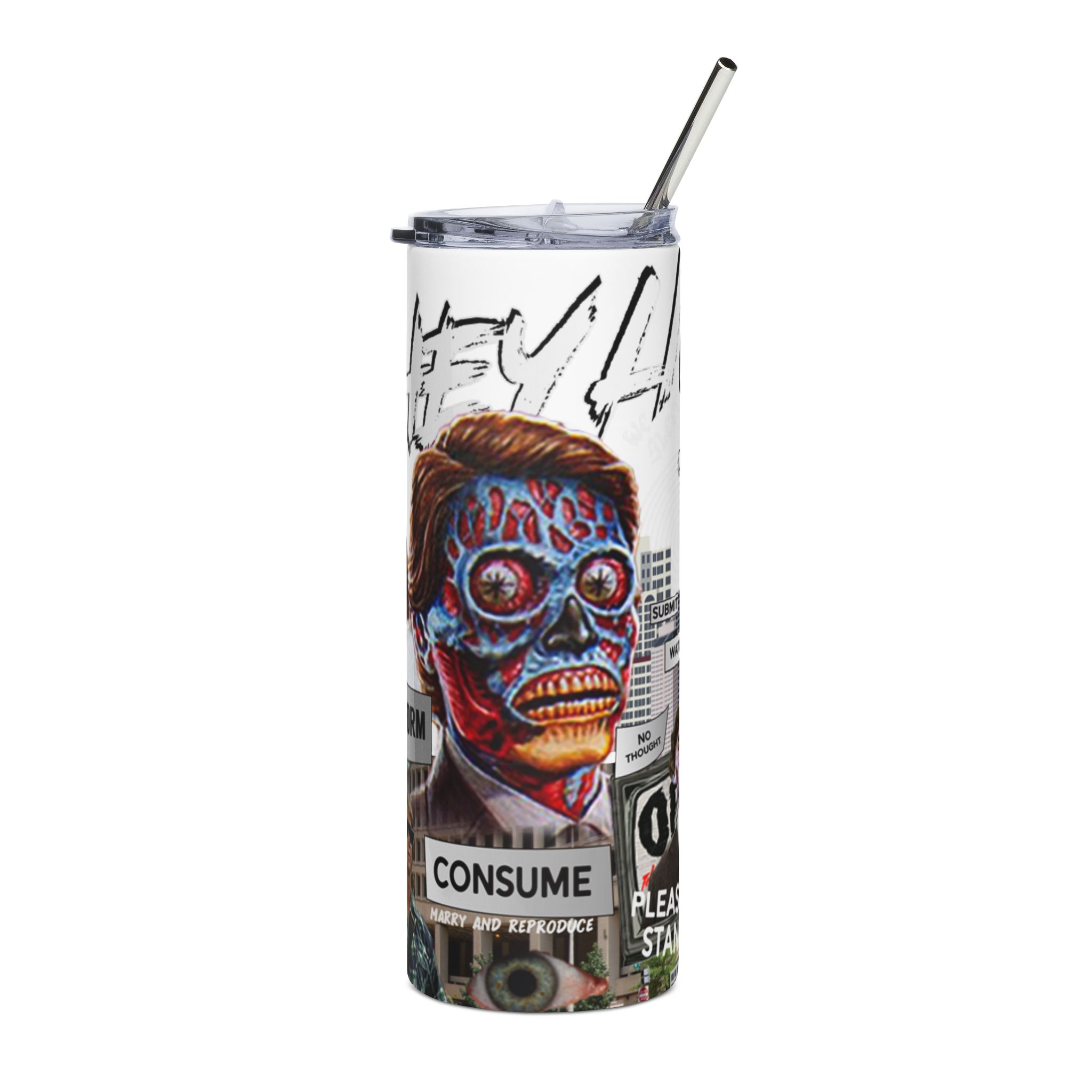 This slim 20 oz stainless steel tumbler carries a rebellious, collage-style design that speaks to fans of cult sci-fi and counterculture art. The tall, cylindrical shape keeps drinks at hand while the clear lid and included metal straw make sipping easy on the go. The artwork wraps fully around the tumbler, blending bold, gritty imagery with text elements that nod to resistance and awareness. Its glossy protective coat keeps the print vivid and adds an eye-catching shine. Durable stainless construction resists rust and everyday wear, making it a reliable companion from commutes to late-night movie marathons.