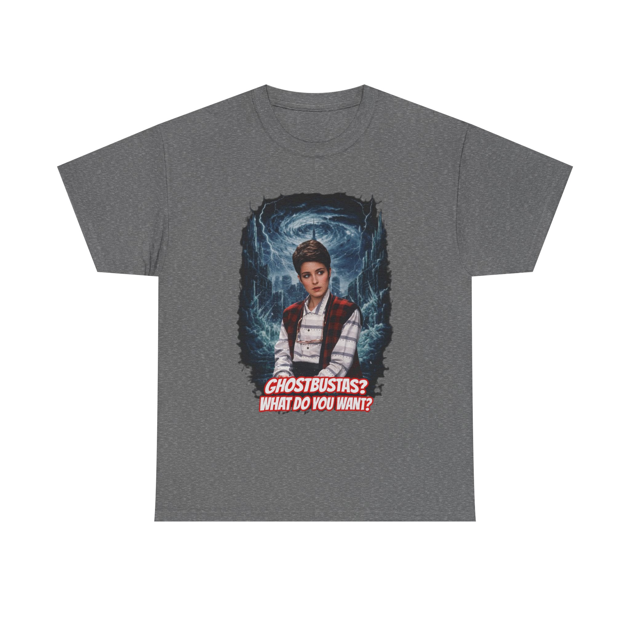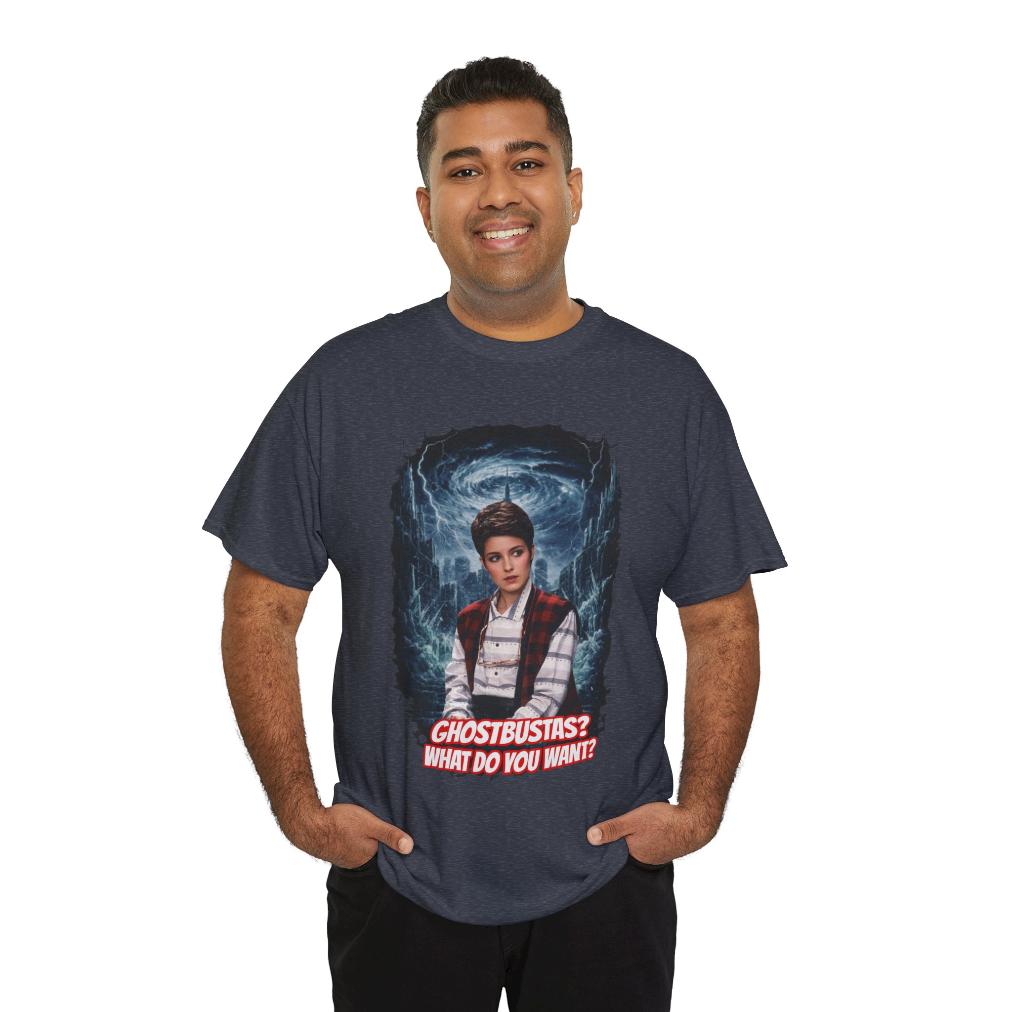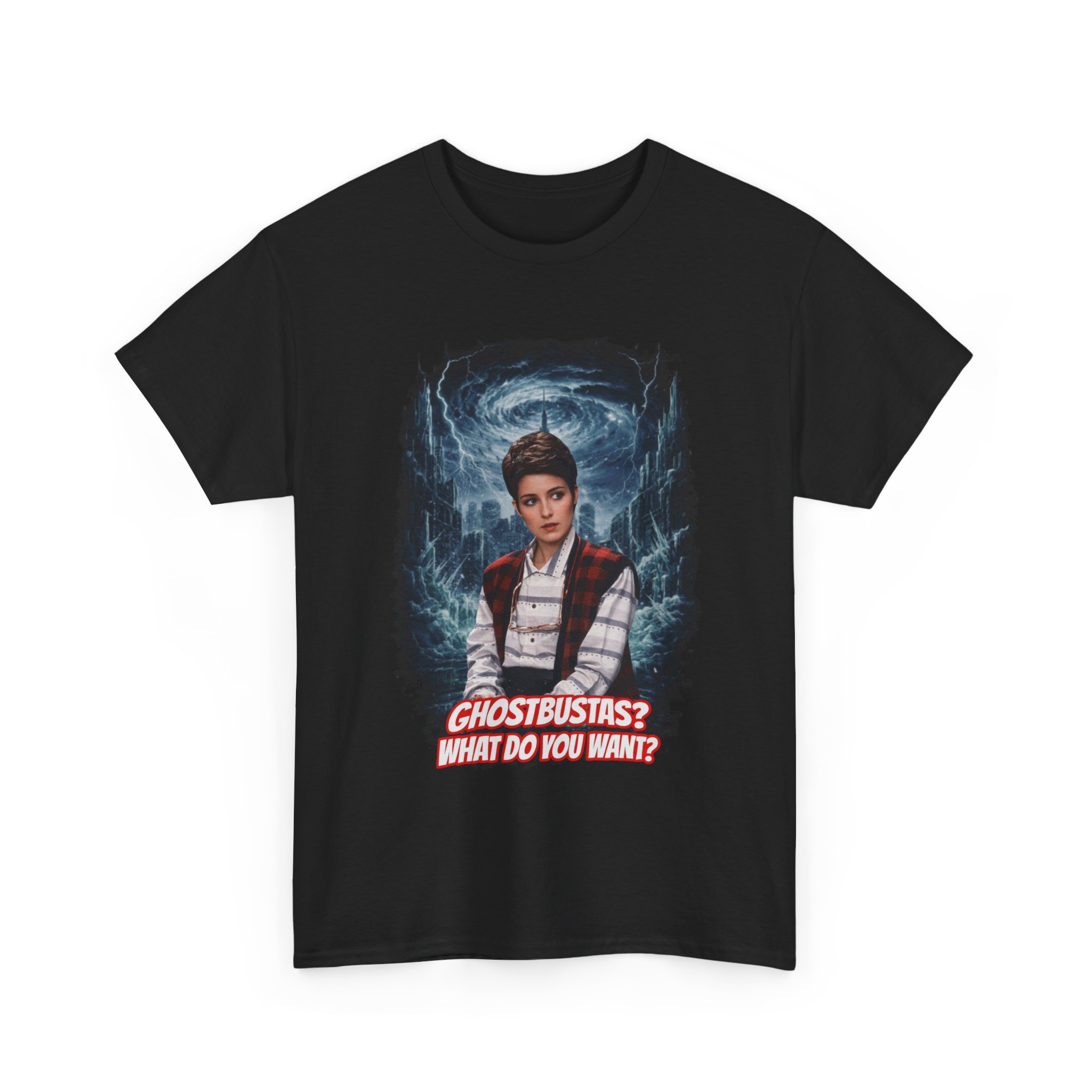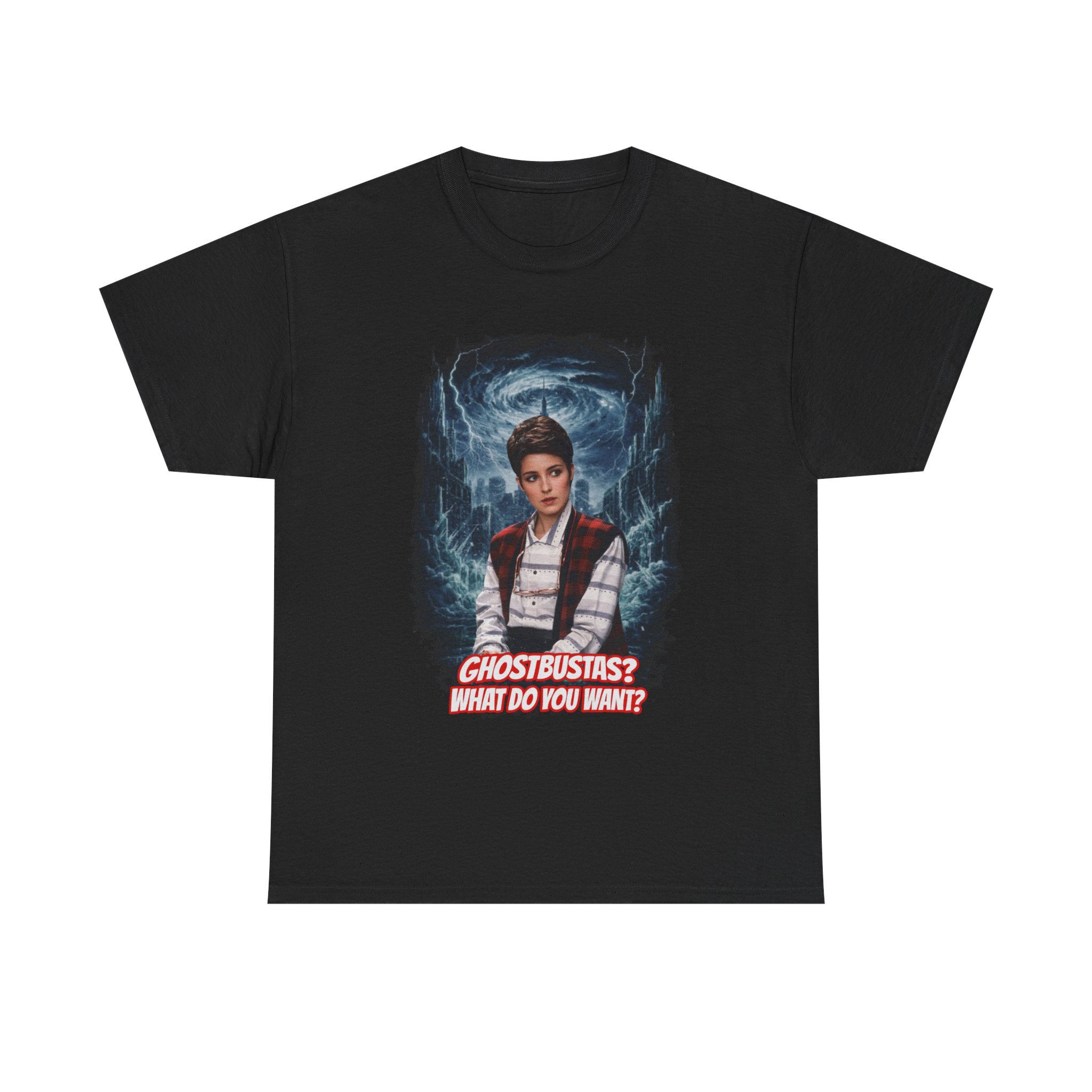 This relaxed, classic-fit tee brings playful paranormal nostalgia to everyday wear. The front features a bold, cinematic illustration of a young hero framed by swirling ghostly energy, paired with cheeky, retro-inspired text that reads “GHOSTBUSTAS? WHAT DO YOU WANT?” Soft, durable cotton and a neat crew neckline make it comfortable enough for lounging, layering, or heading out to fan meet-ups. The slightly vintage print contrasts sharply on dark fabric, giving the artwork a luminous, poster-like quality. It’s a quiet conversation starter for movie nights, conventions, late-night city walks, and casual hangouts with fellow genre fans.