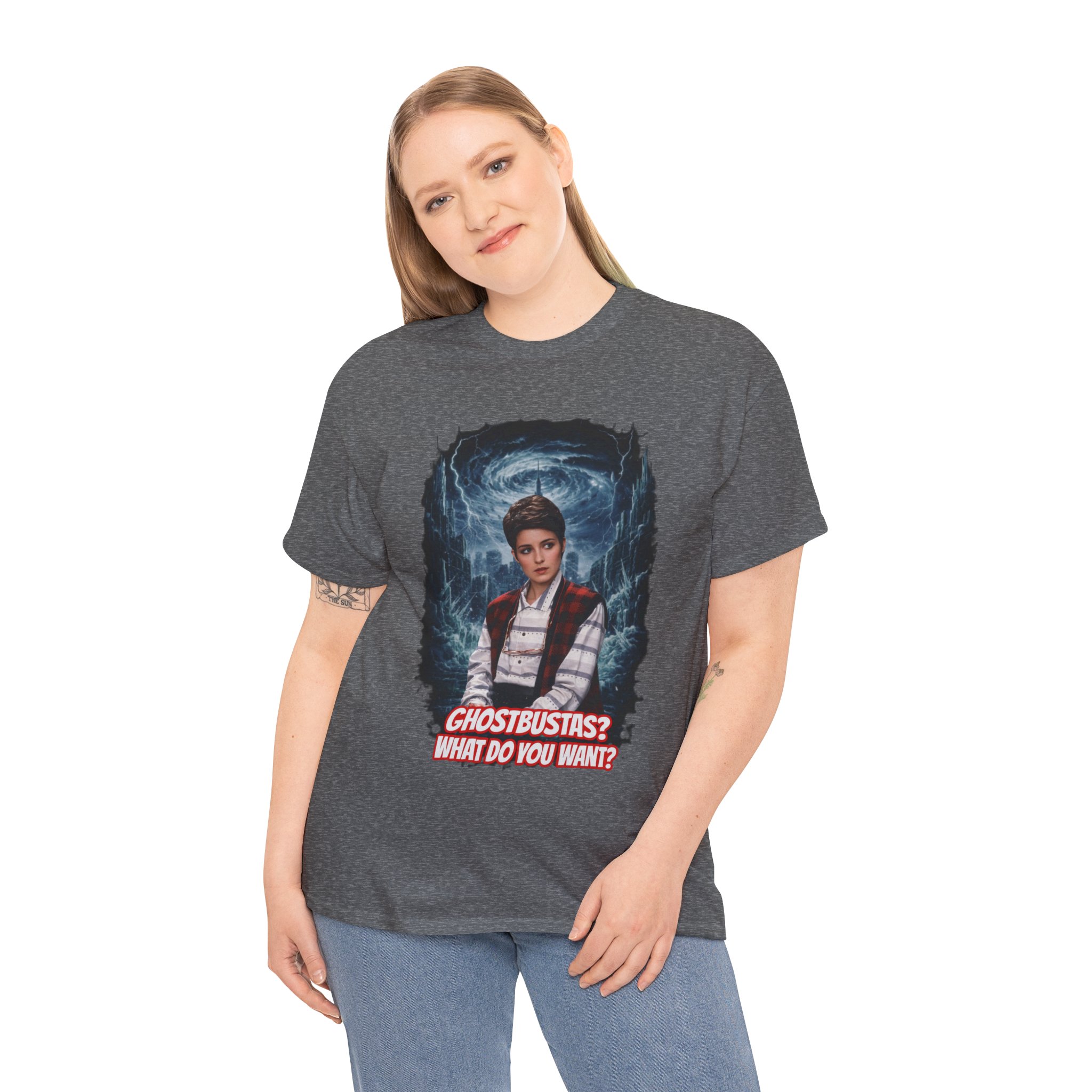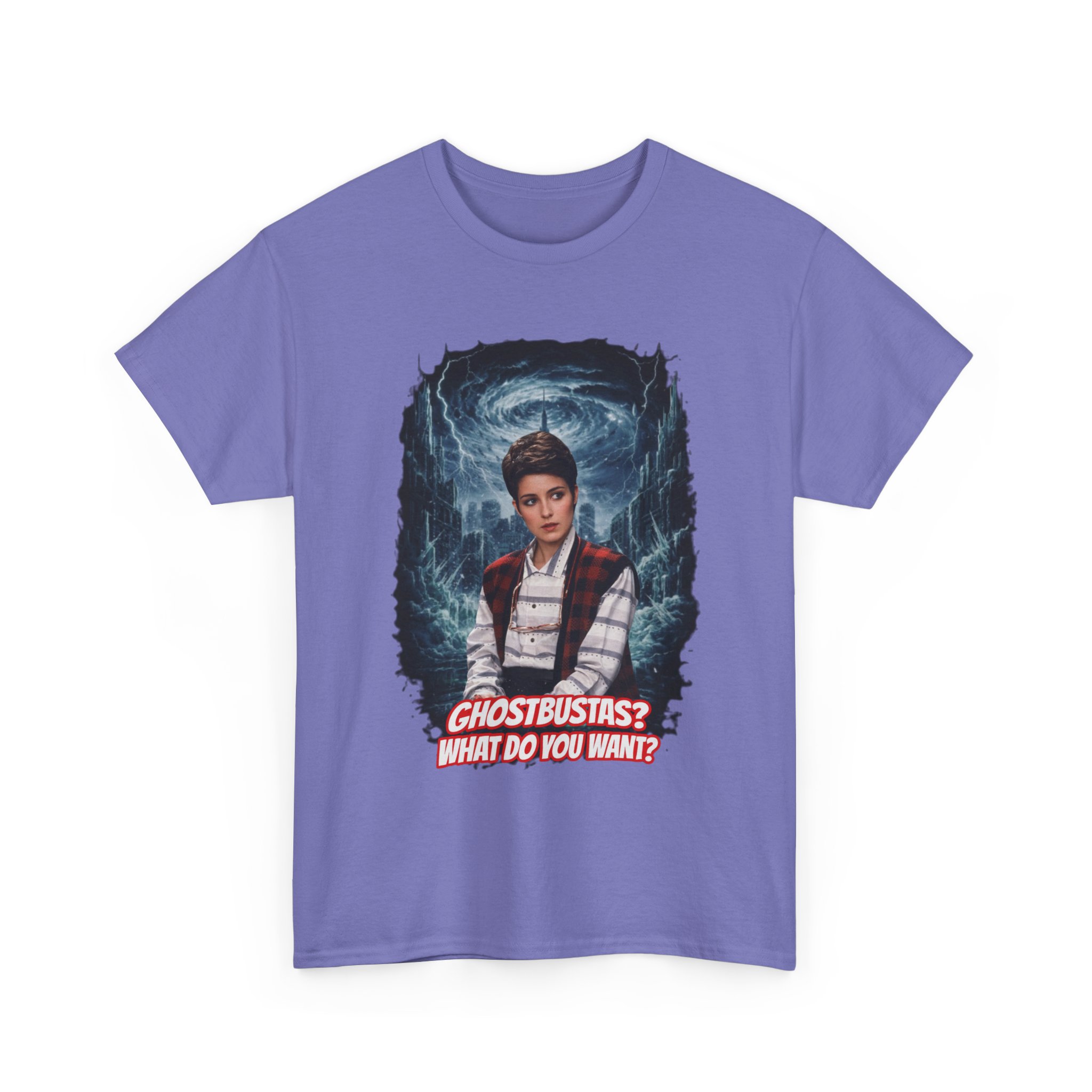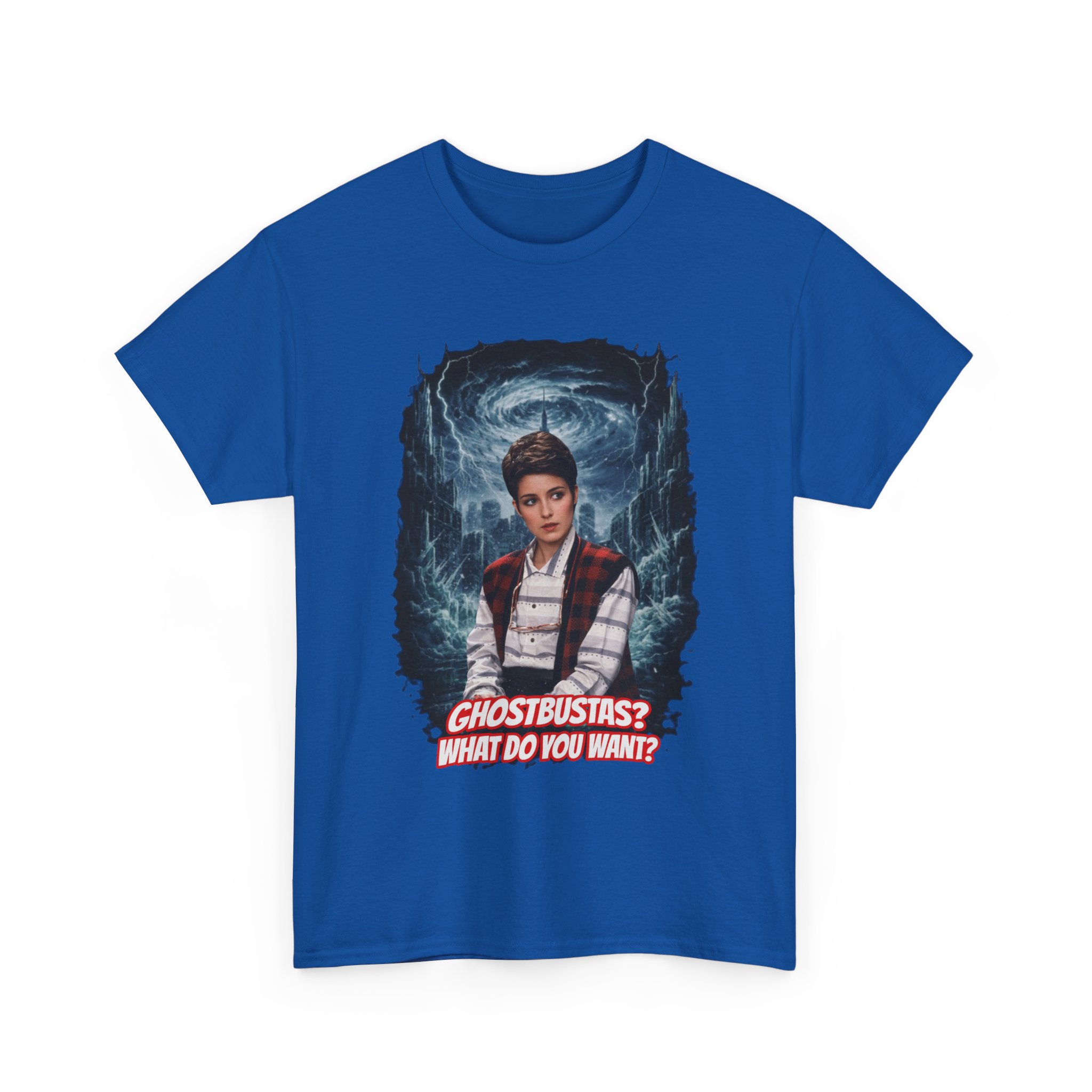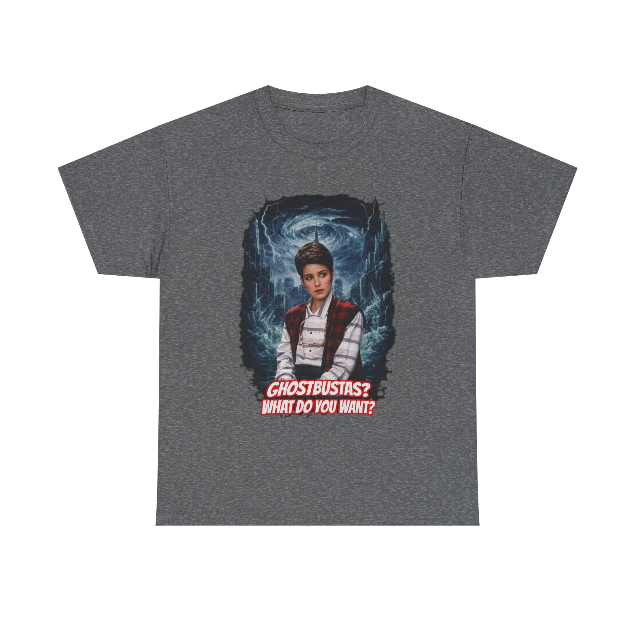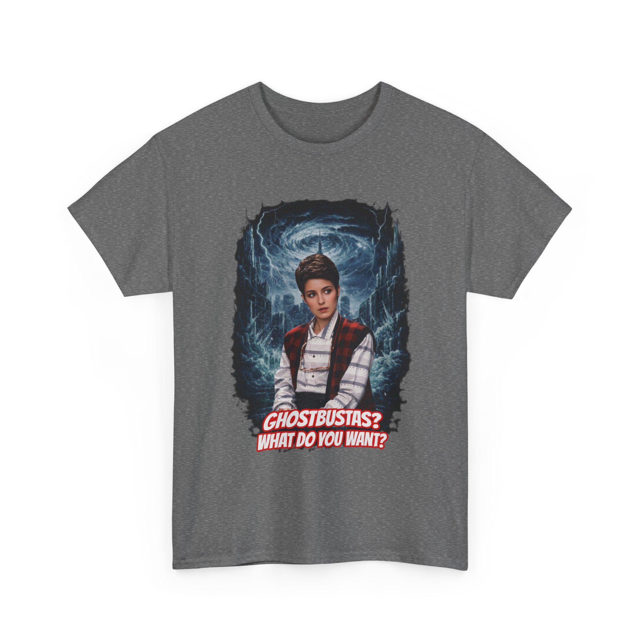 This relaxed, classic-fit tee brings playful paranormal nostalgia to everyday wear. The front features a bold, cinematic illustration of a young hero framed by swirling ghostly energy, paired with cheeky, retro-inspired text that reads “GHOSTBUSTAS? WHAT DO YOU WANT?” Soft, durable cotton and a neat crew neckline make it comfortable enough for lounging, layering, or heading out to fan meet-ups. The slightly vintage print contrasts sharply on dark fabric, giving the artwork a luminous, poster-like quality. It’s a quiet conversation starter for movie nights, conventions, late-night city walks, and casual hangouts with fellow genre fans.