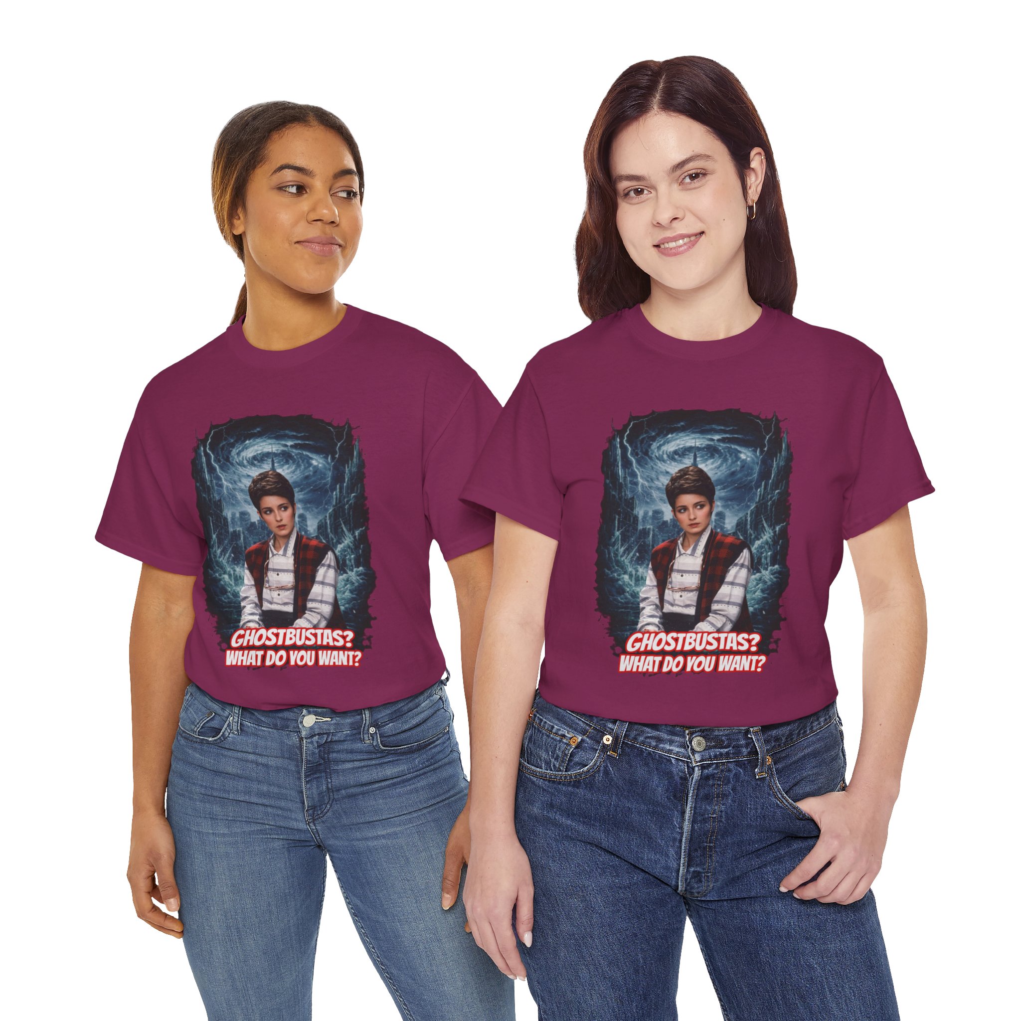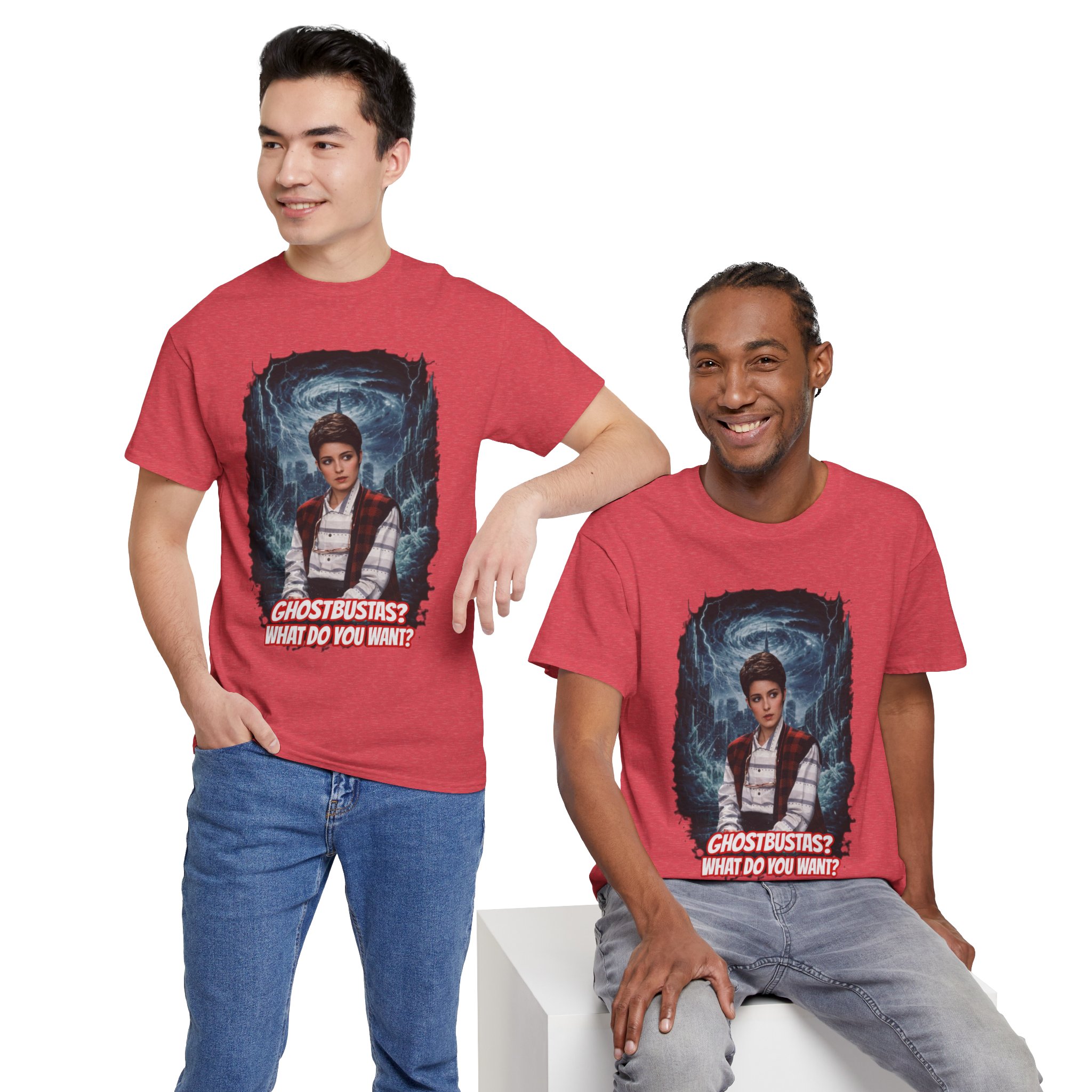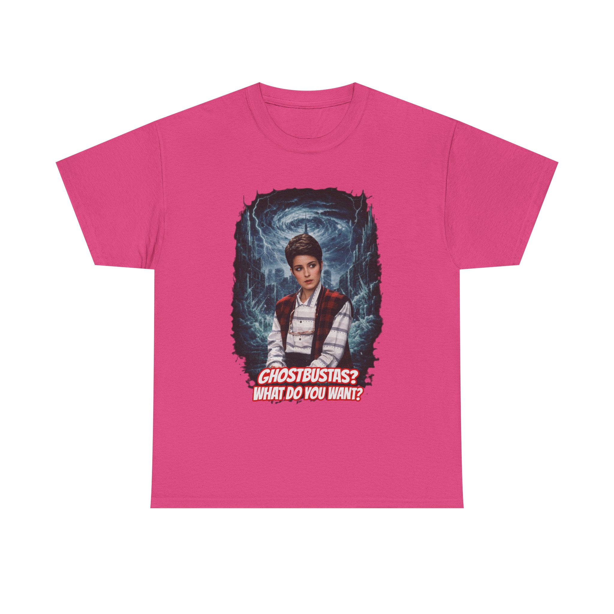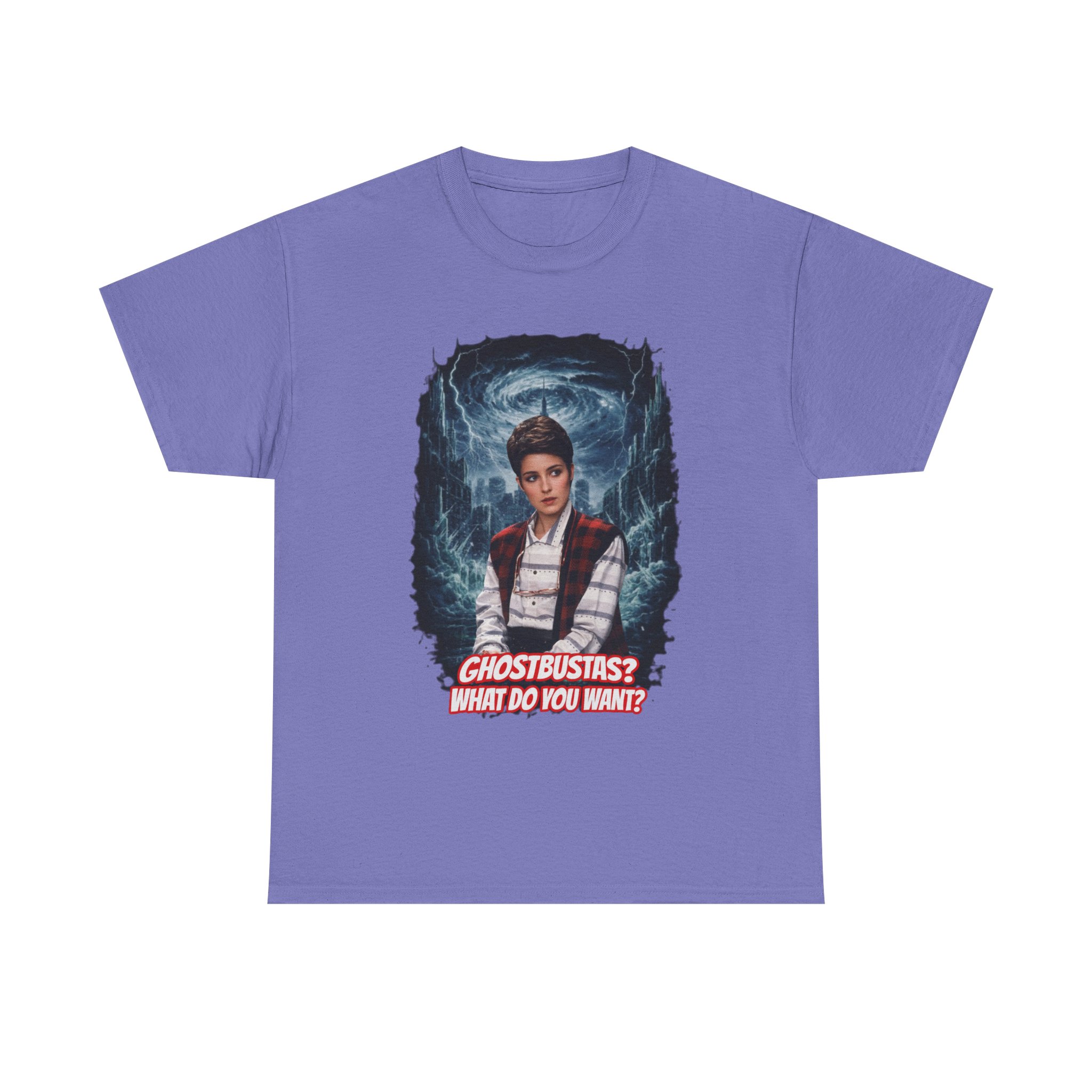 This relaxed, classic-fit tee brings playful paranormal nostalgia to everyday wear. The front features a bold, cinematic illustration of a young hero framed by swirling ghostly energy, paired with cheeky, retro-inspired text that reads “GHOSTBUSTAS? WHAT DO YOU WANT?” Soft, durable cotton and a neat crew neckline make it comfortable enough for lounging, layering, or heading out to fan meet-ups. The slightly vintage print contrasts sharply on dark fabric, giving the artwork a luminous, poster-like quality. It’s a quiet conversation starter for movie nights, conventions, late-night city walks, and casual hangouts with fellow genre fans.