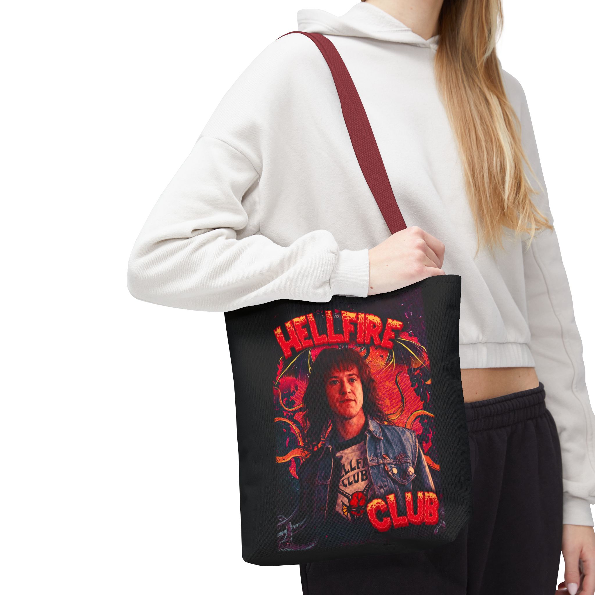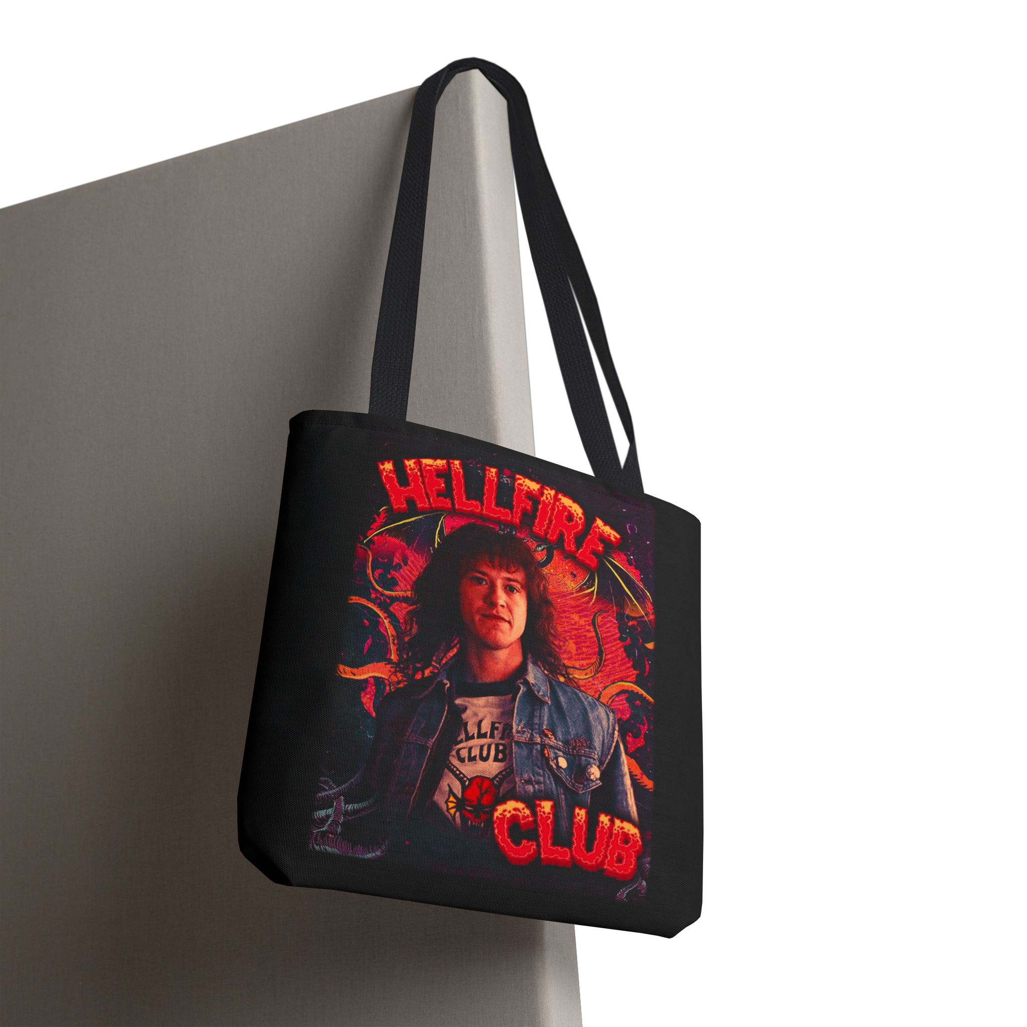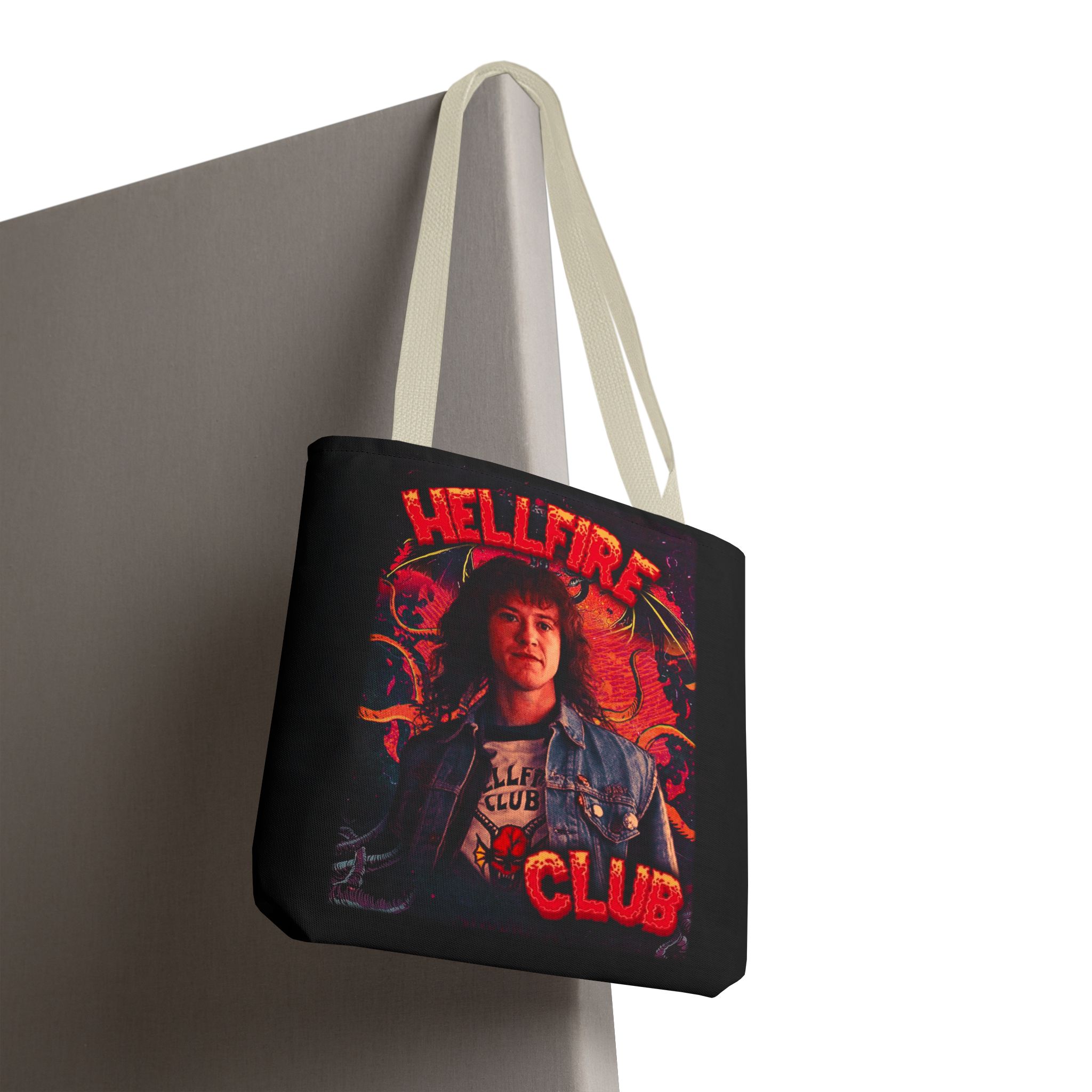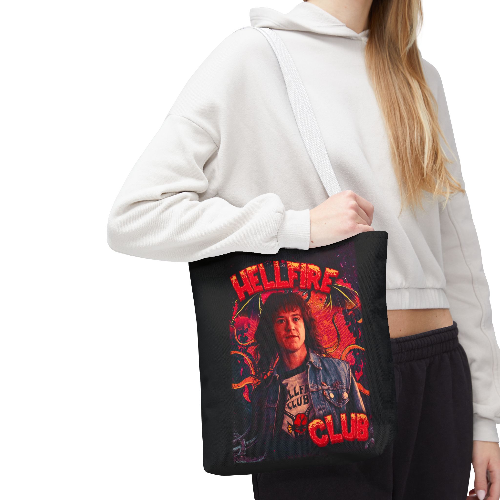 This durable polyester tote carries attitude and nostalgia in equal measure. Bold, high-contrast artwork wraps the front panel — an edgy portrait set against flaming graphic elements with the words “HELLFIRE CLUB” in vintage rocker lettering. The roomy boxed-corner silhouette gives structure and holds shape, while reinforced handle stitching and a laminated interior keep daily wear and spills from slowing you down. Whether you’re headed to a record shop, comic con, or a weekend market, it slips over the shoulder and keeps essentials within reach without losing its rebellious charm.