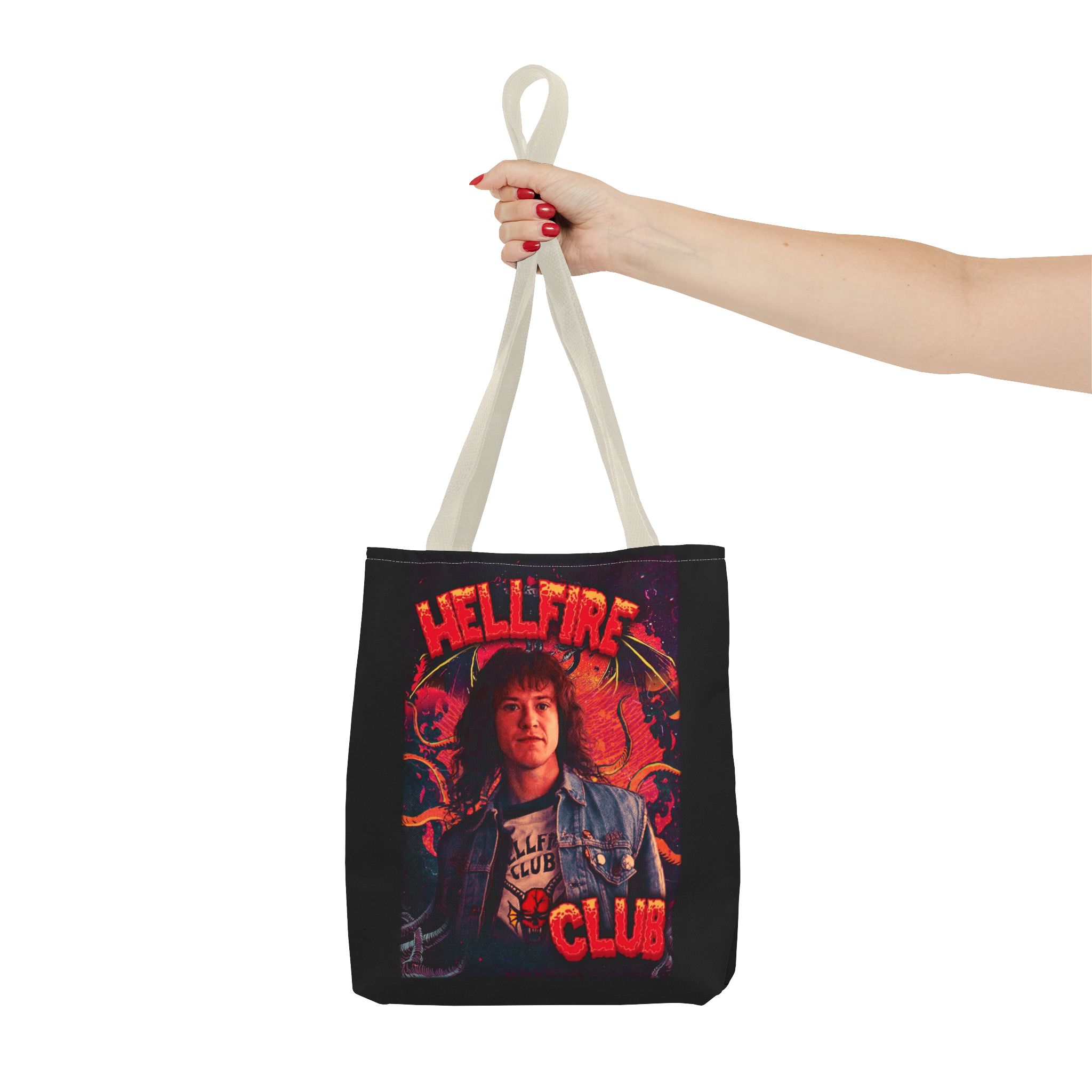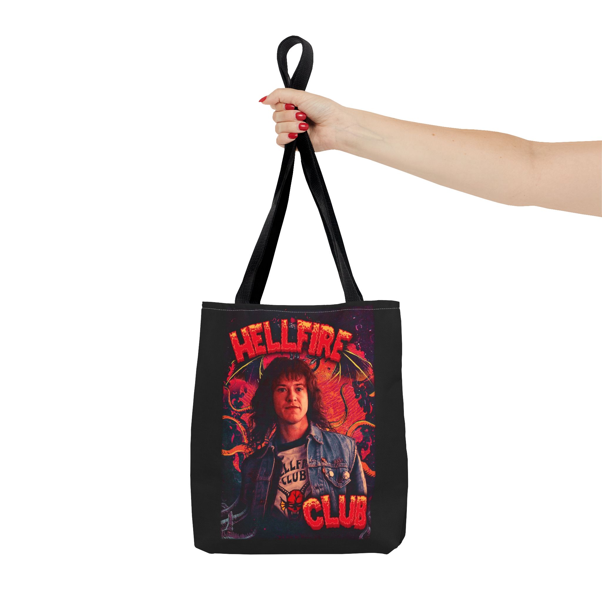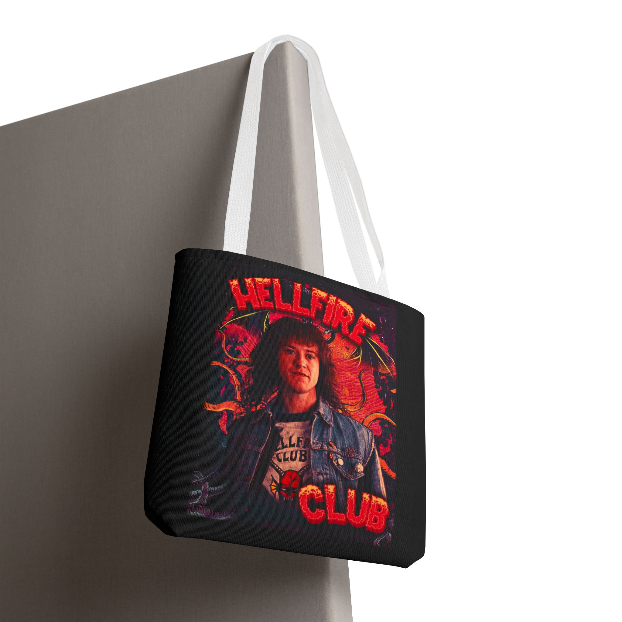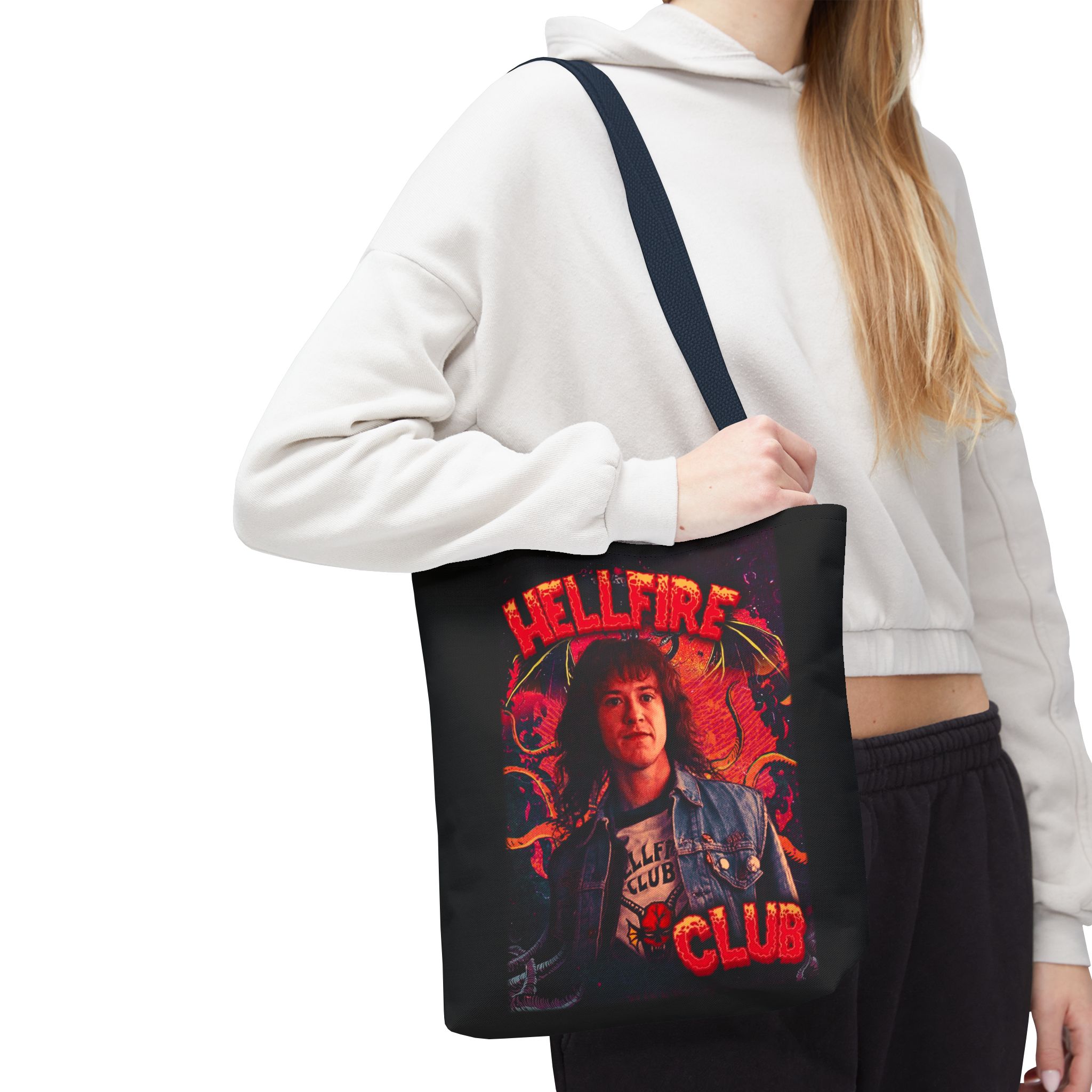 This durable polyester tote carries attitude and nostalgia in equal measure. Bold, high-contrast artwork wraps the front panel — an edgy portrait set against flaming graphic elements with the words “HELLFIRE CLUB” in vintage rocker lettering. The roomy boxed-corner silhouette gives structure and holds shape, while reinforced handle stitching and a laminated interior keep daily wear and spills from slowing you down. Whether you’re headed to a record shop, comic con, or a weekend market, it slips over the shoulder and keeps essentials within reach without losing its rebellious charm.