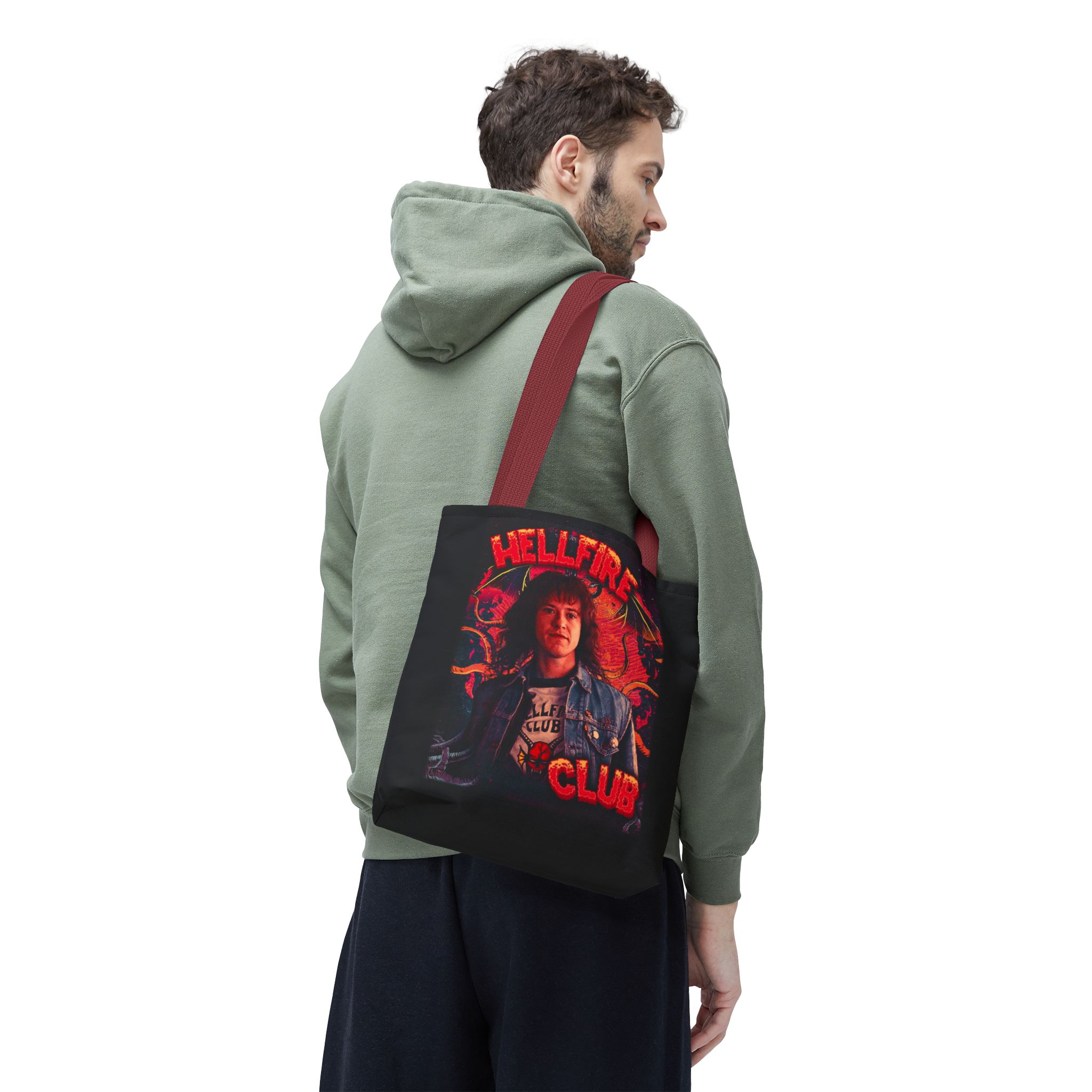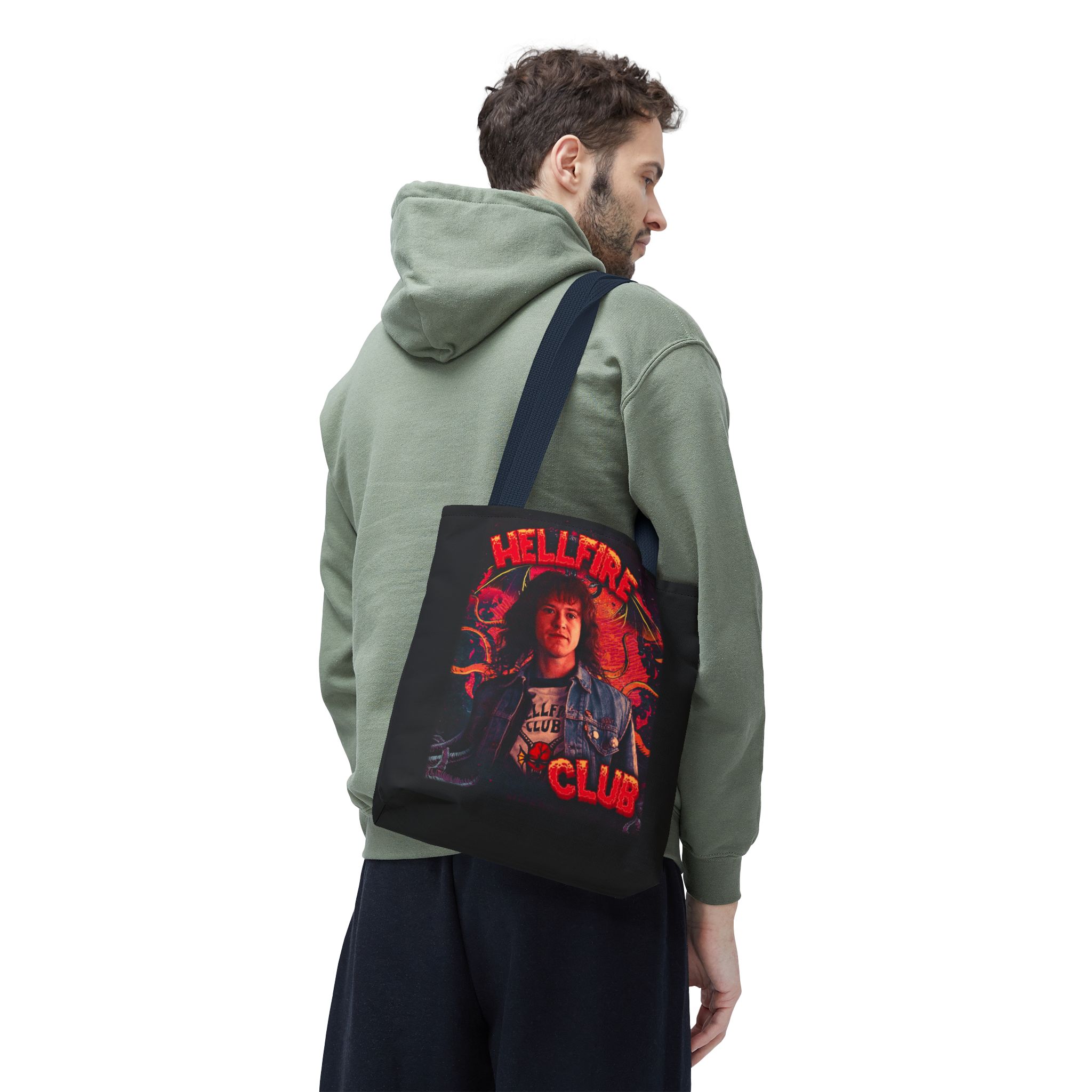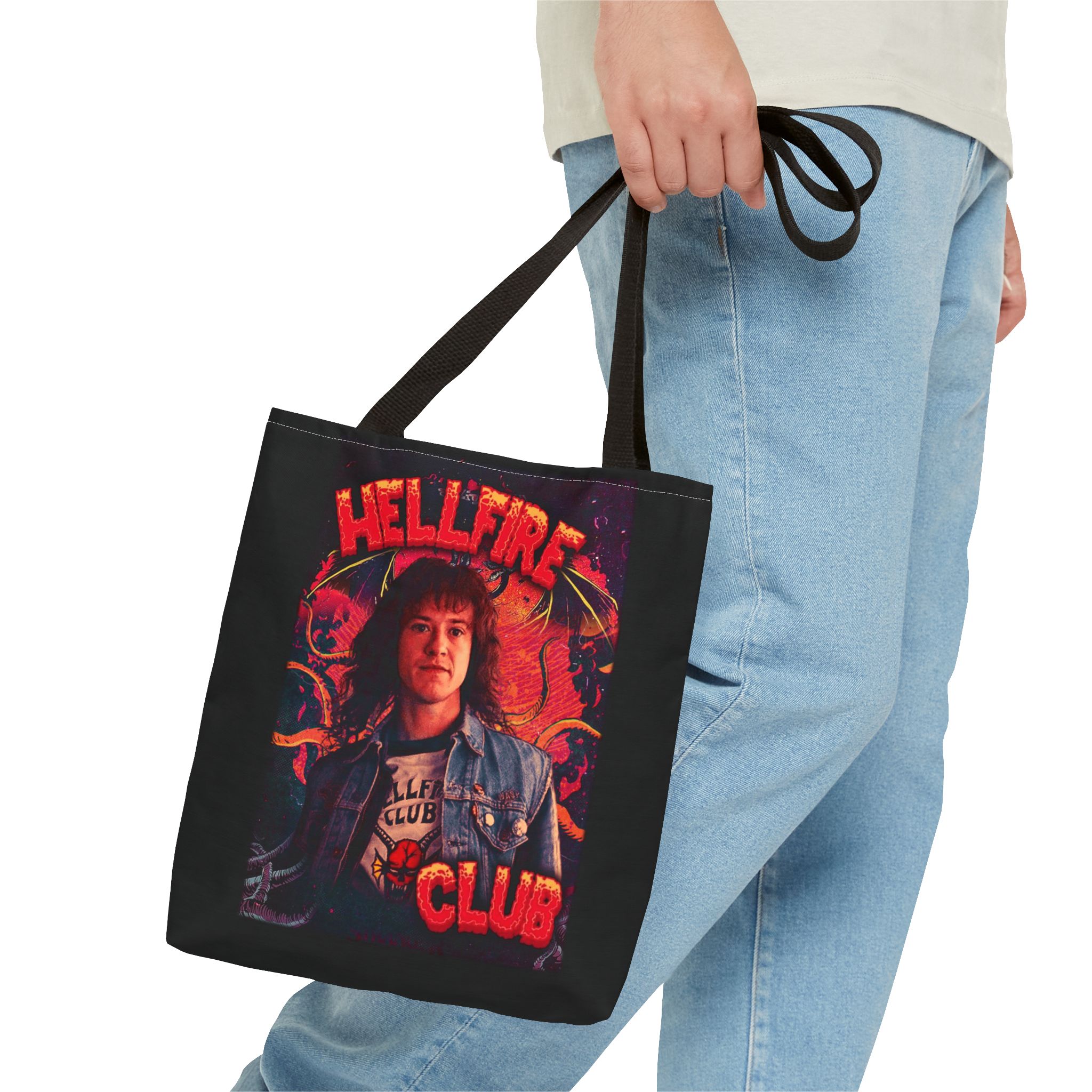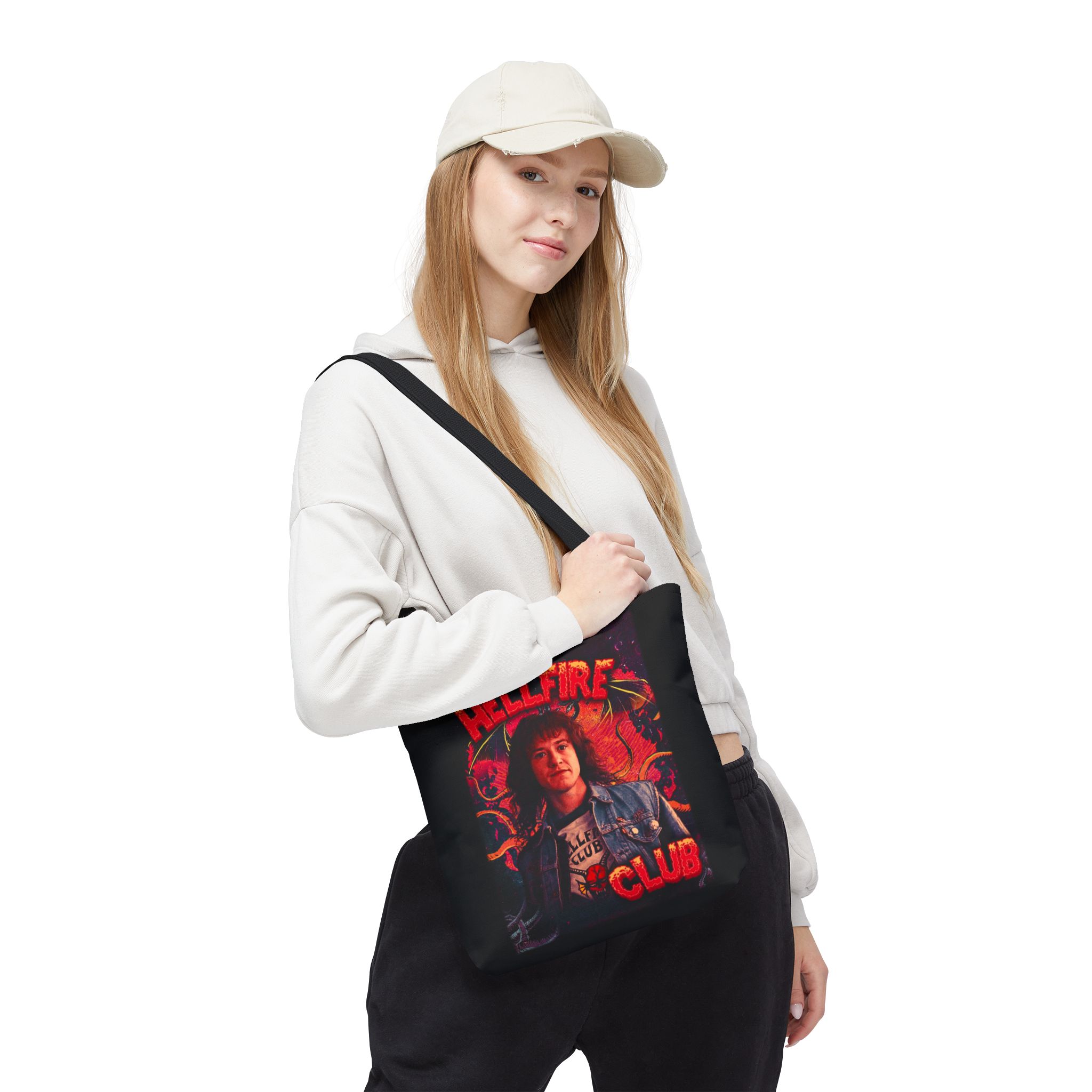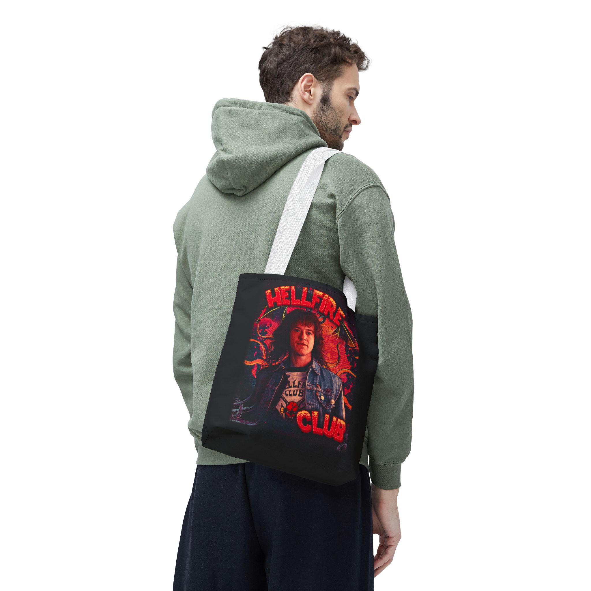 This durable polyester tote carries attitude and nostalgia in equal measure. Bold, high-contrast artwork wraps the front panel — an edgy portrait set against flaming graphic elements with the words “HELLFIRE CLUB” in vintage rocker lettering. The roomy boxed-corner silhouette gives structure and holds shape, while reinforced handle stitching and a laminated interior keep daily wear and spills from slowing you down. Whether you’re headed to a record shop, comic con, or a weekend market, it slips over the shoulder and keeps essentials within reach without losing its rebellious charm.