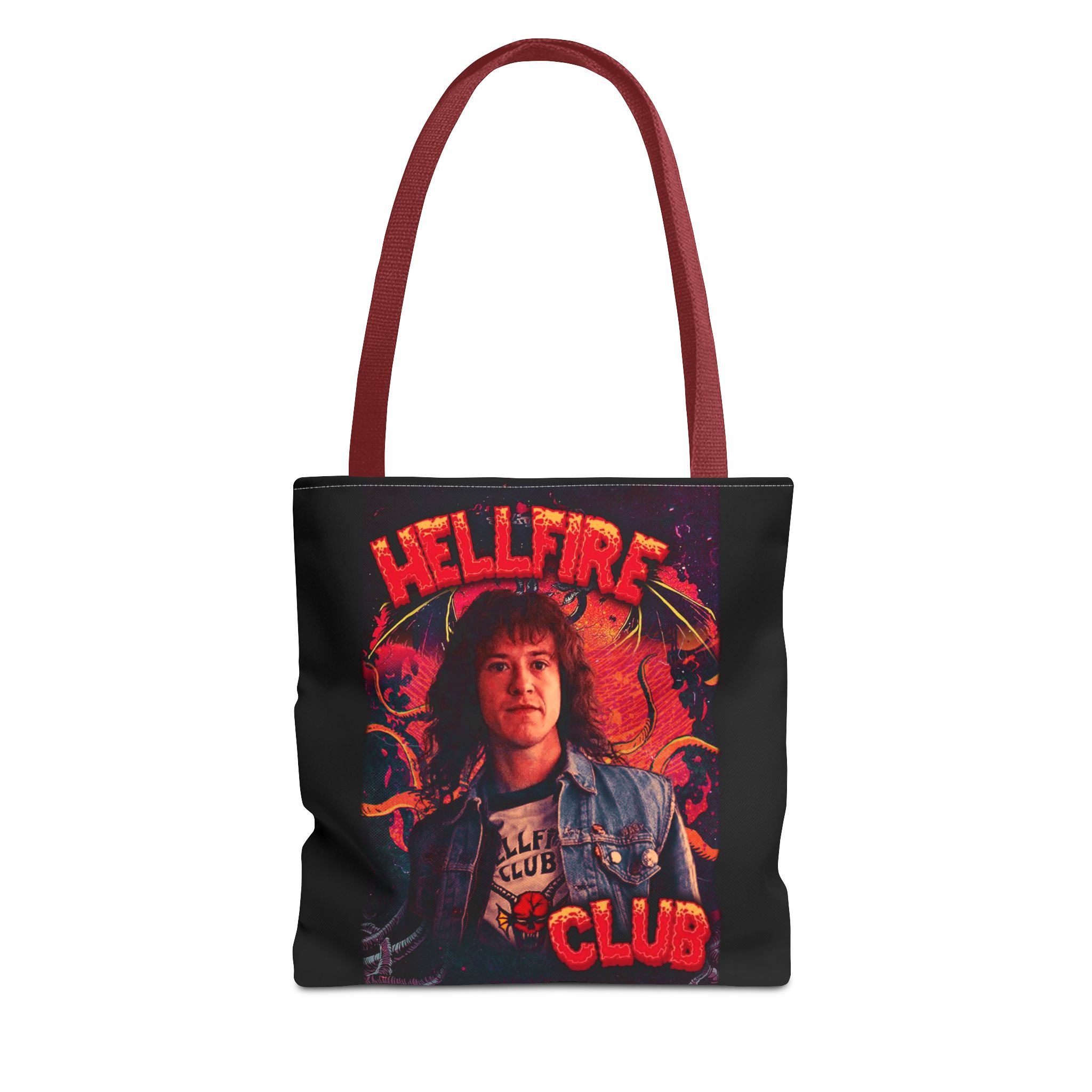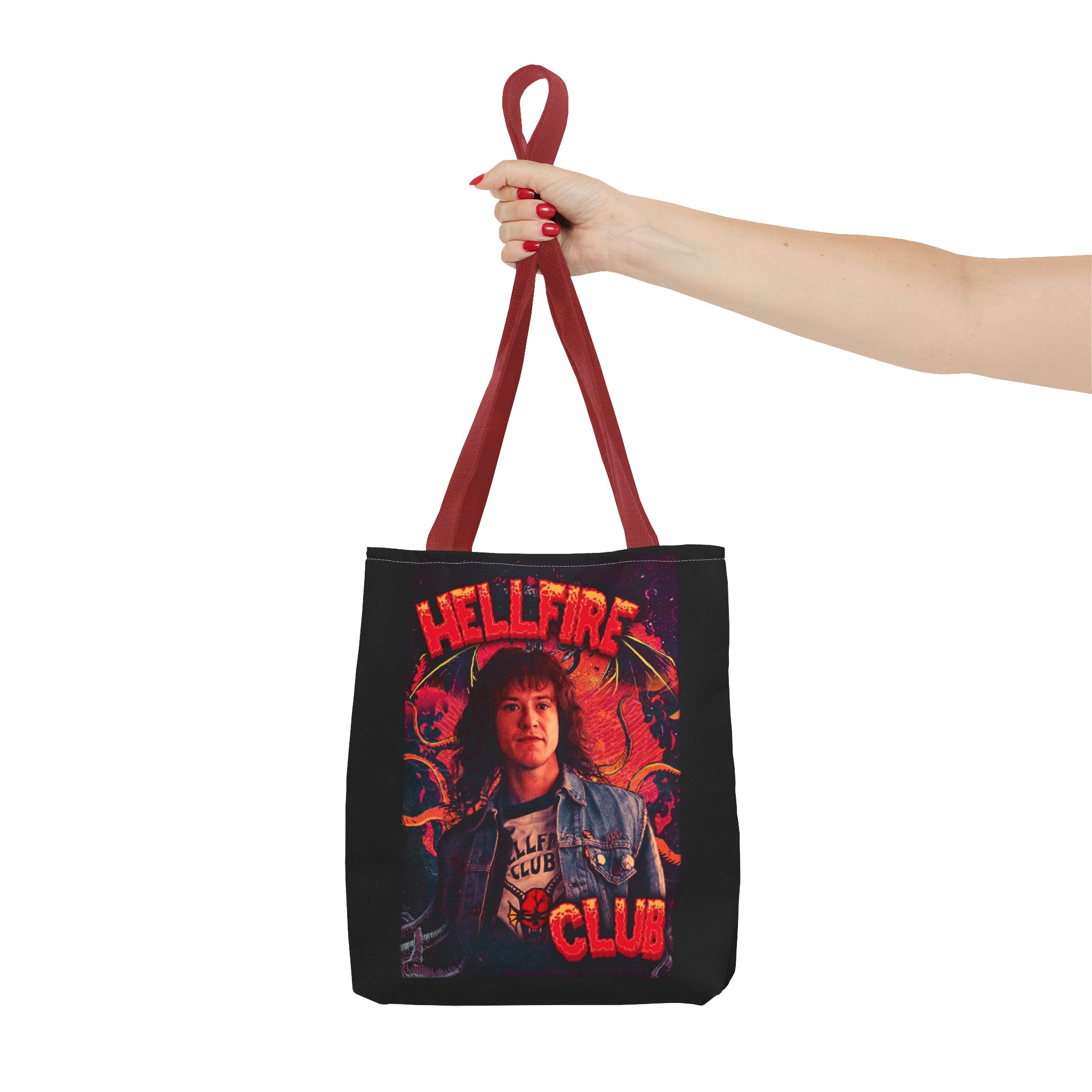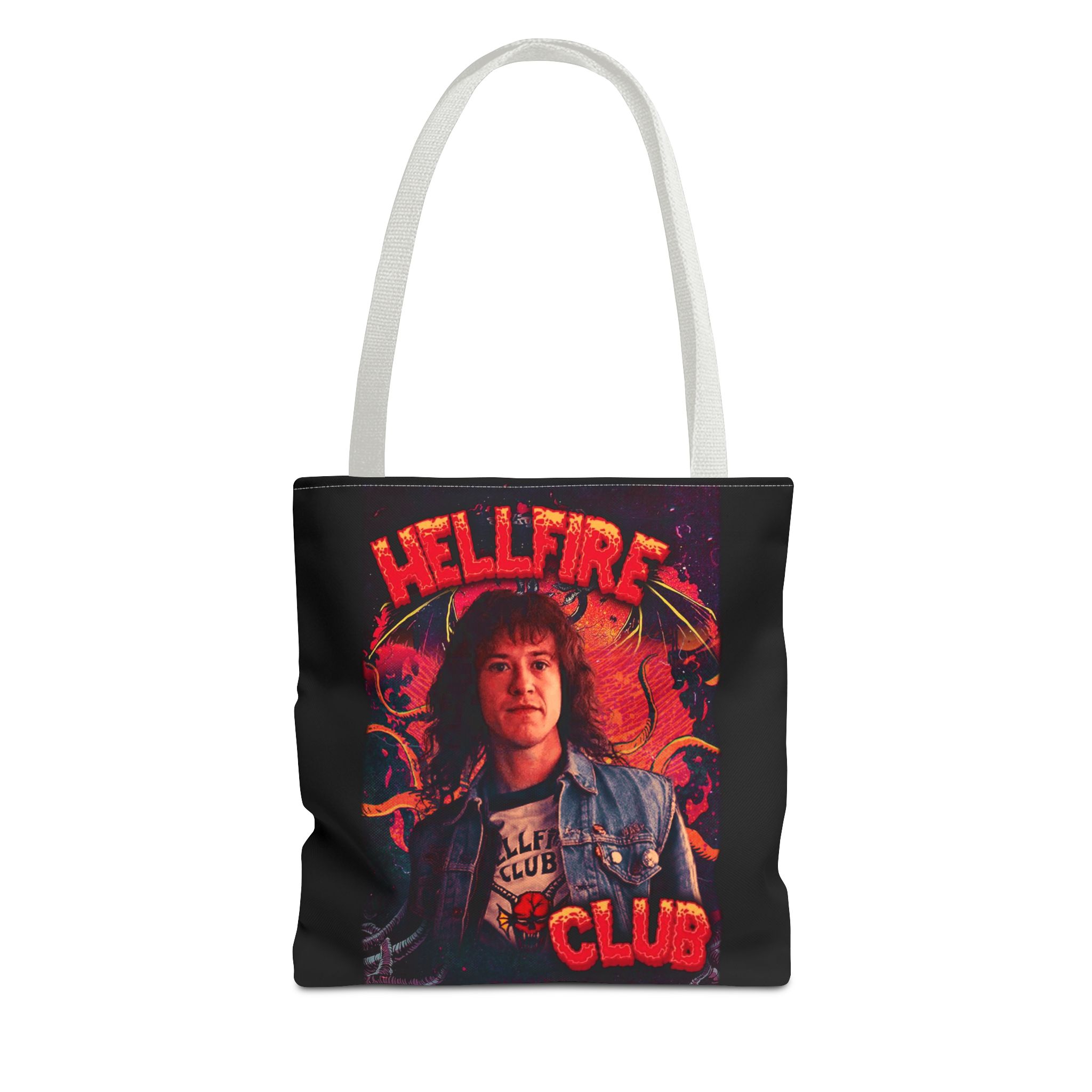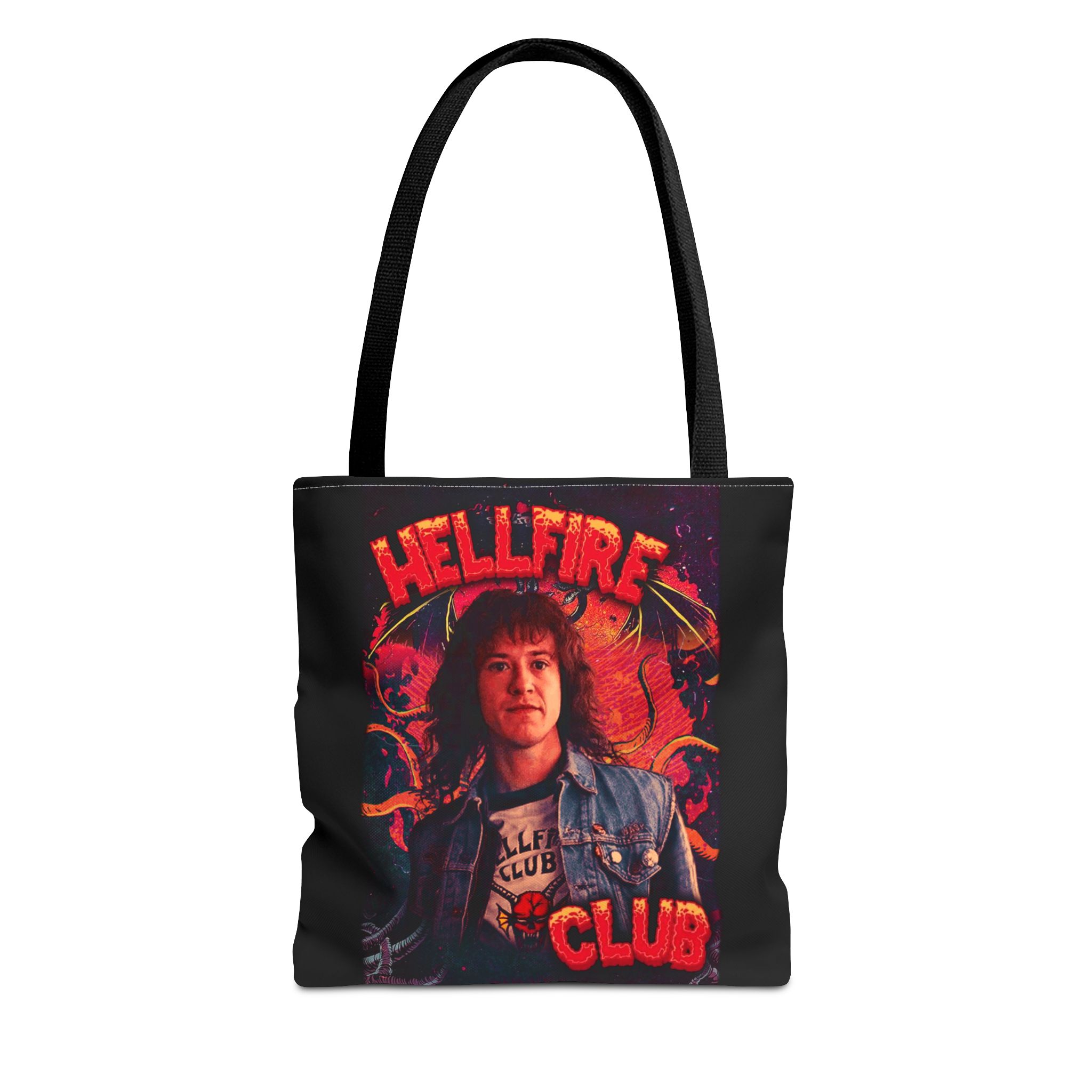 This durable polyester tote carries attitude and nostalgia in equal measure. Bold, high-contrast artwork wraps the front panel — an edgy portrait set against flaming graphic elements with the words “HELLFIRE CLUB” in vintage rocker lettering. The roomy boxed-corner silhouette gives structure and holds shape, while reinforced handle stitching and a laminated interior keep daily wear and spills from slowing you down. Whether you’re headed to a record shop, comic con, or a weekend market, it slips over the shoulder and keeps essentials within reach without losing its rebellious charm.