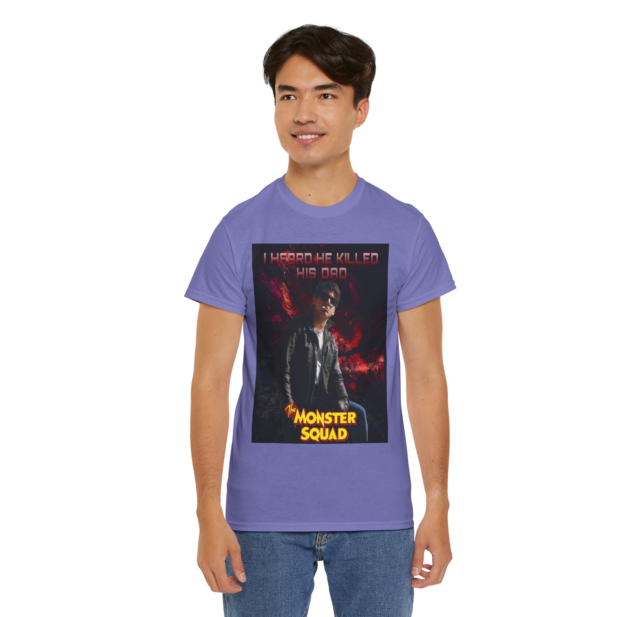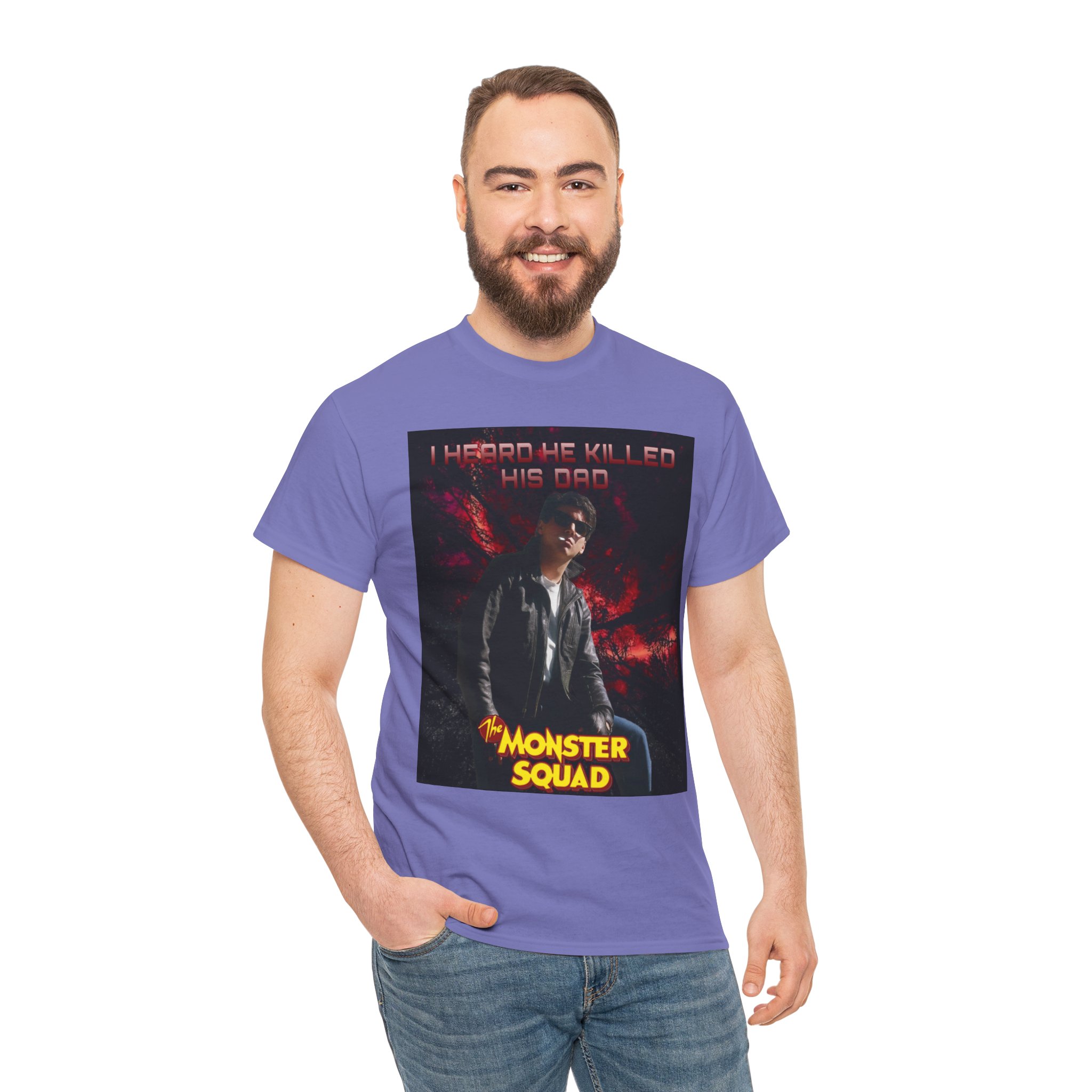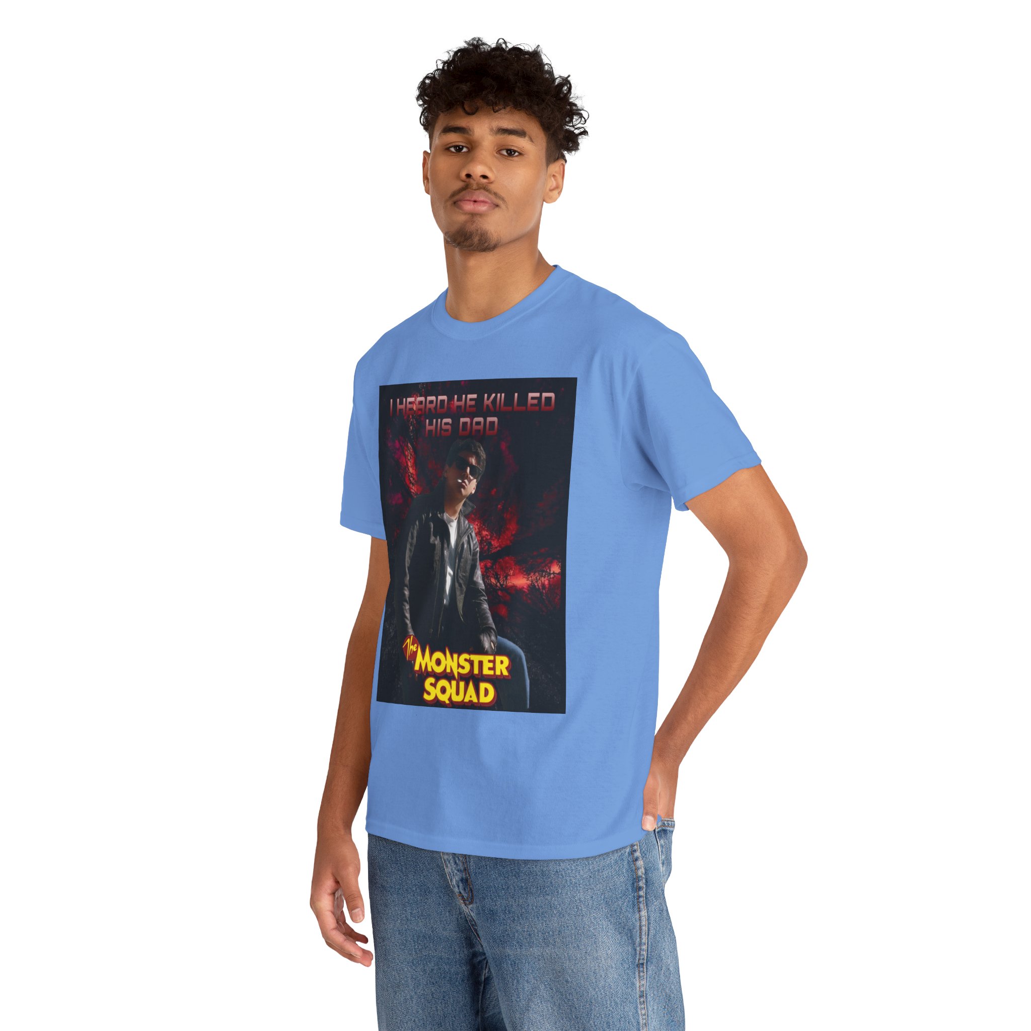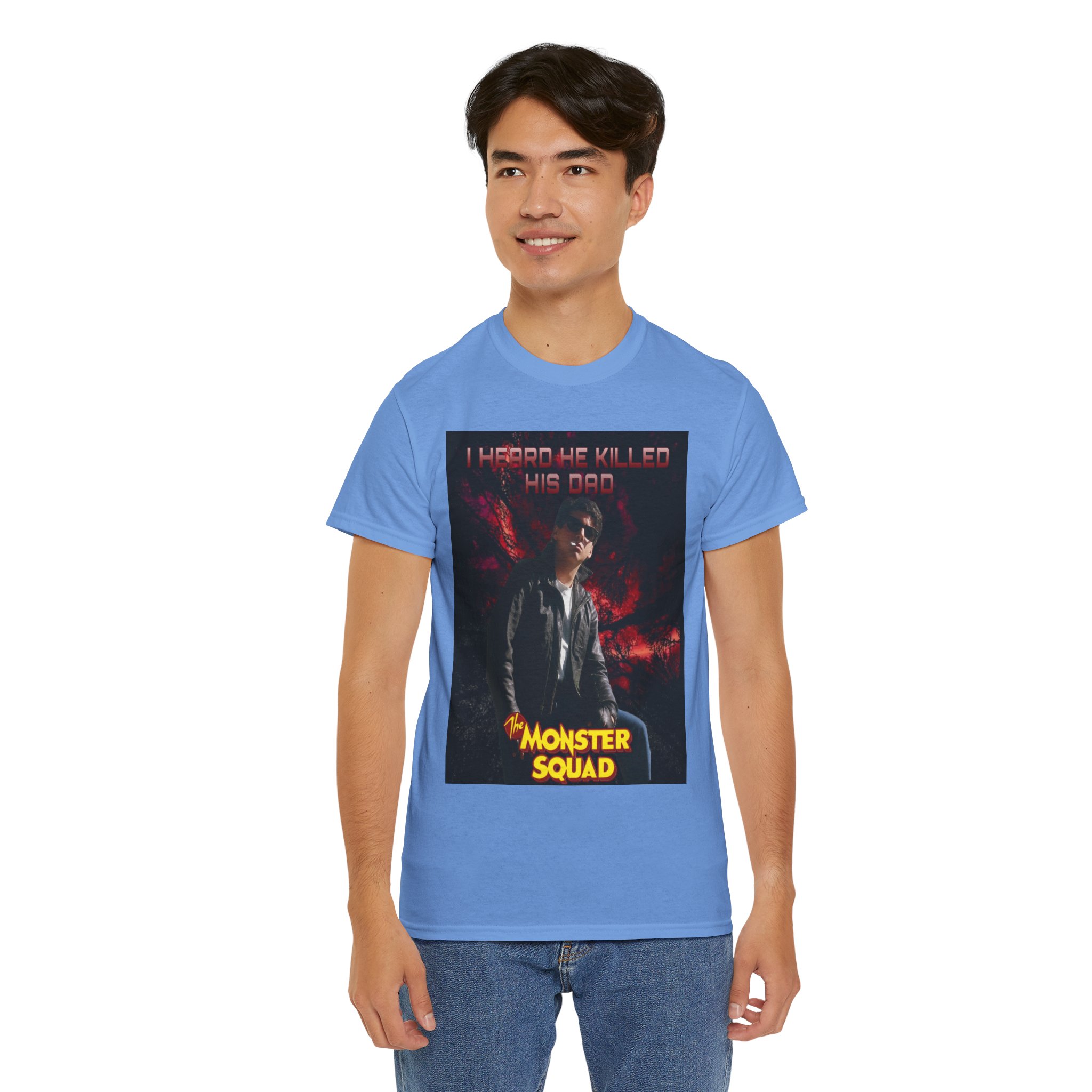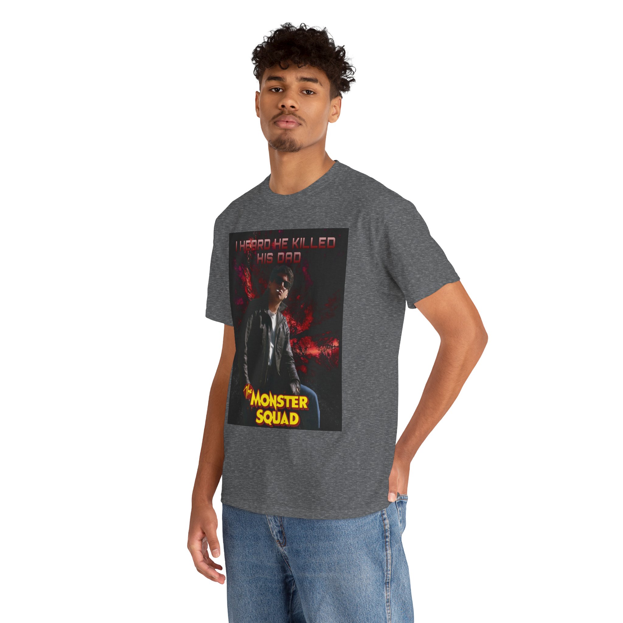 This classic black tee wears like a midnight scene from a cult horror poster — gritty, nostalgic, and a little dangerous. The front graphic layers a lone figure against burning red clouds with bold, retro lettering reading “The Monster Squad,” giving the shirt a vintage-movie vibe that leans into fandom and offbeat style. Lightweight but sturdy, it drapes with a relaxed fit so you can wear it to late-night screenings, conventions, or when you just want to lean into spooky season energy. The simple back keeps the focus on the striking front artwork, letting the design speak for itself.