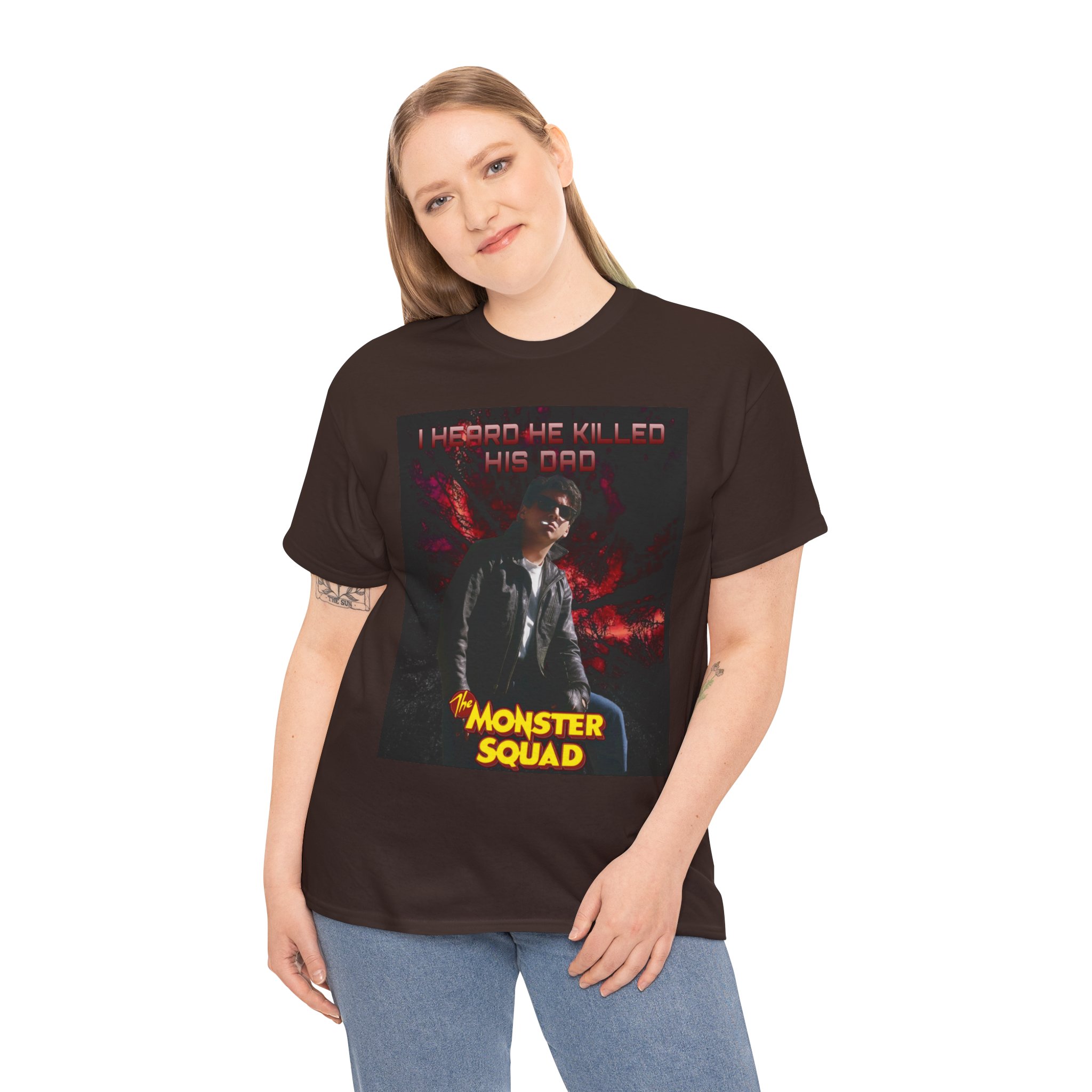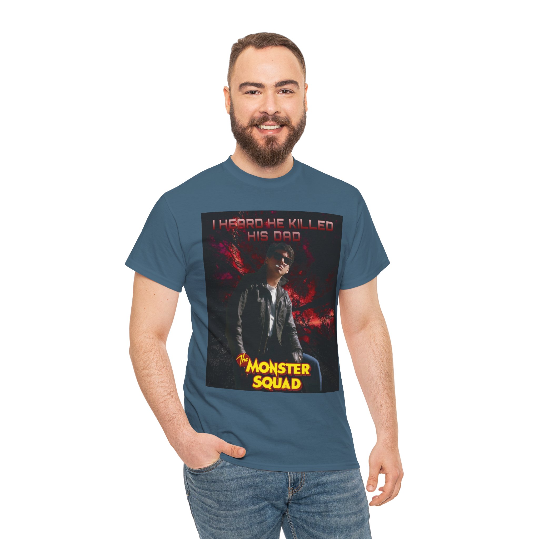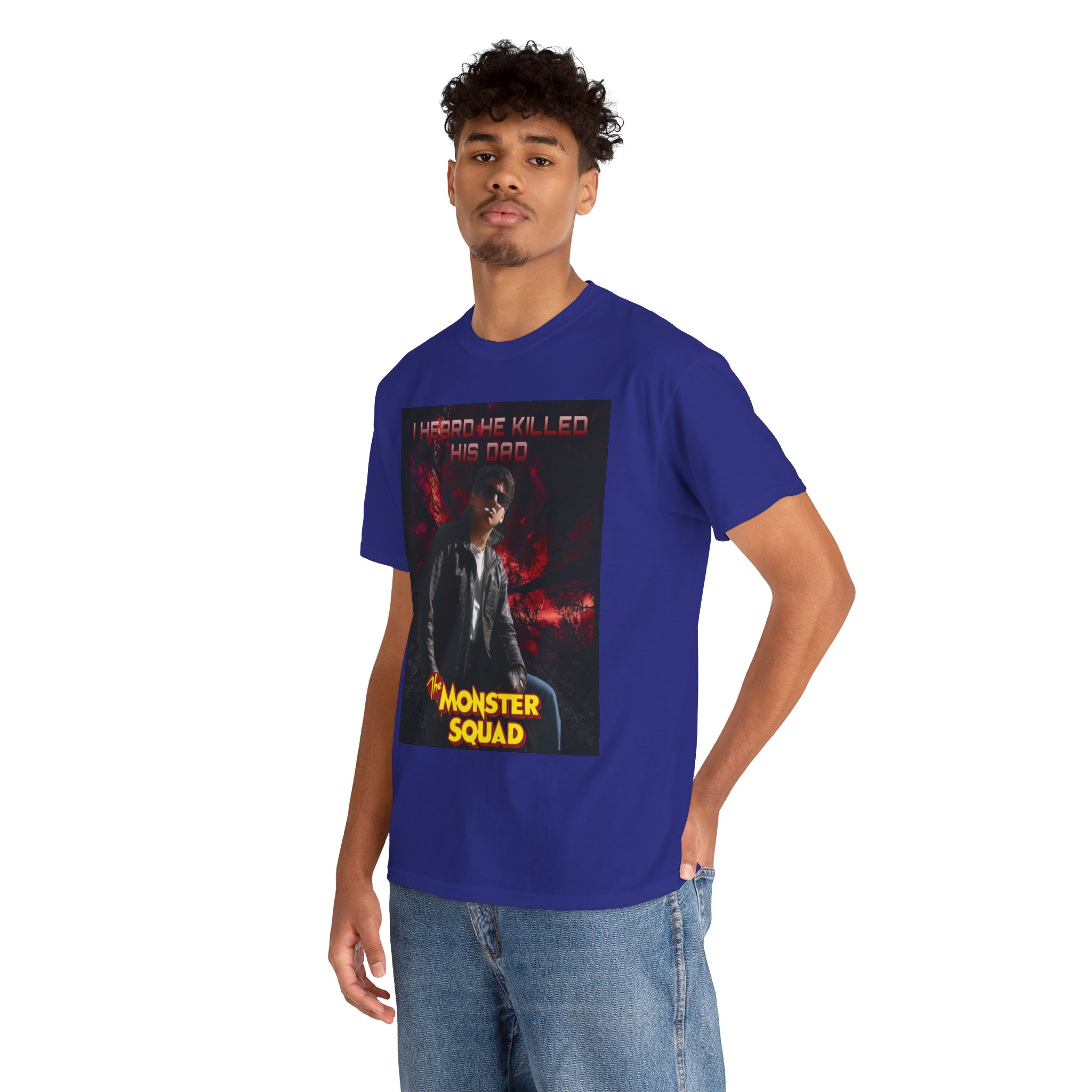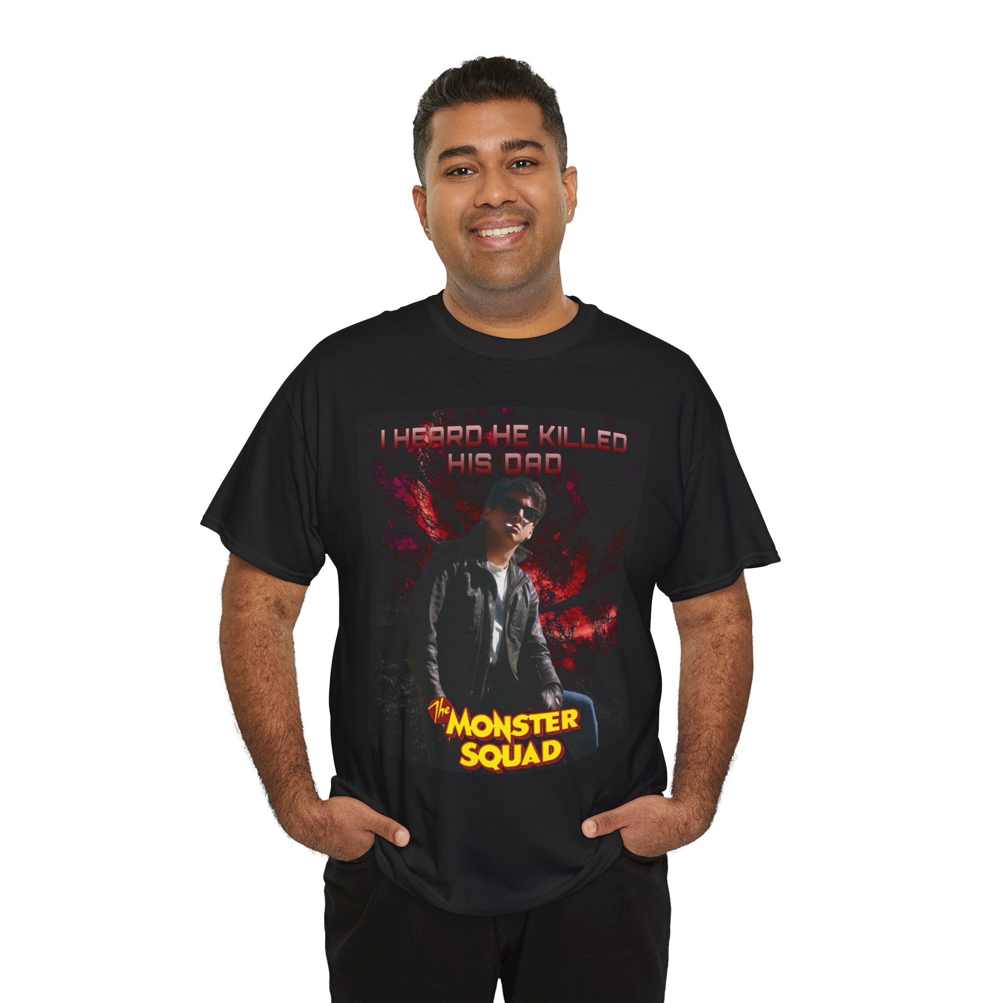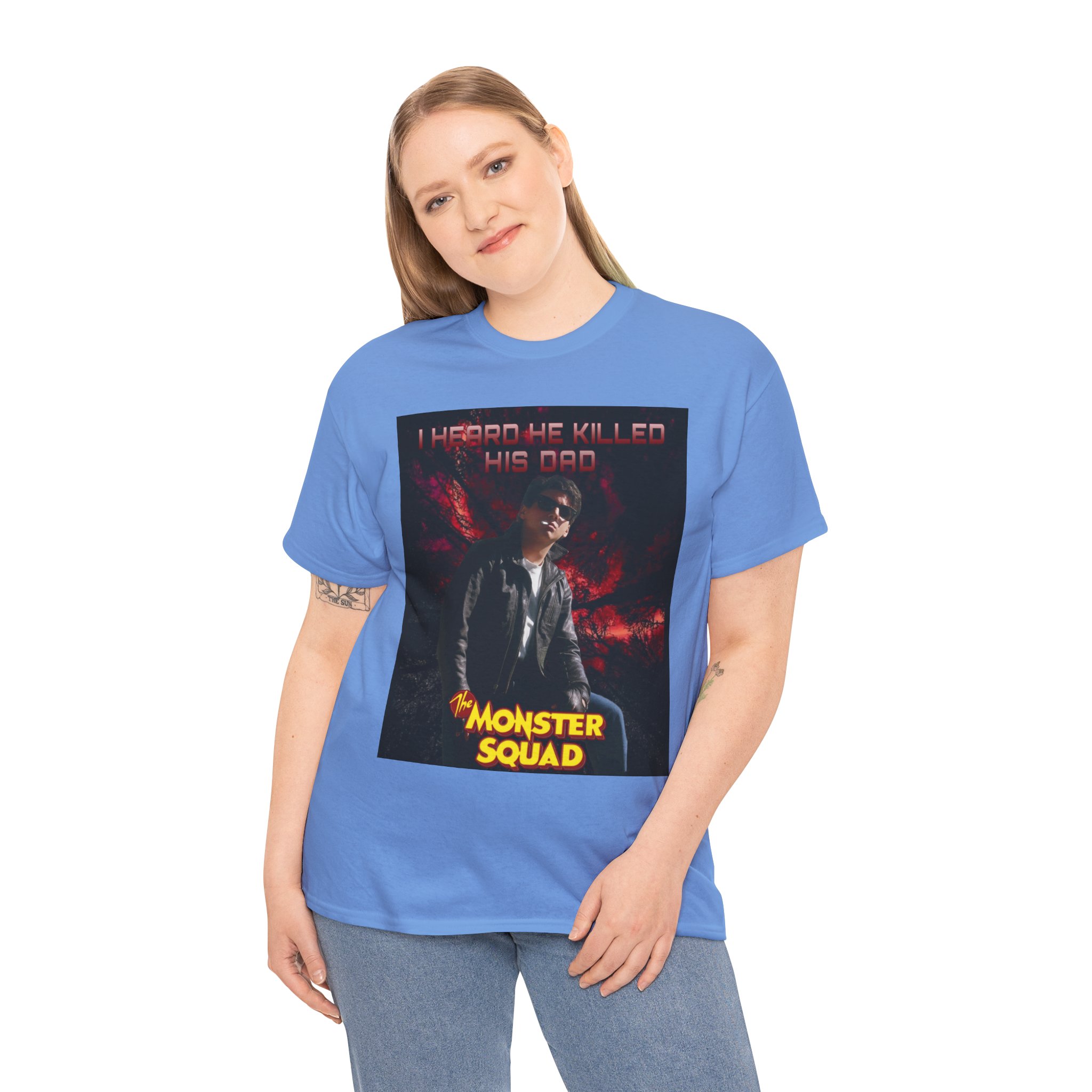 This classic black tee wears like a midnight scene from a cult horror poster — gritty, nostalgic, and a little dangerous. The front graphic layers a lone figure against burning red clouds with bold, retro lettering reading “The Monster Squad,” giving the shirt a vintage-movie vibe that leans into fandom and offbeat style. Lightweight but sturdy, it drapes with a relaxed fit so you can wear it to late-night screenings, conventions, or when you just want to lean into spooky season energy. The simple back keeps the focus on the striking front artwork, letting the design speak for itself.