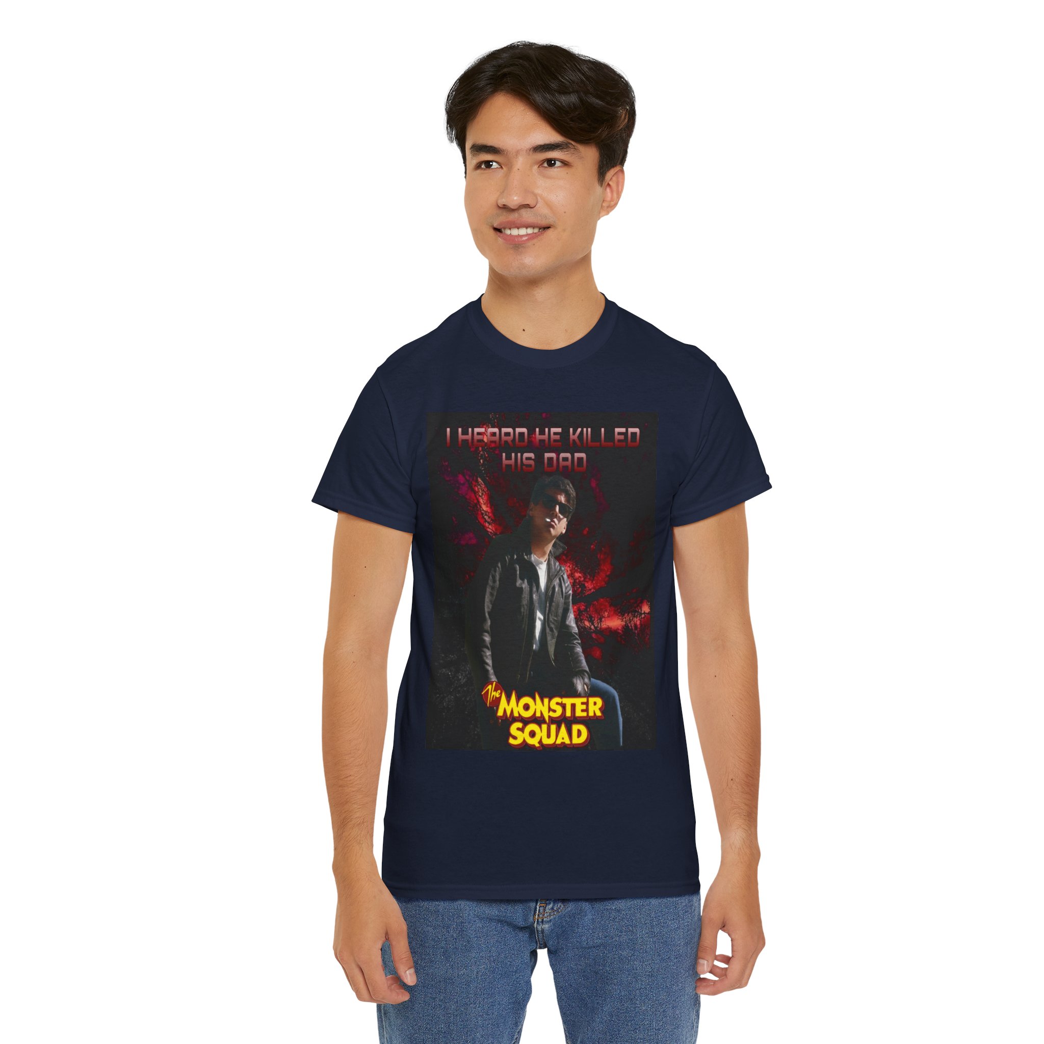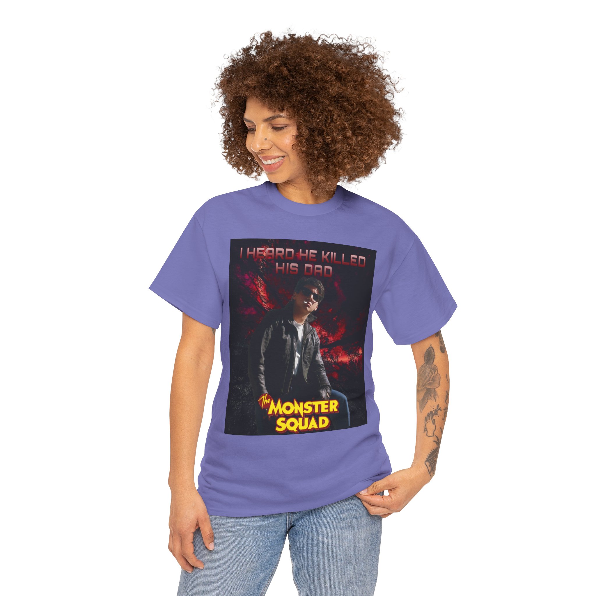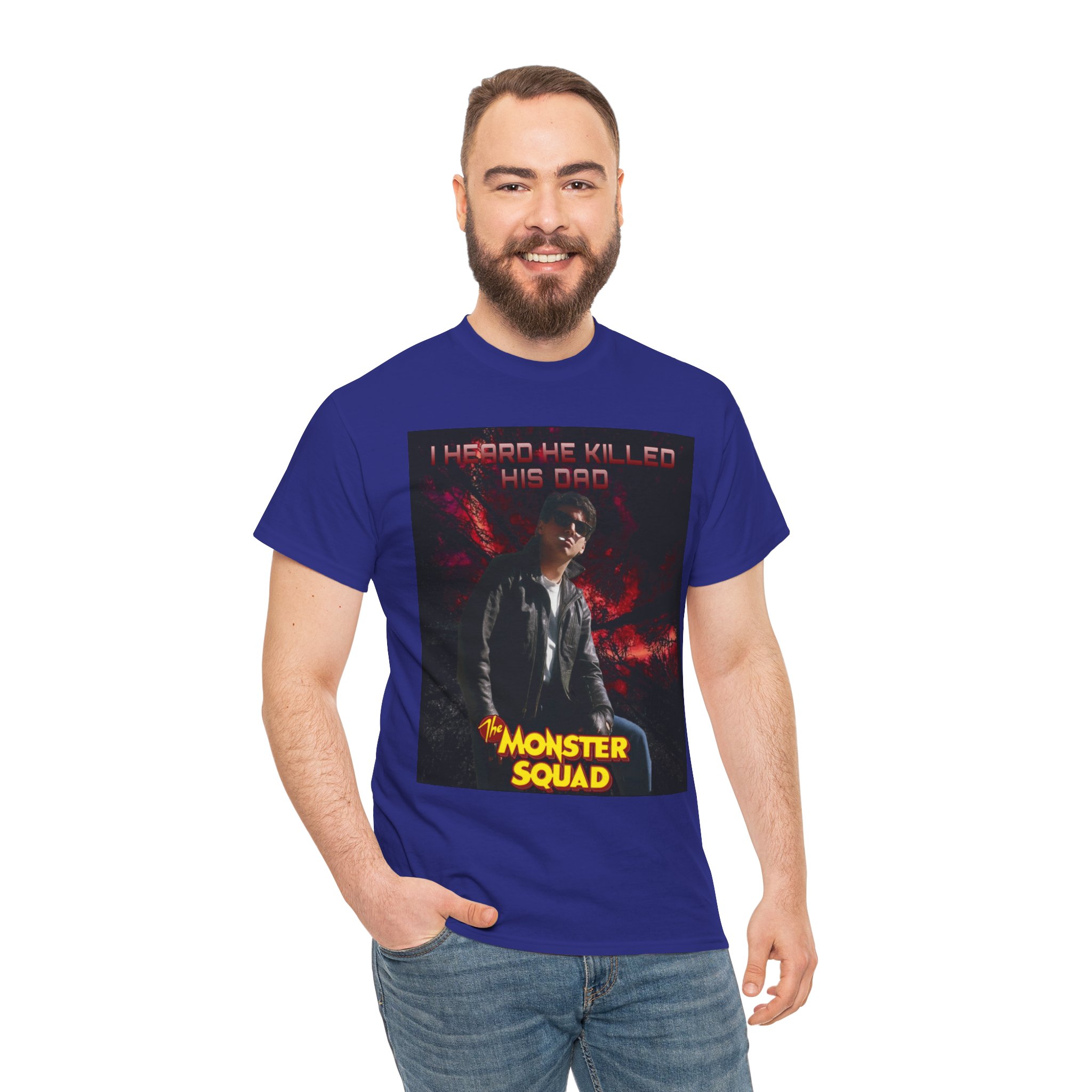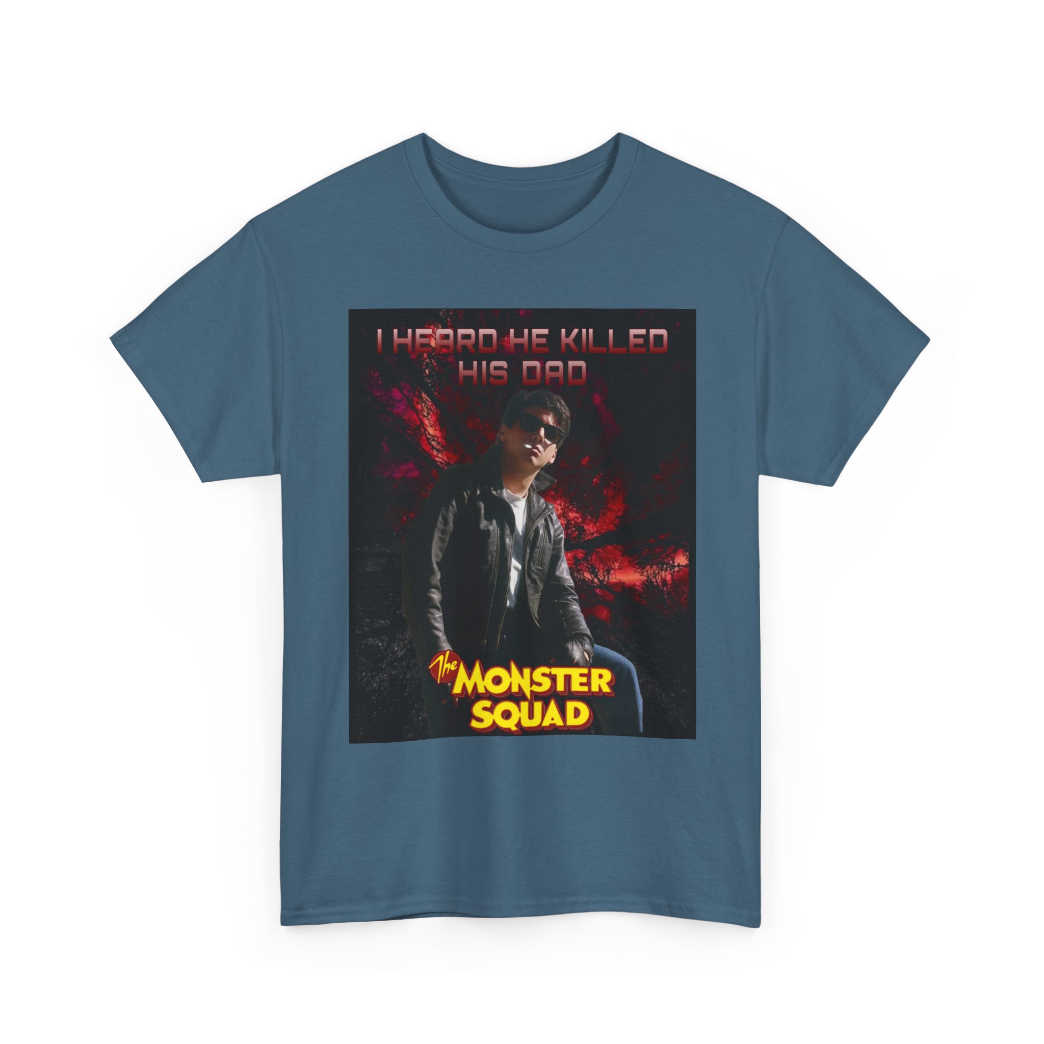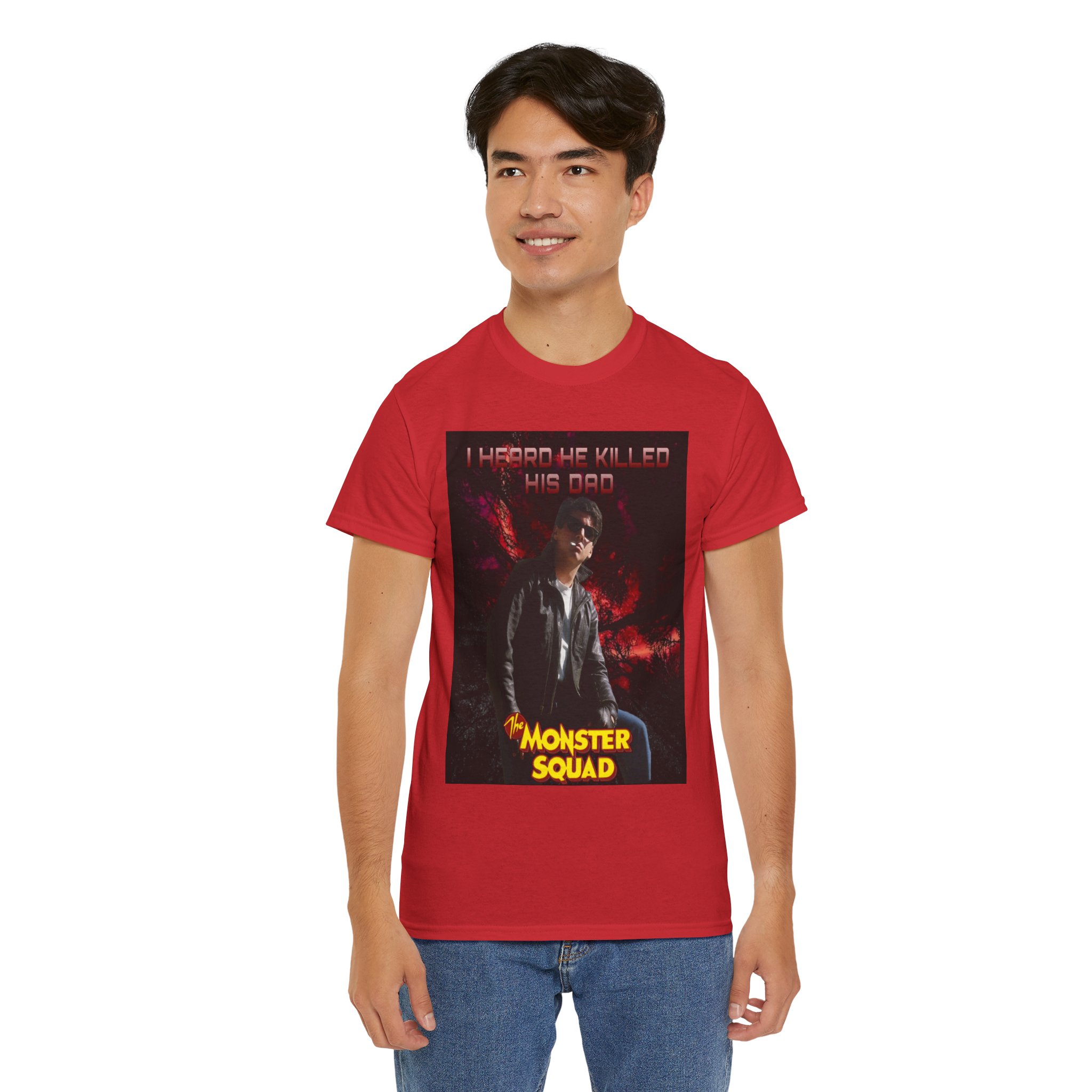 This classic black tee wears like a midnight scene from a cult horror poster — gritty, nostalgic, and a little dangerous. The front graphic layers a lone figure against burning red clouds with bold, retro lettering reading “The Monster Squad,” giving the shirt a vintage-movie vibe that leans into fandom and offbeat style. Lightweight but sturdy, it drapes with a relaxed fit so you can wear it to late-night screenings, conventions, or when you just want to lean into spooky season energy. The simple back keeps the focus on the striking front artwork, letting the design speak for itself.