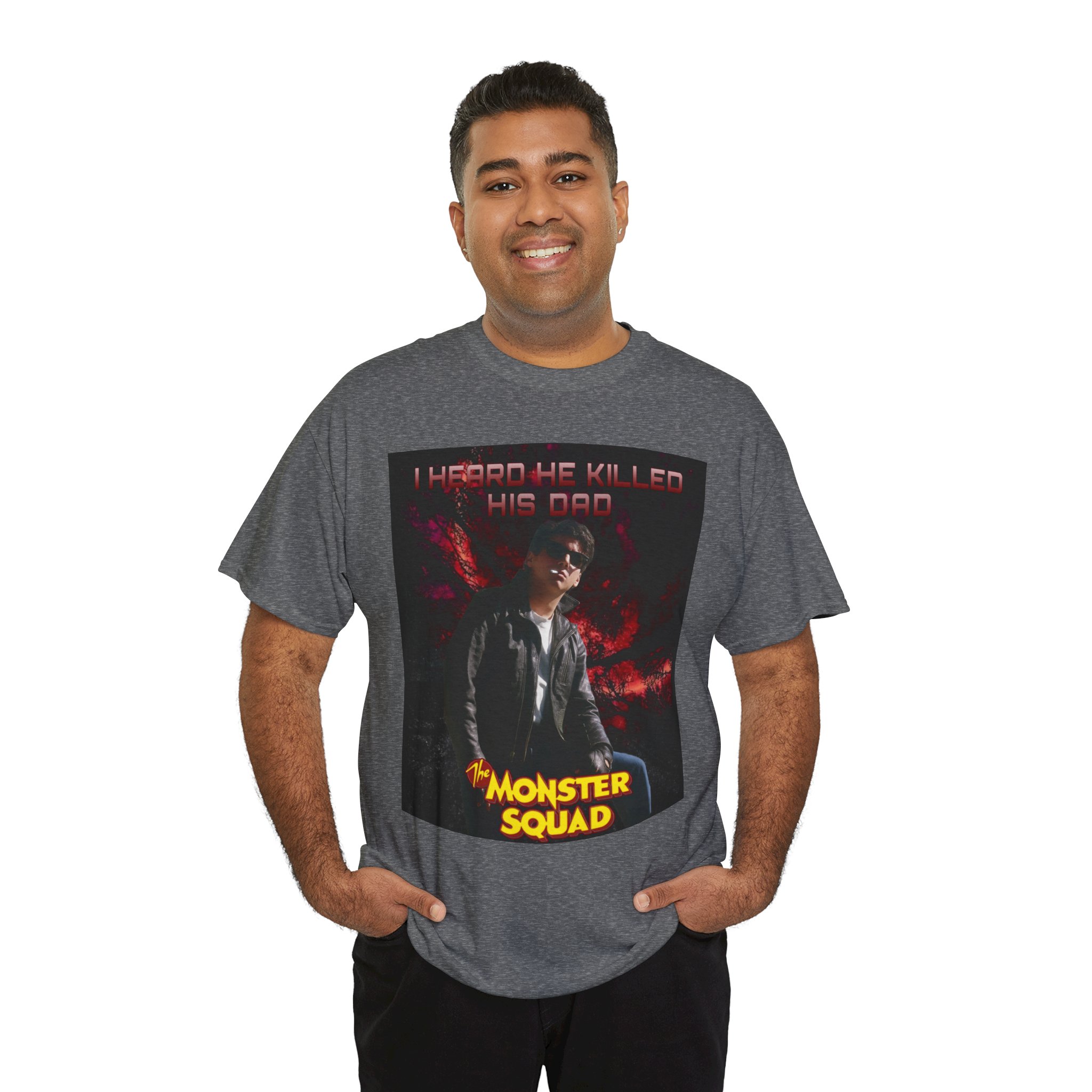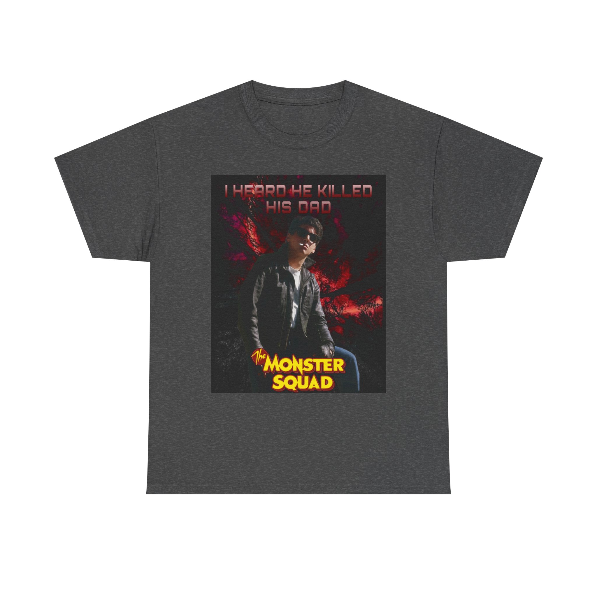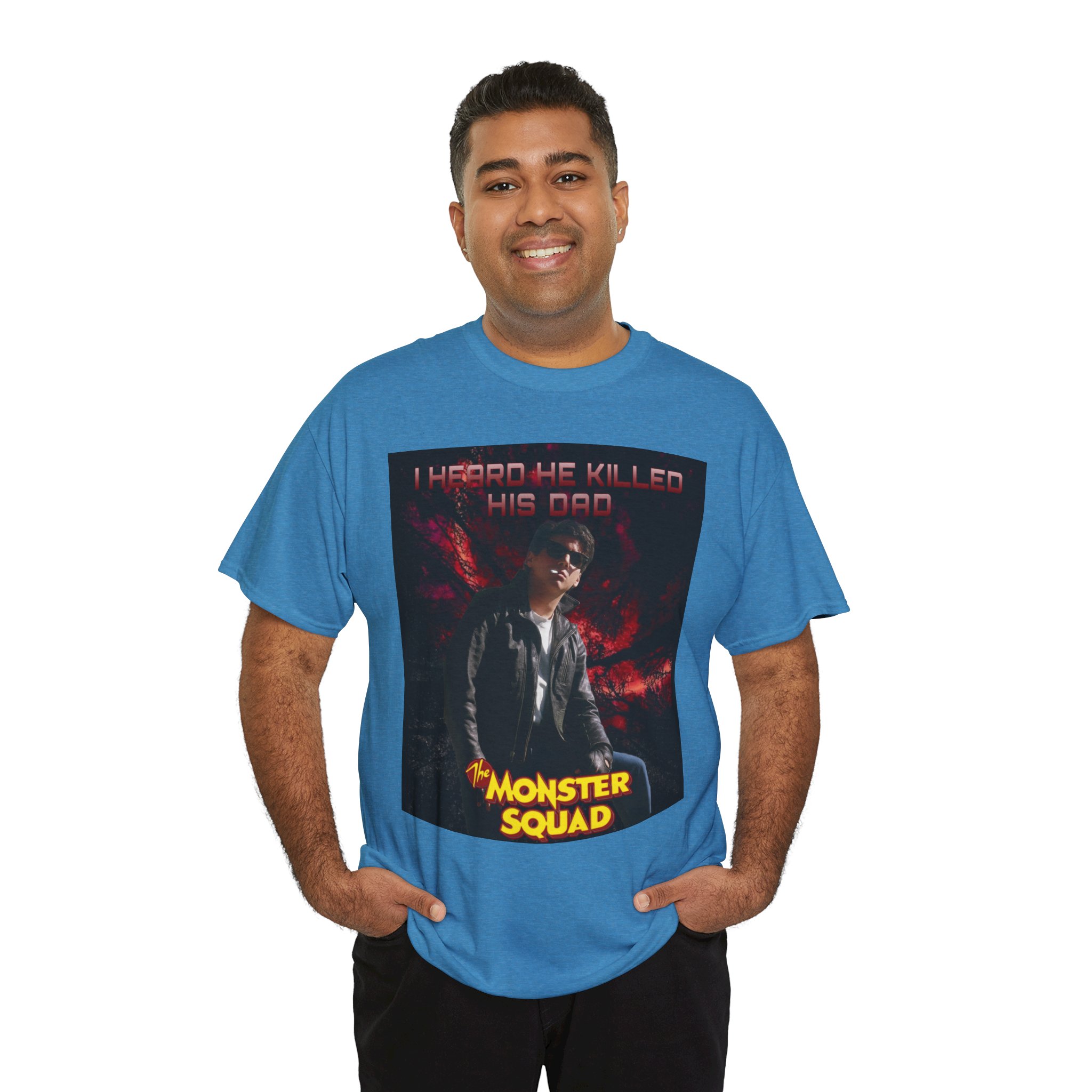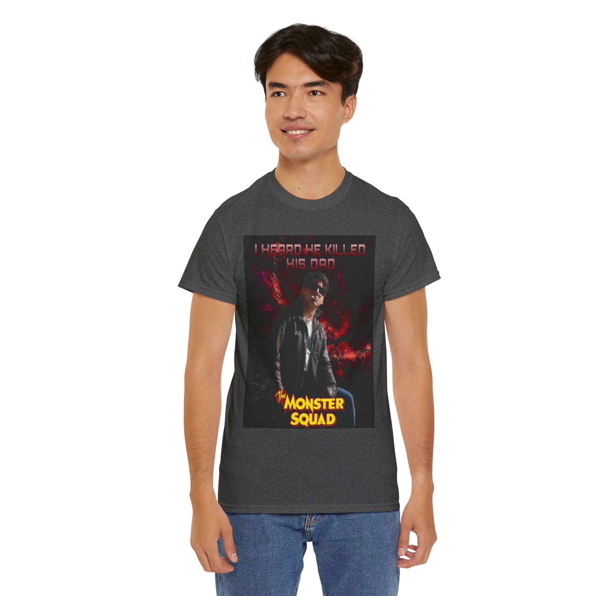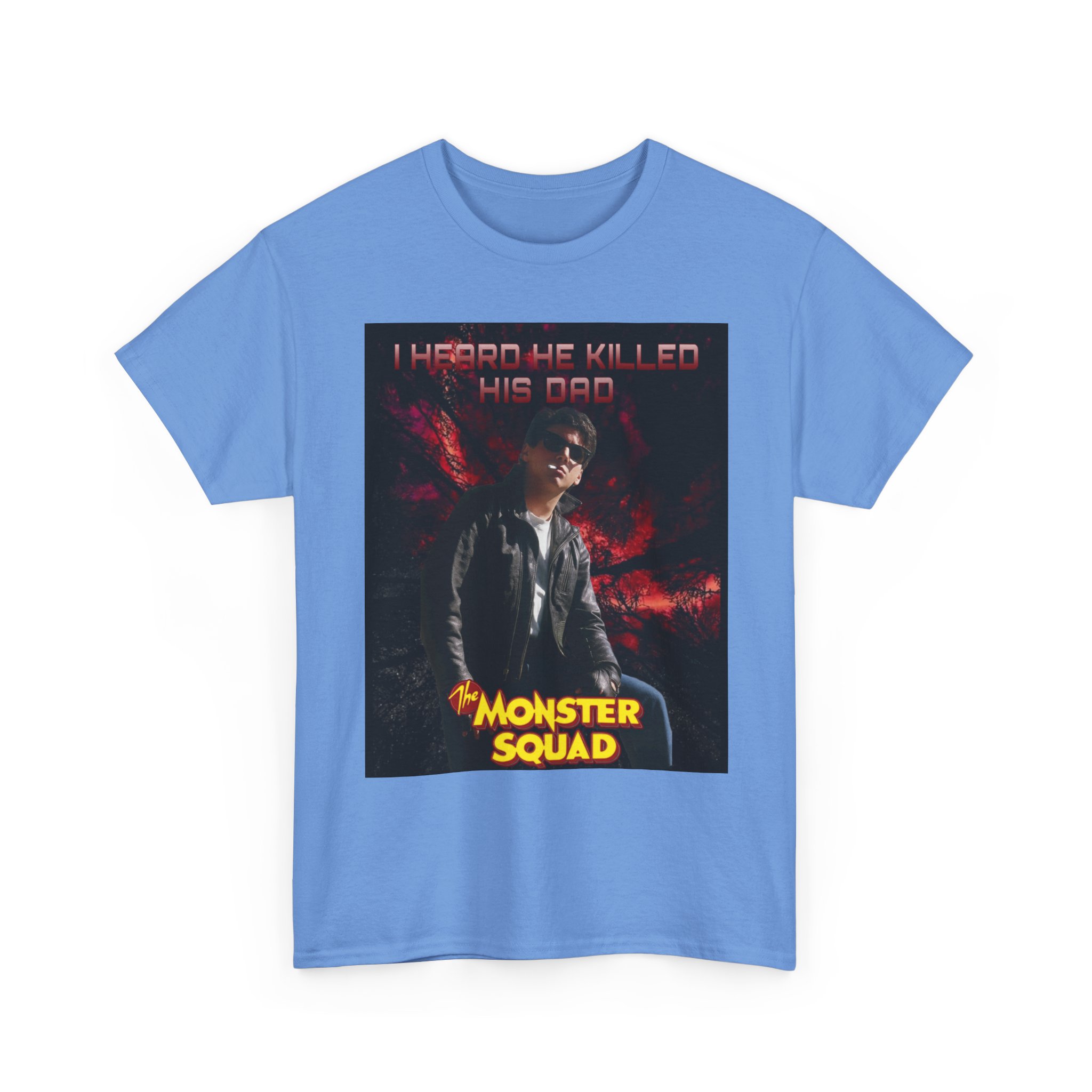 This classic black tee wears like a midnight scene from a cult horror poster — gritty, nostalgic, and a little dangerous. The front graphic layers a lone figure against burning red clouds with bold, retro lettering reading “The Monster Squad,” giving the shirt a vintage-movie vibe that leans into fandom and offbeat style. Lightweight but sturdy, it drapes with a relaxed fit so you can wear it to late-night screenings, conventions, or when you just want to lean into spooky season energy. The simple back keeps the focus on the striking front artwork, letting the design speak for itself.