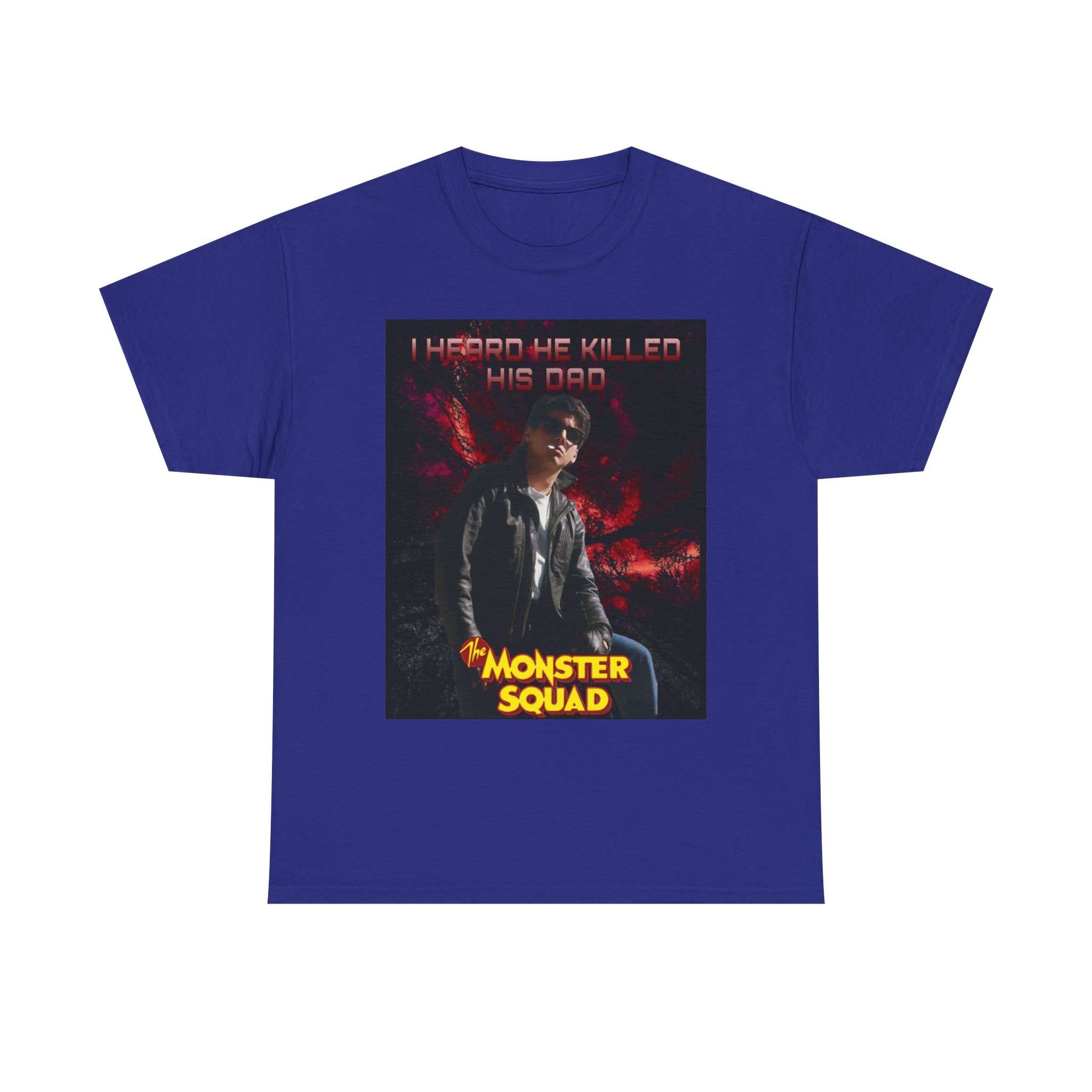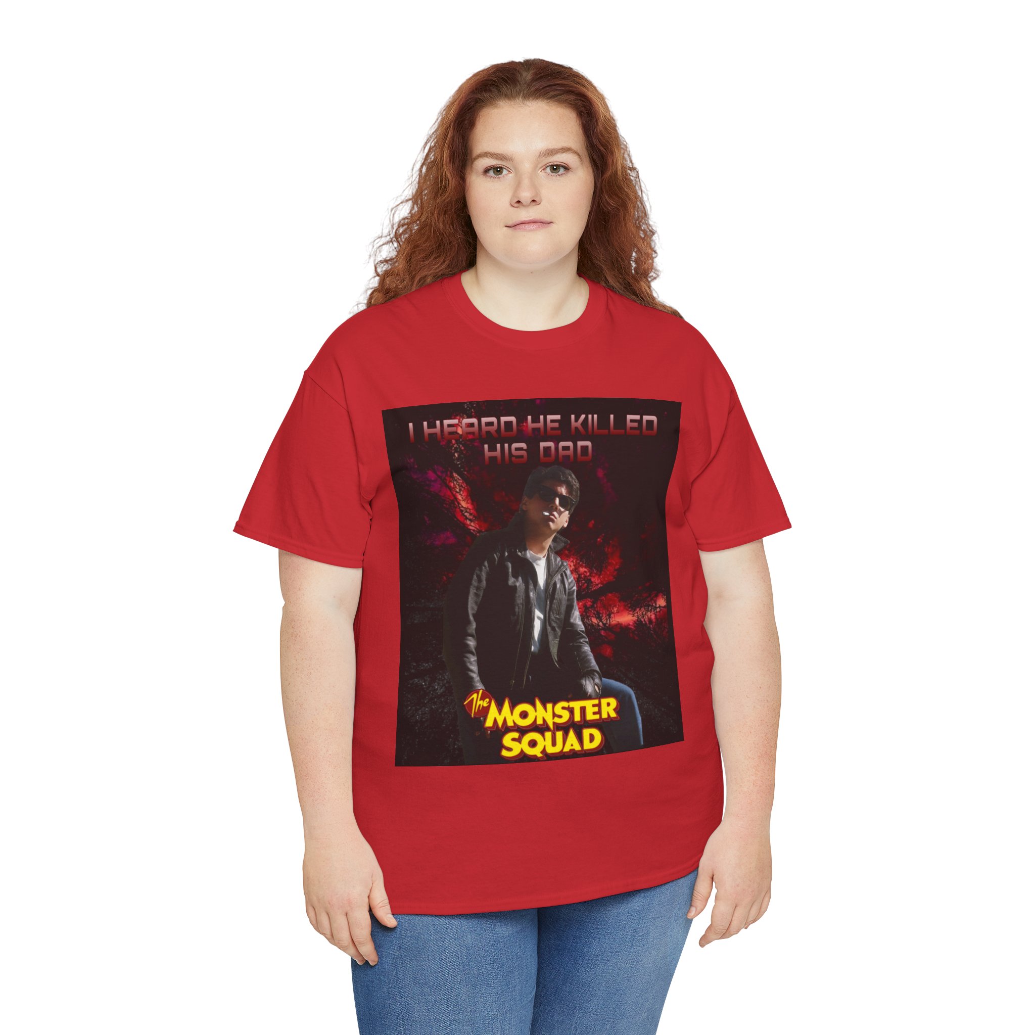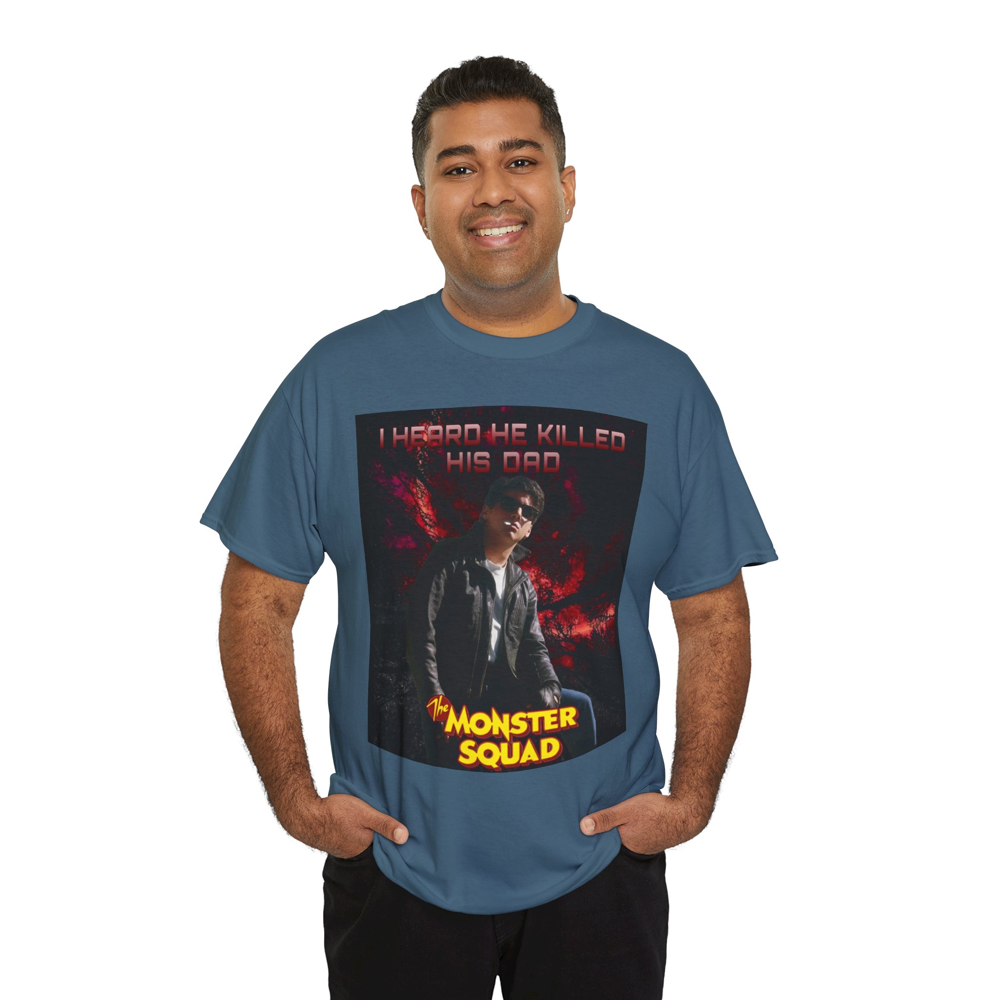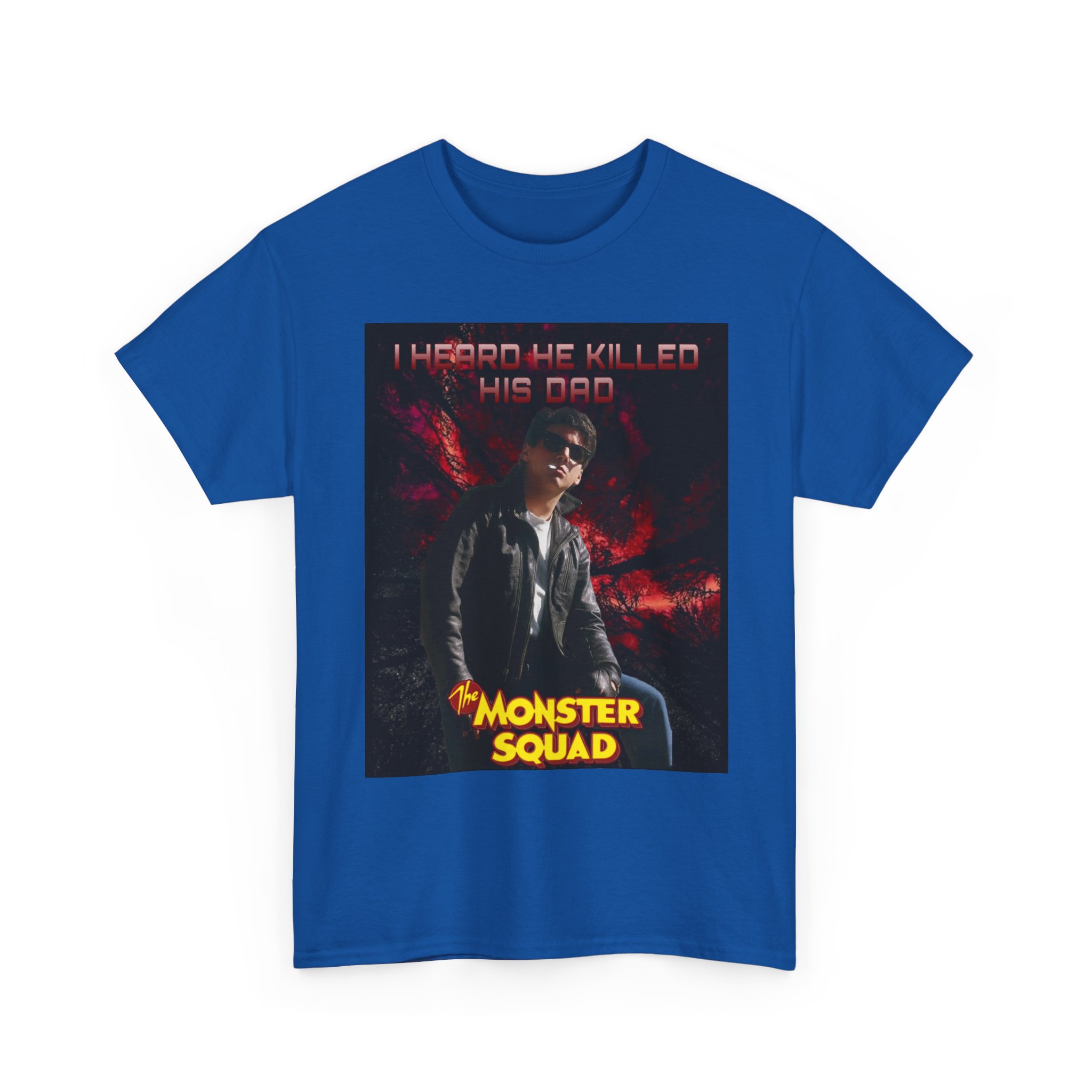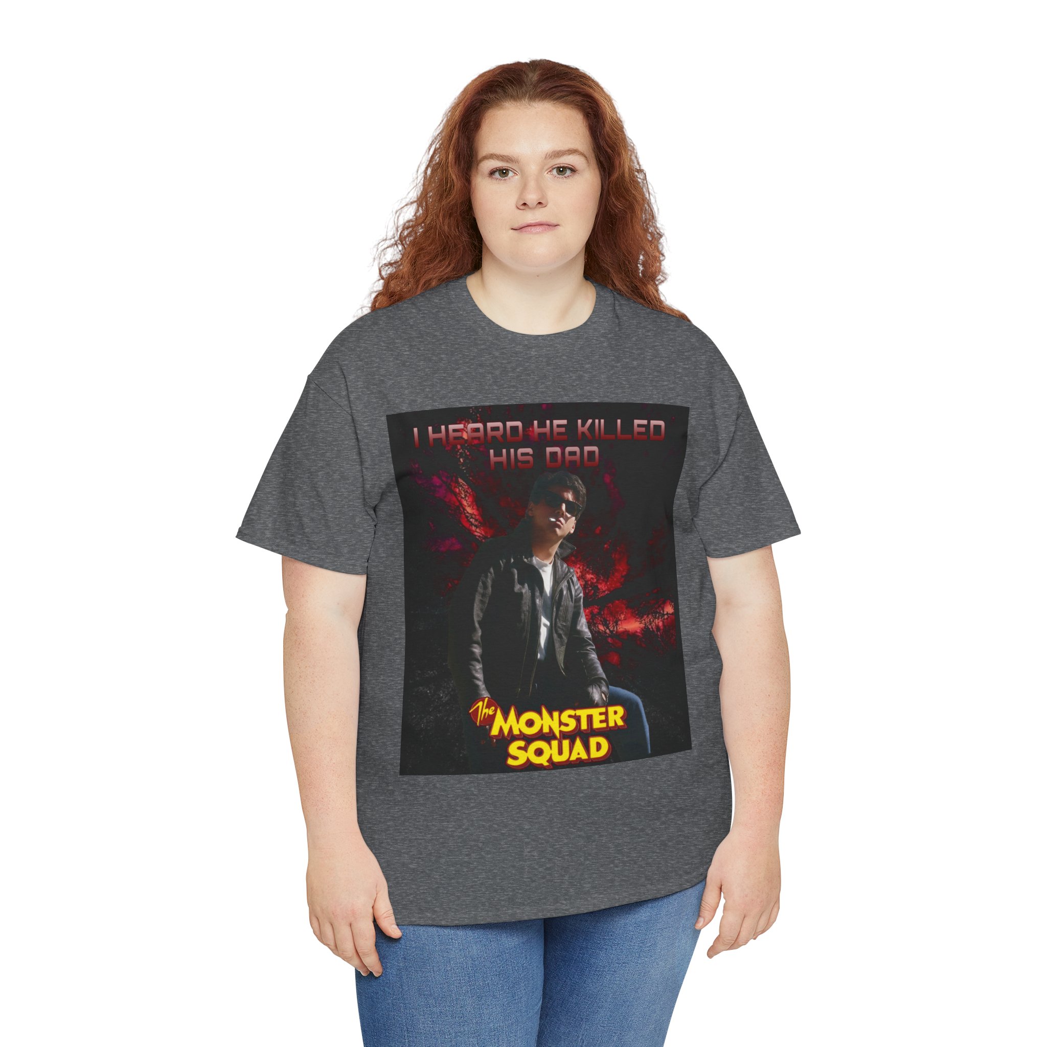 This classic black tee wears like a midnight scene from a cult horror poster — gritty, nostalgic, and a little dangerous. The front graphic layers a lone figure against burning red clouds with bold, retro lettering reading “The Monster Squad,” giving the shirt a vintage-movie vibe that leans into fandom and offbeat style. Lightweight but sturdy, it drapes with a relaxed fit so you can wear it to late-night screenings, conventions, or when you just want to lean into spooky season energy. The simple back keeps the focus on the striking front artwork, letting the design speak for itself.