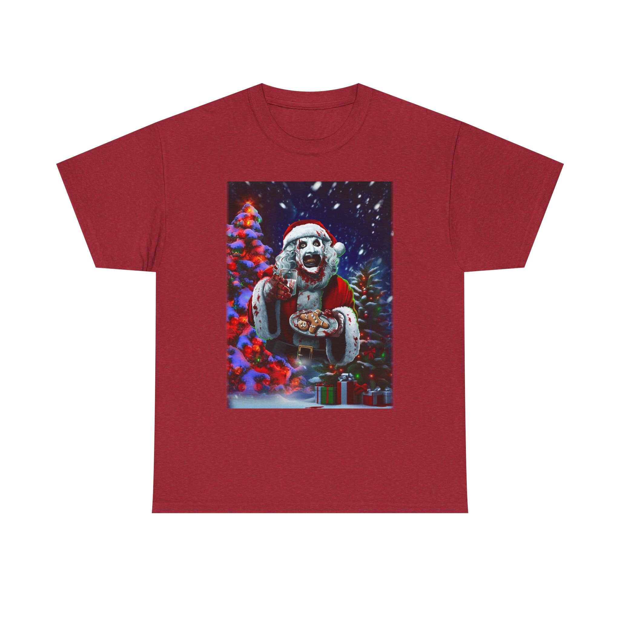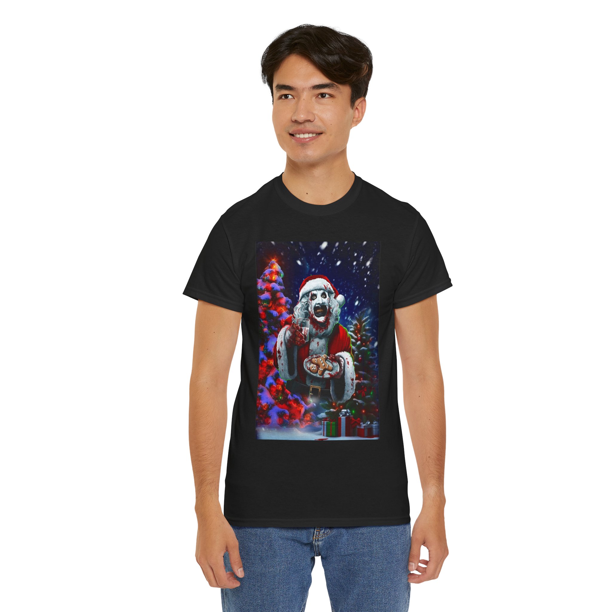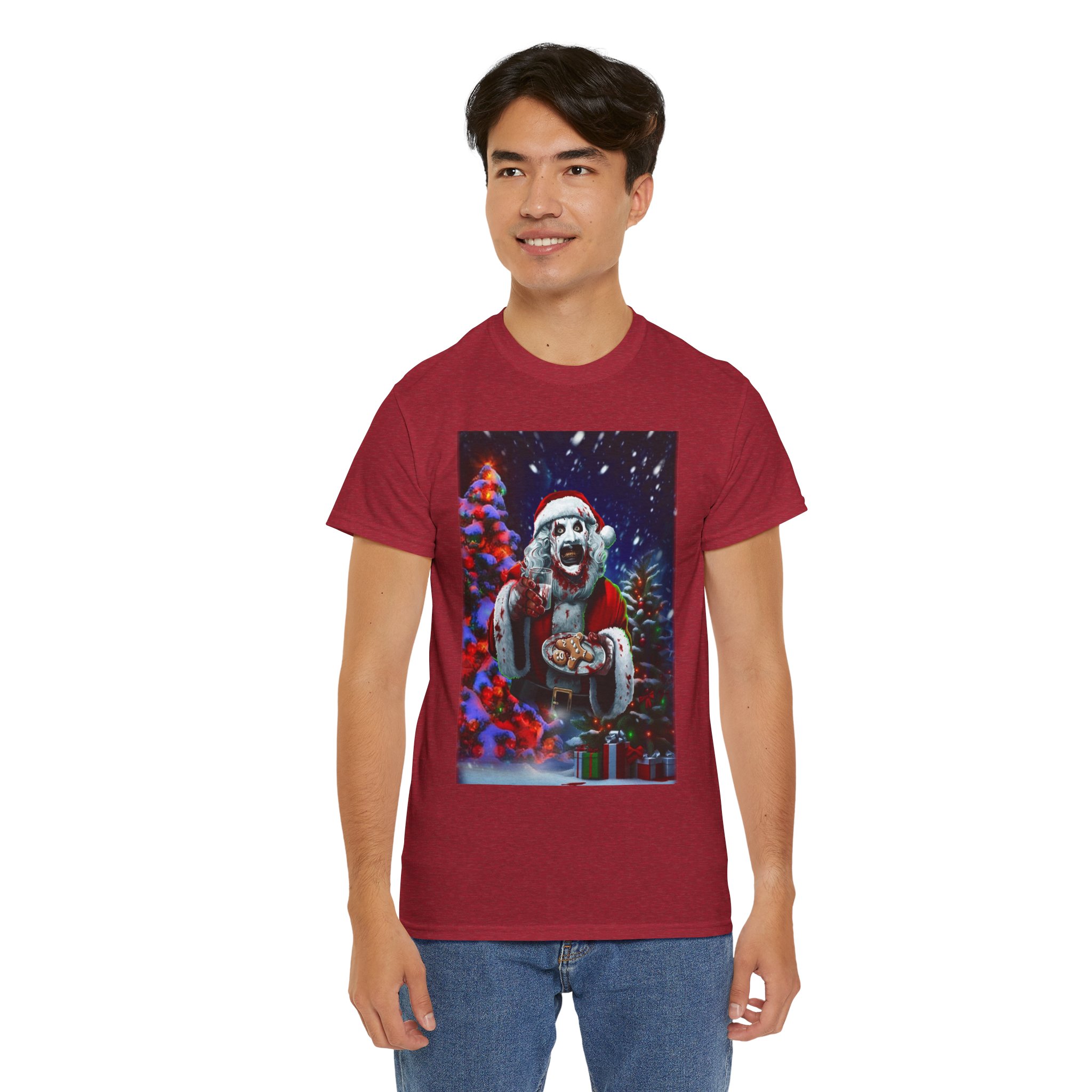 Bring a slice of edge and holiday chaos to your wardrobe with this graphic tee featuring Art the Clown from Terrifier against a Christmas motif. It’s for people who love horror that grins — the late-night movie crowd, convention goers, and anyone who decorates their holidays with a wink of wickedness. Wear it to fan meetups, film nights, or low-key holiday parties where you want the shirt to start conversations without saying a word. The print is crisp and detailed, the collar stays true, and the fit moves with you whether you’re navigating a con floor or settling in for a marathon of seasonal scares. Subtle natural flecks in the unprocessed color and a tear-away label keep the piece comfortable and lived-in from the first wear.