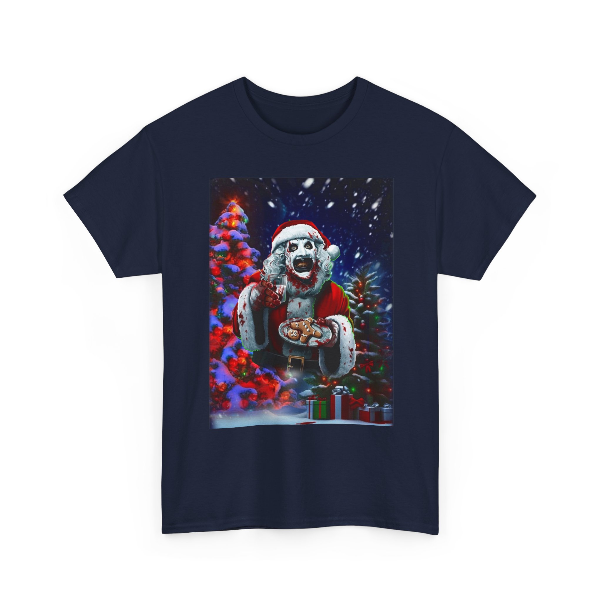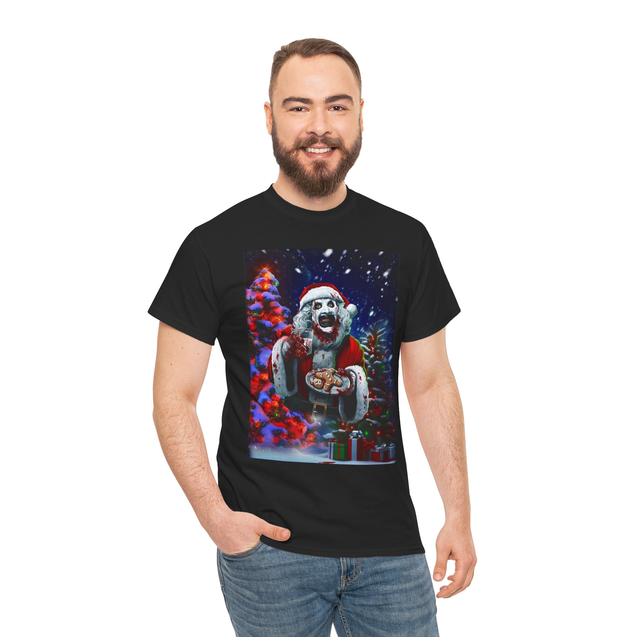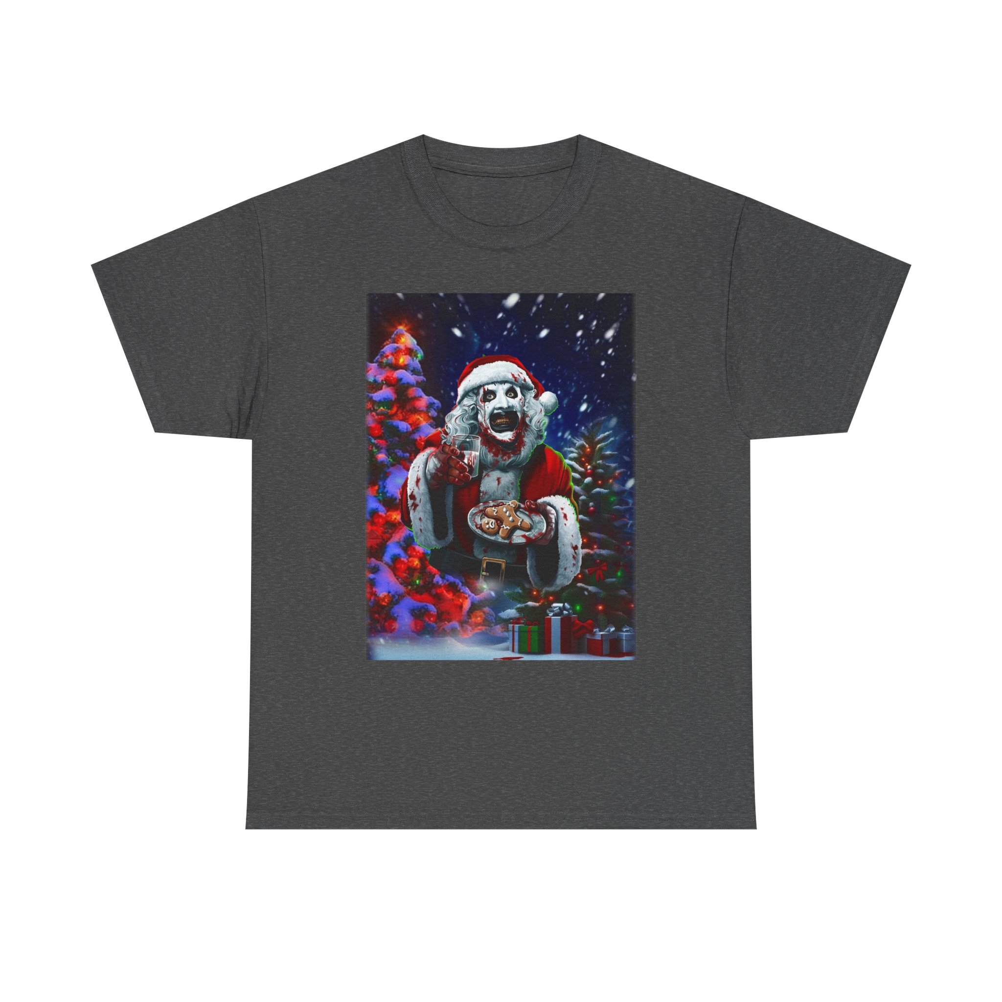 Bring a slice of edge and holiday chaos to your wardrobe with this graphic tee featuring Art the Clown from Terrifier against a Christmas motif. It’s for people who love horror that grins — the late-night movie crowd, convention goers, and anyone who decorates their holidays with a wink of wickedness. Wear it to fan meetups, film nights, or low-key holiday parties where you want the shirt to start conversations without saying a word. The print is crisp and detailed, the collar stays true, and the fit moves with you whether you’re navigating a con floor or settling in for a marathon of seasonal scares. Subtle natural flecks in the unprocessed color and a tear-away label keep the piece comfortable and lived-in from the first wear.