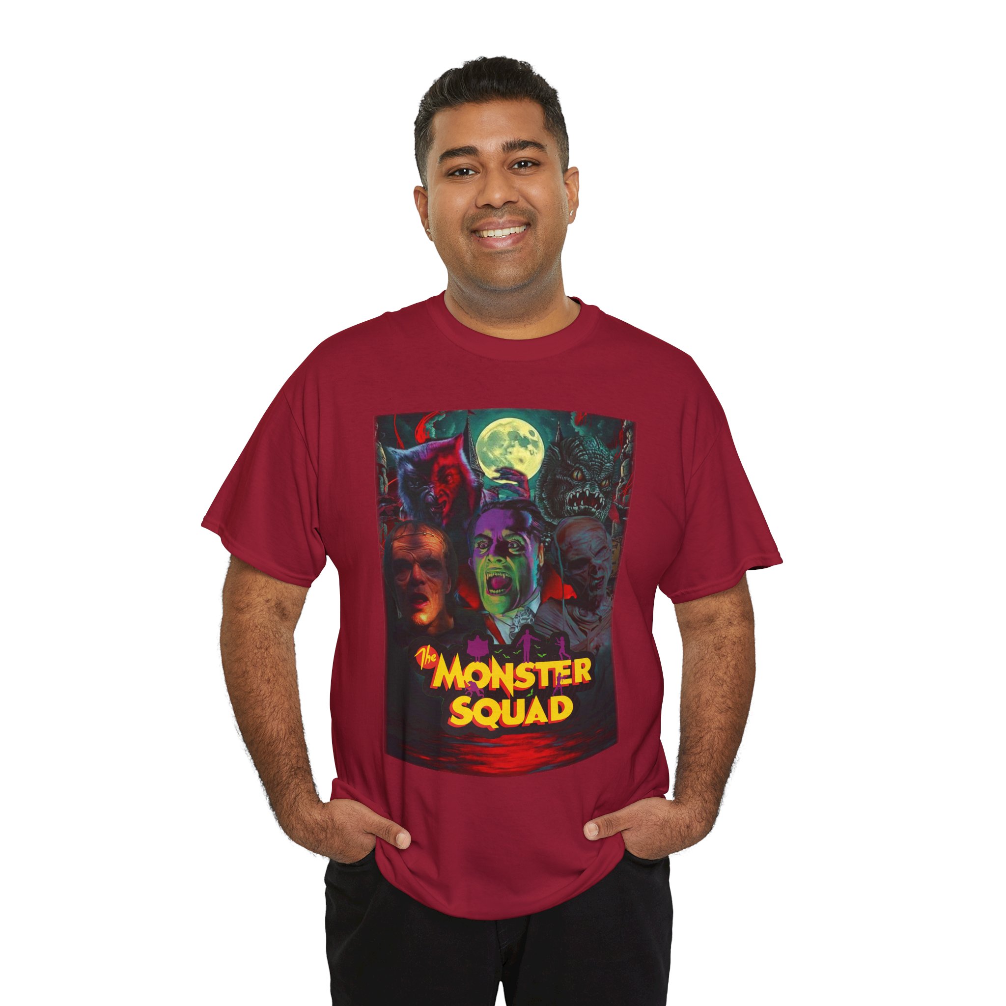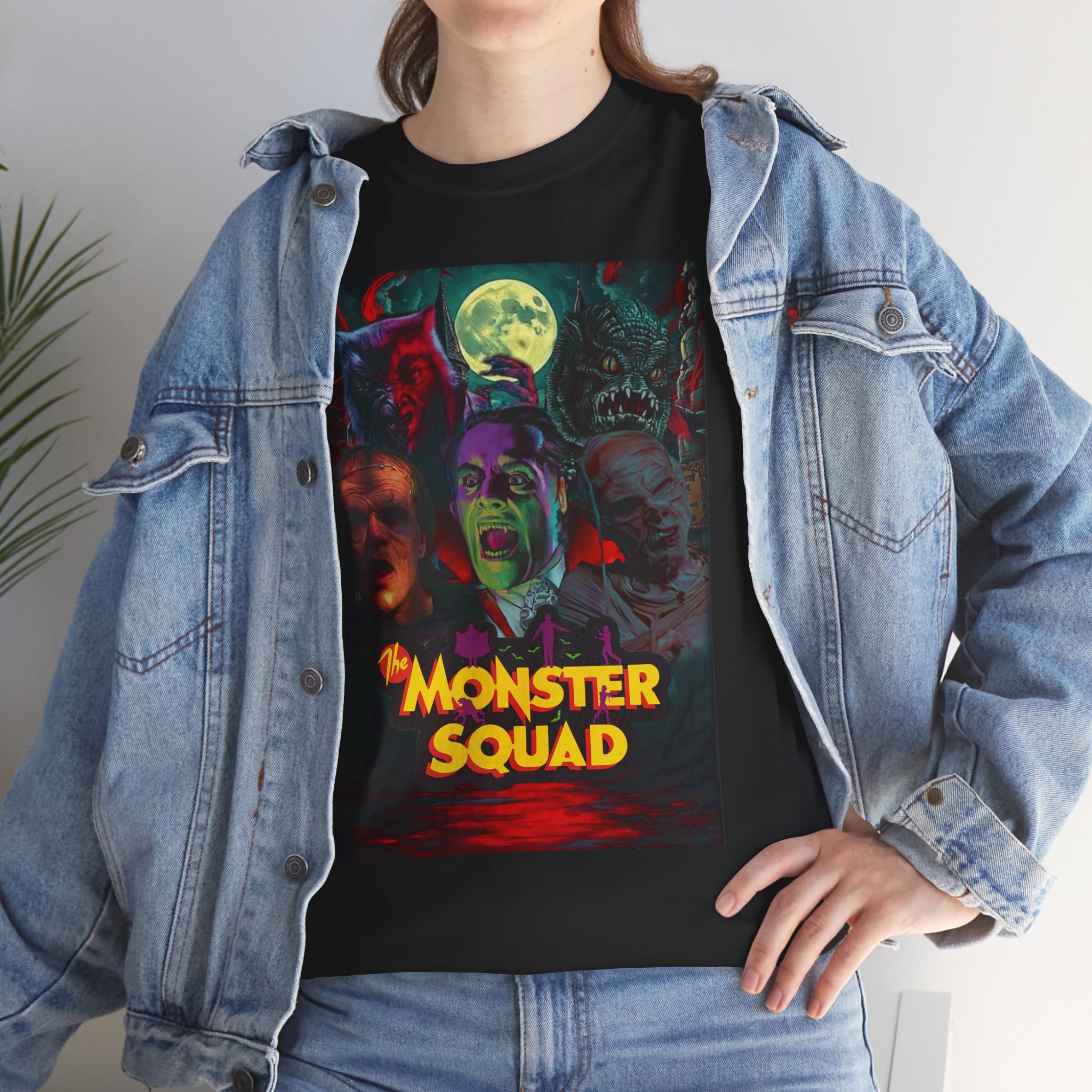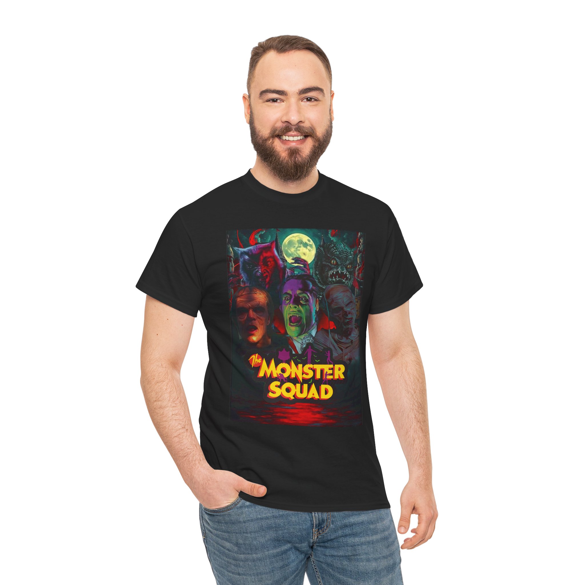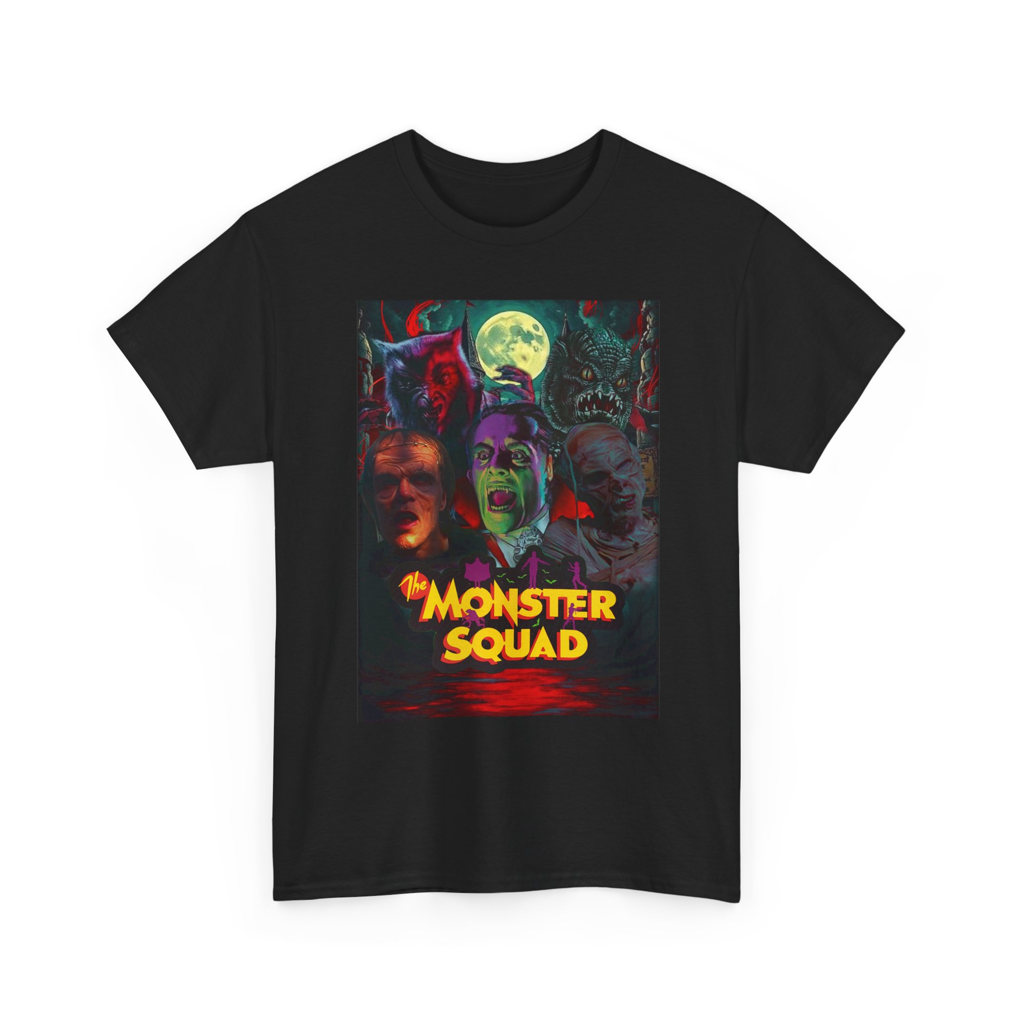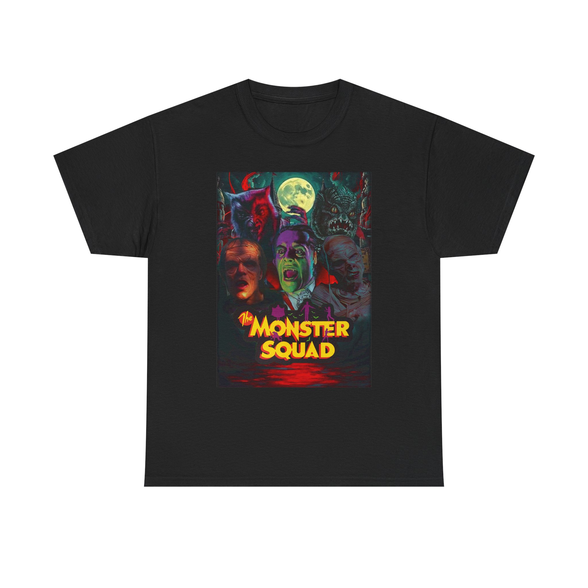 This black graphic tee brings neon-soaked horror nostalgia to everyday wear. The bold, poster-style artwork layers classic monster faces under a glowing full moon, with rich reds and eerie greens that pop against the dark fabric. It feels like stepping into a late-night drive-in — grainy film, electric buzz, and the thrill of shared chills. Wear it to movie nights, horror conventions, or when you want your look to announce that you know and love cult-classic scares. The relaxed classic fit and smooth, mid-weight cotton keep the shirt comfortable for long nights out or lazy days in. Details like the ribbed collar and taped shoulders keep the silhouette sharp, while the tear-away label and quality printing make it easy to wear again and again.