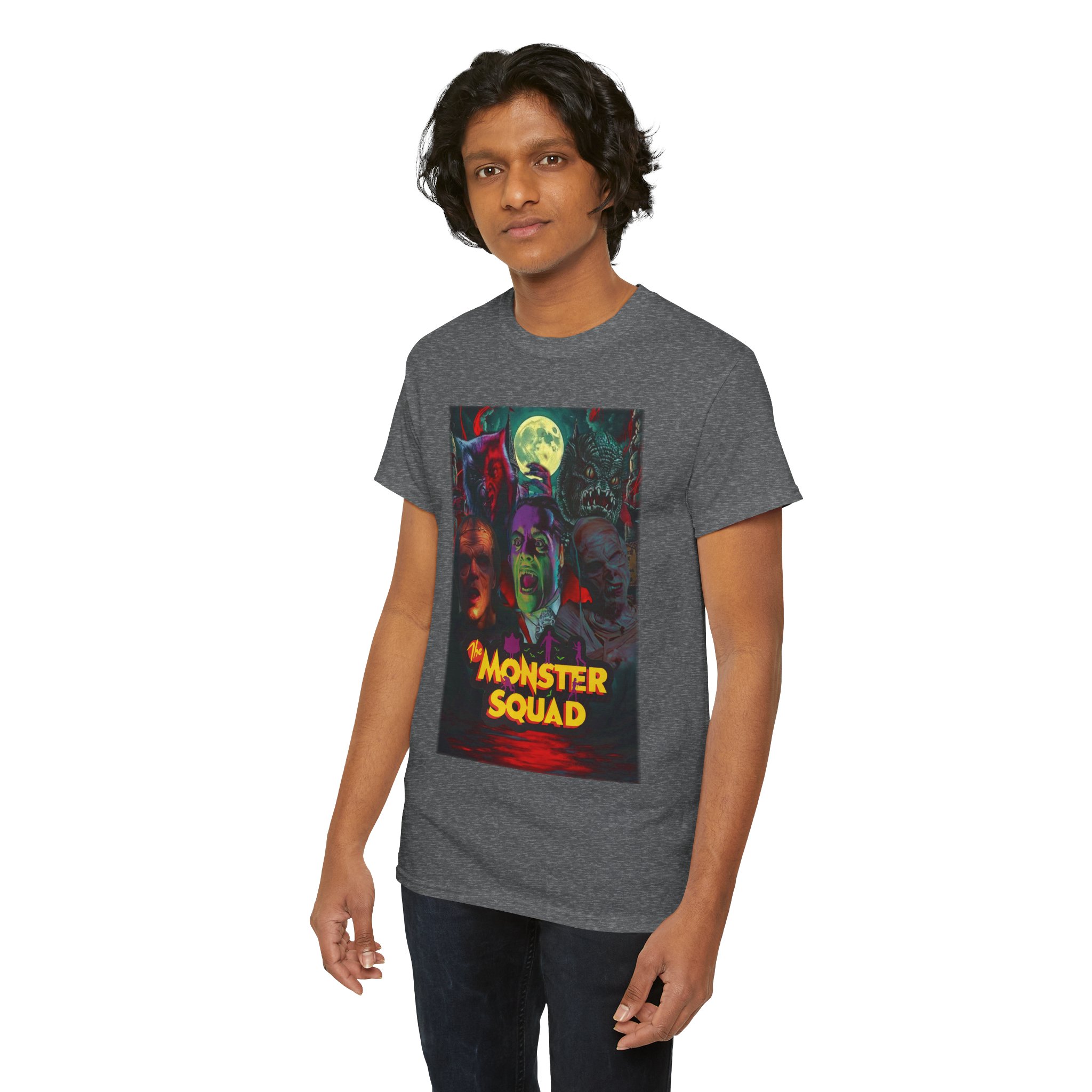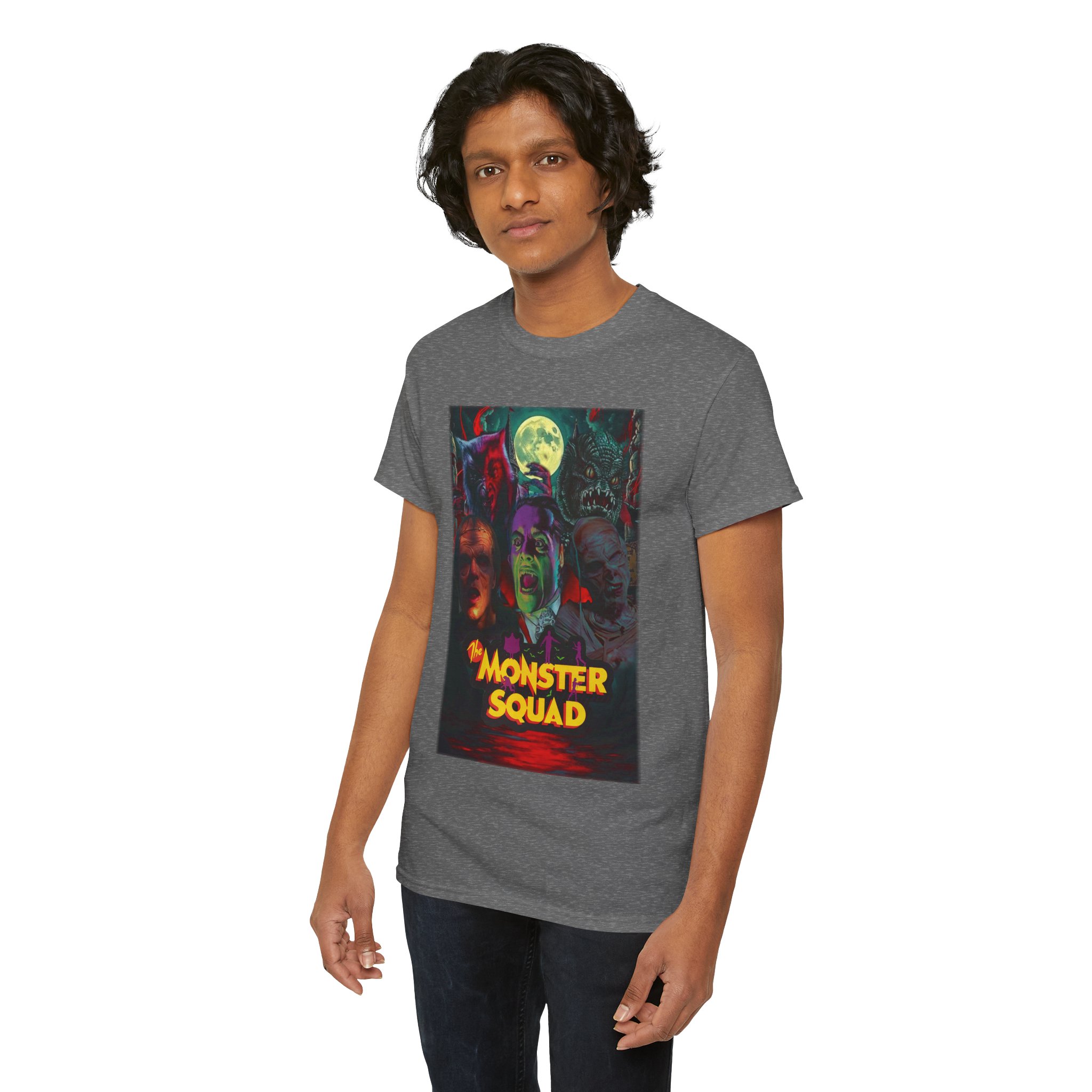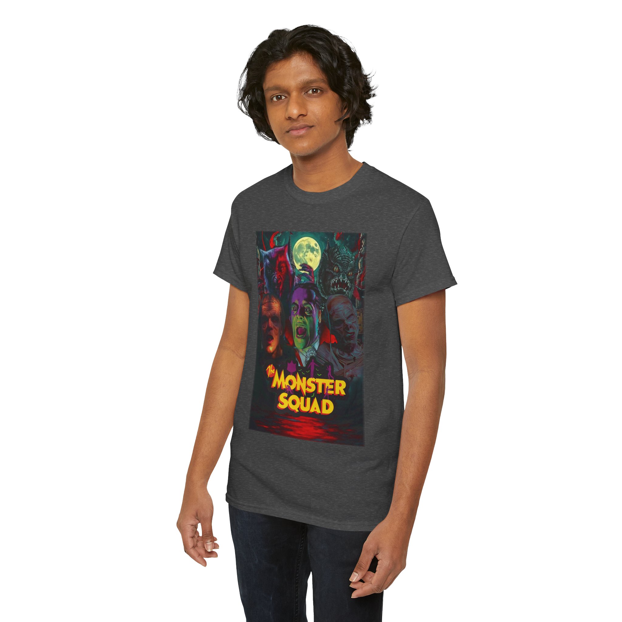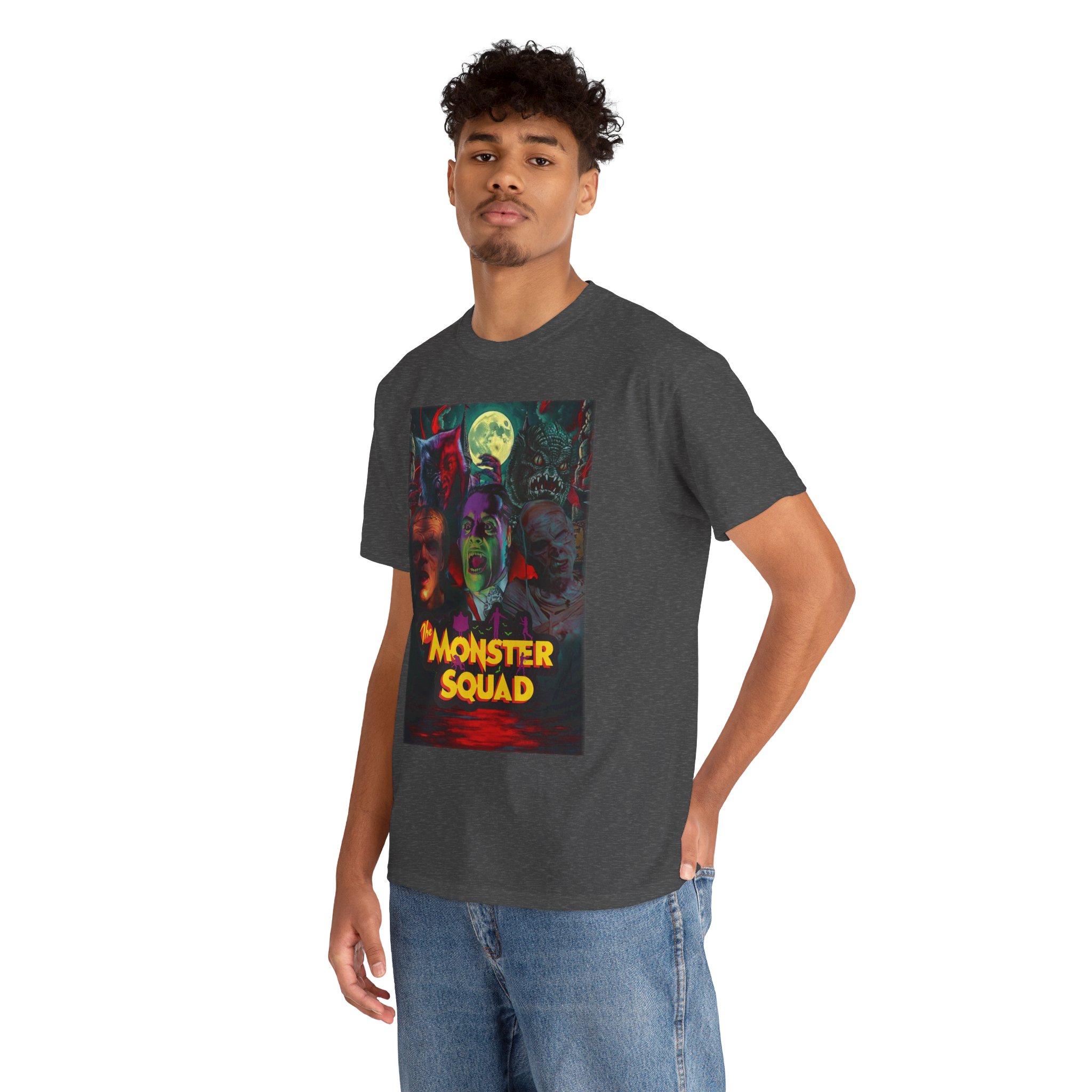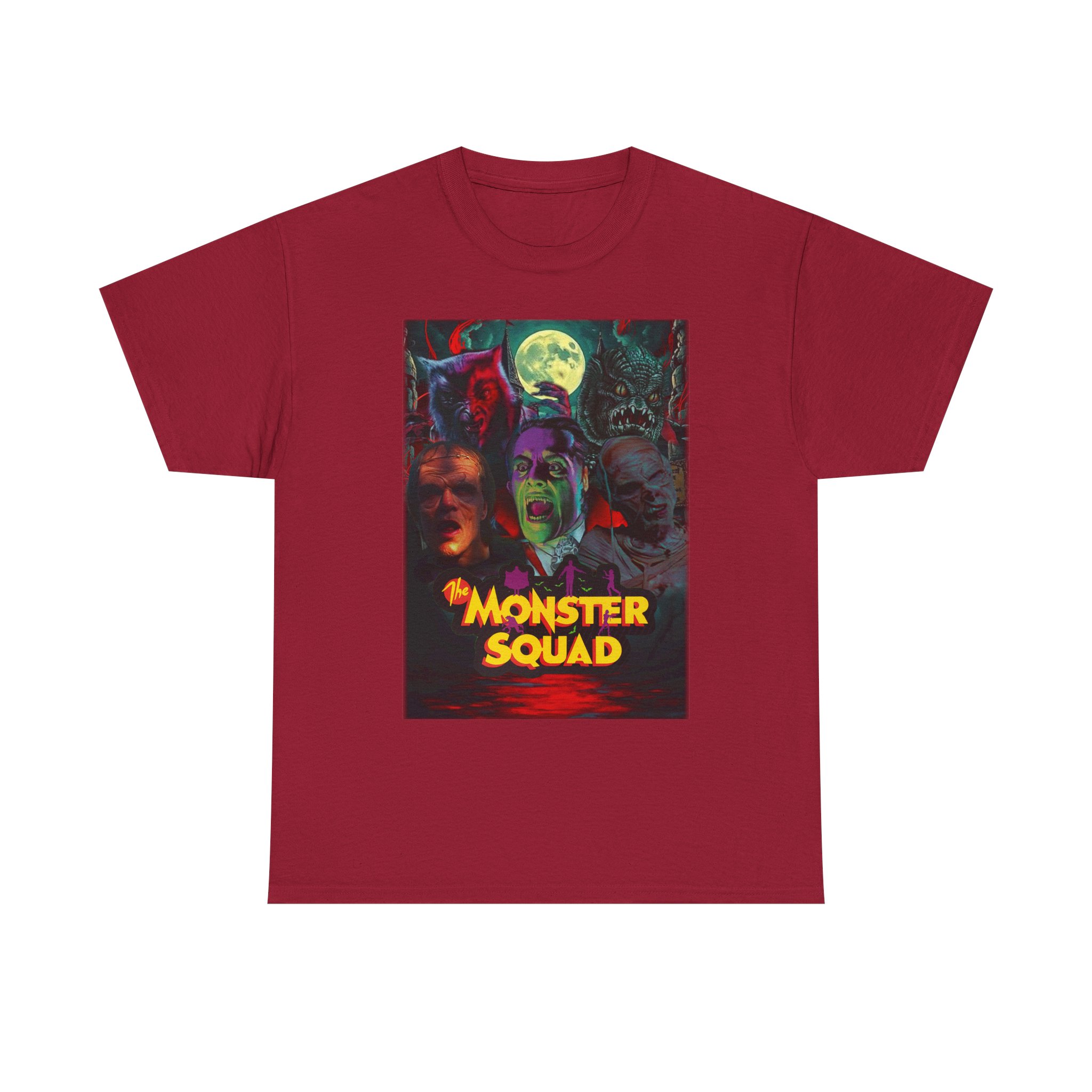 This black graphic tee brings neon-soaked horror nostalgia to everyday wear. The bold, poster-style artwork layers classic monster faces under a glowing full moon, with rich reds and eerie greens that pop against the dark fabric. It feels like stepping into a late-night drive-in — grainy film, electric buzz, and the thrill of shared chills. Wear it to movie nights, horror conventions, or when you want your look to announce that you know and love cult-classic scares. The relaxed classic fit and smooth, mid-weight cotton keep the shirt comfortable for long nights out or lazy days in. Details like the ribbed collar and taped shoulders keep the silhouette sharp, while the tear-away label and quality printing make it easy to wear again and again.