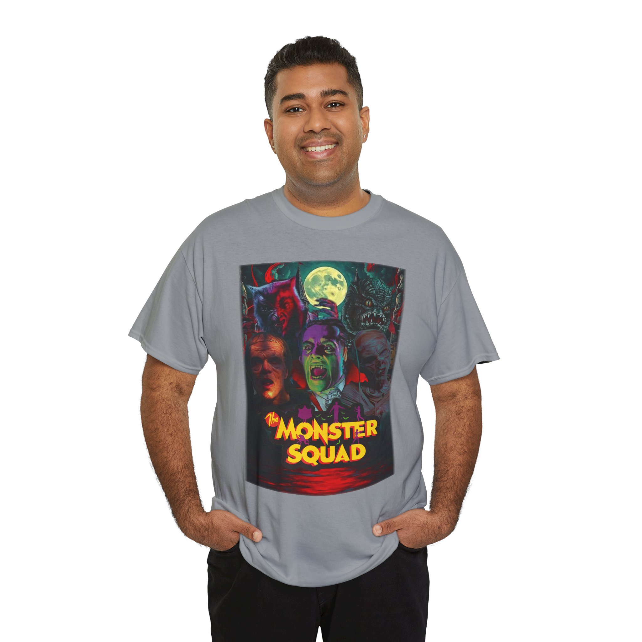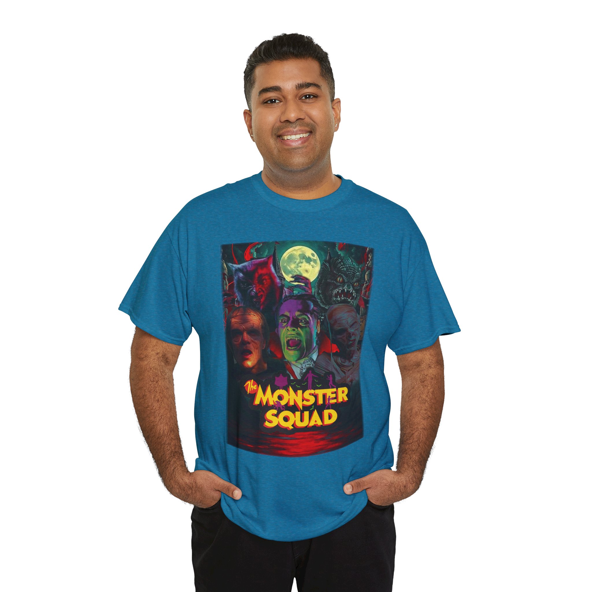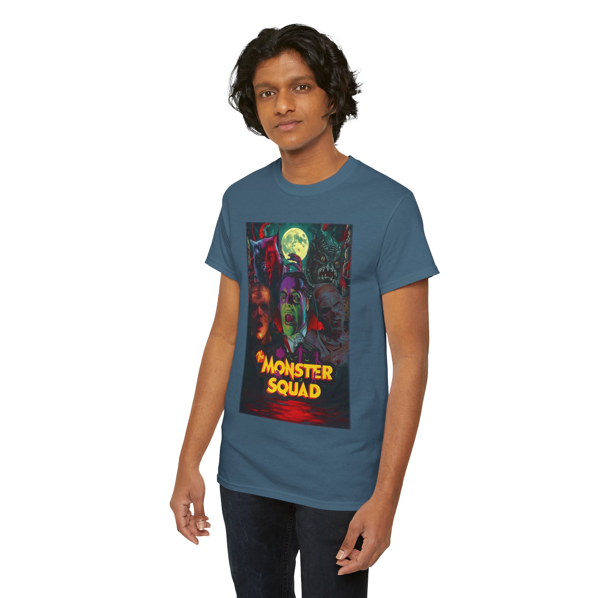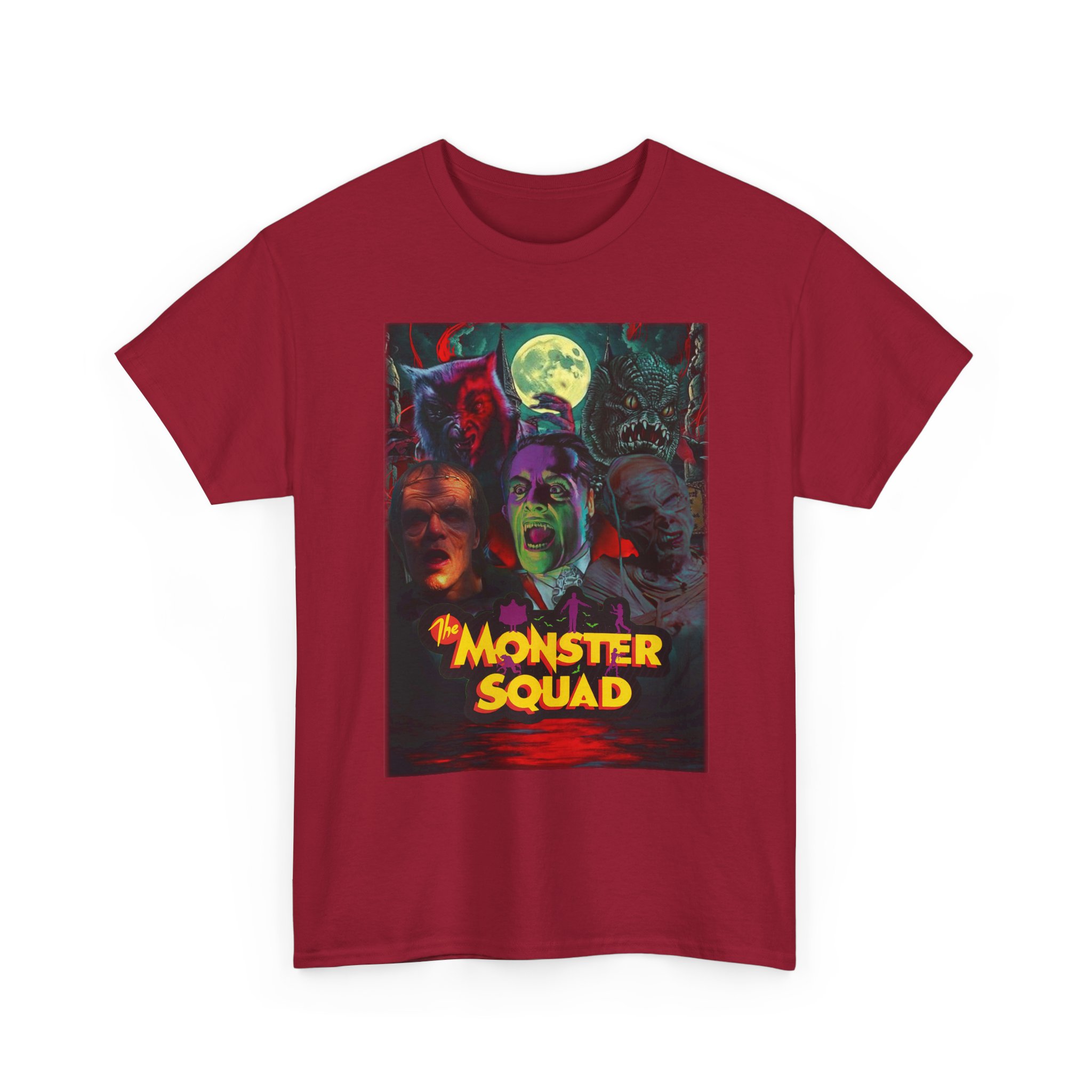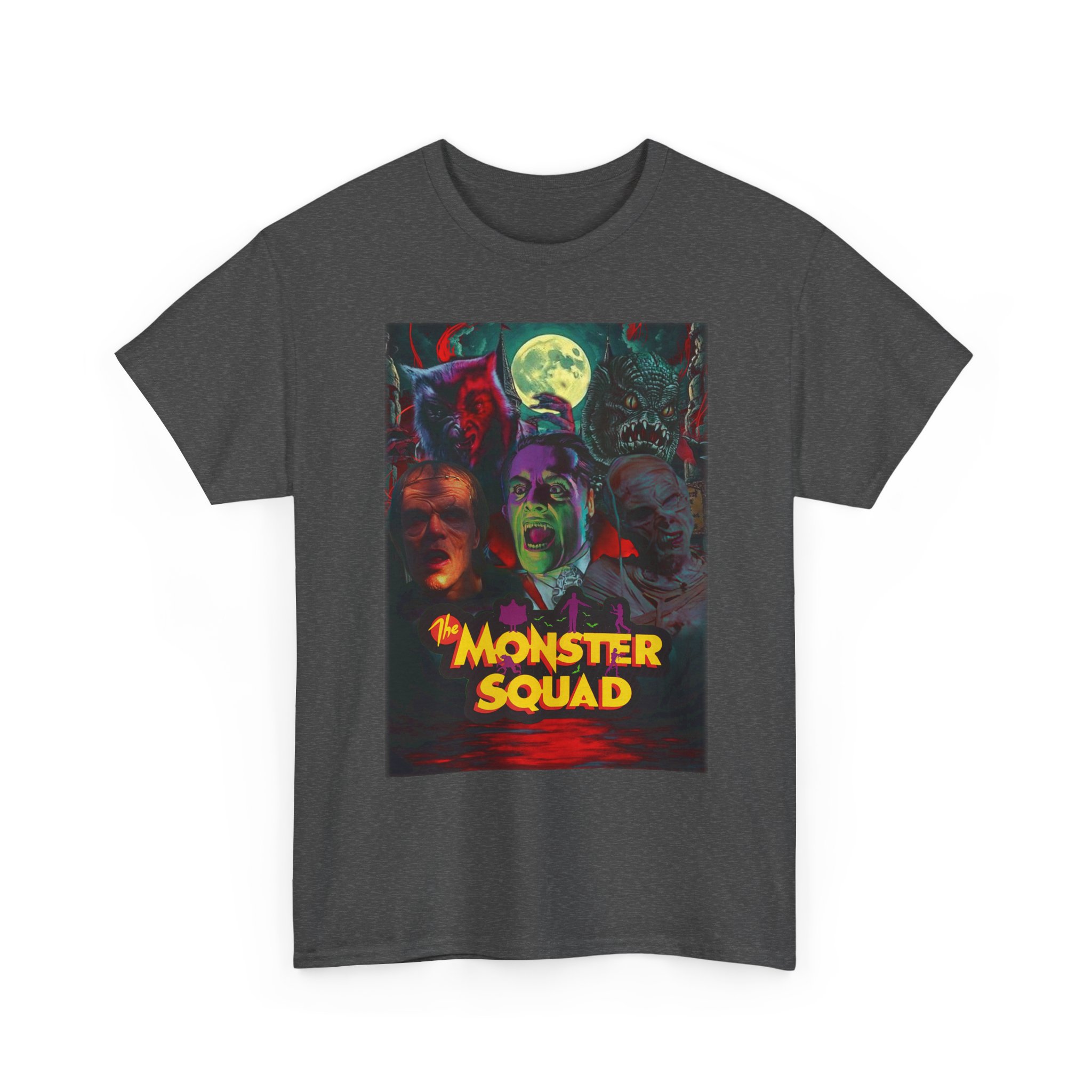This black graphic tee brings neon-soaked horror nostalgia to everyday wear. The bold, poster-style artwork layers classic monster faces under a glowing full moon, with rich reds and eerie greens that pop against the dark fabric. It feels like stepping into a late-night drive-in — grainy film, electric buzz, and the thrill of shared chills. Wear it to movie nights, horror conventions, or when you want your look to announce that you know and love cult-classic scares. The relaxed classic fit and smooth, mid-weight cotton keep the shirt comfortable for long nights out or lazy days in. Details like the ribbed collar and taped shoulders keep the silhouette sharp, while the tear-away label and quality printing make it easy to wear again and again.