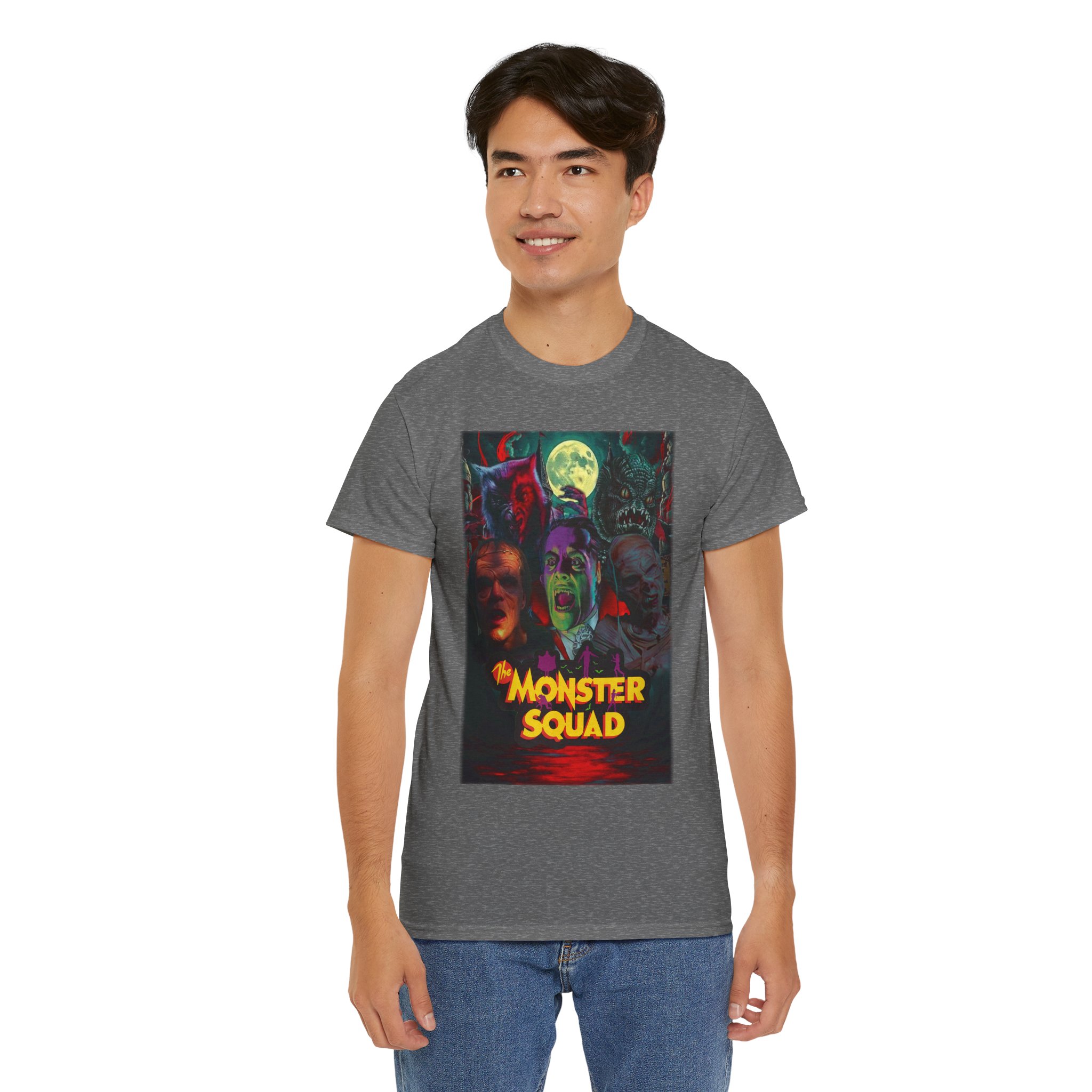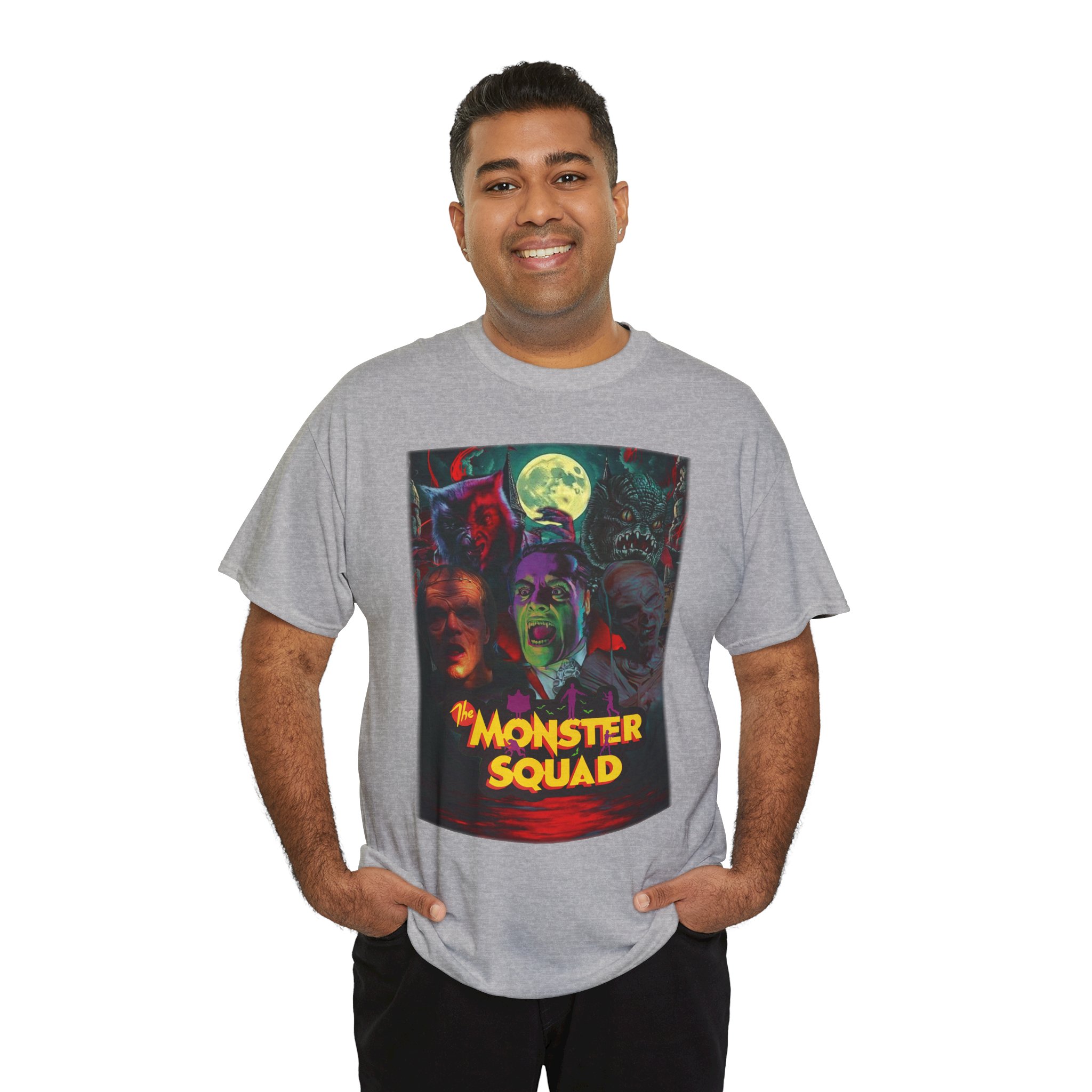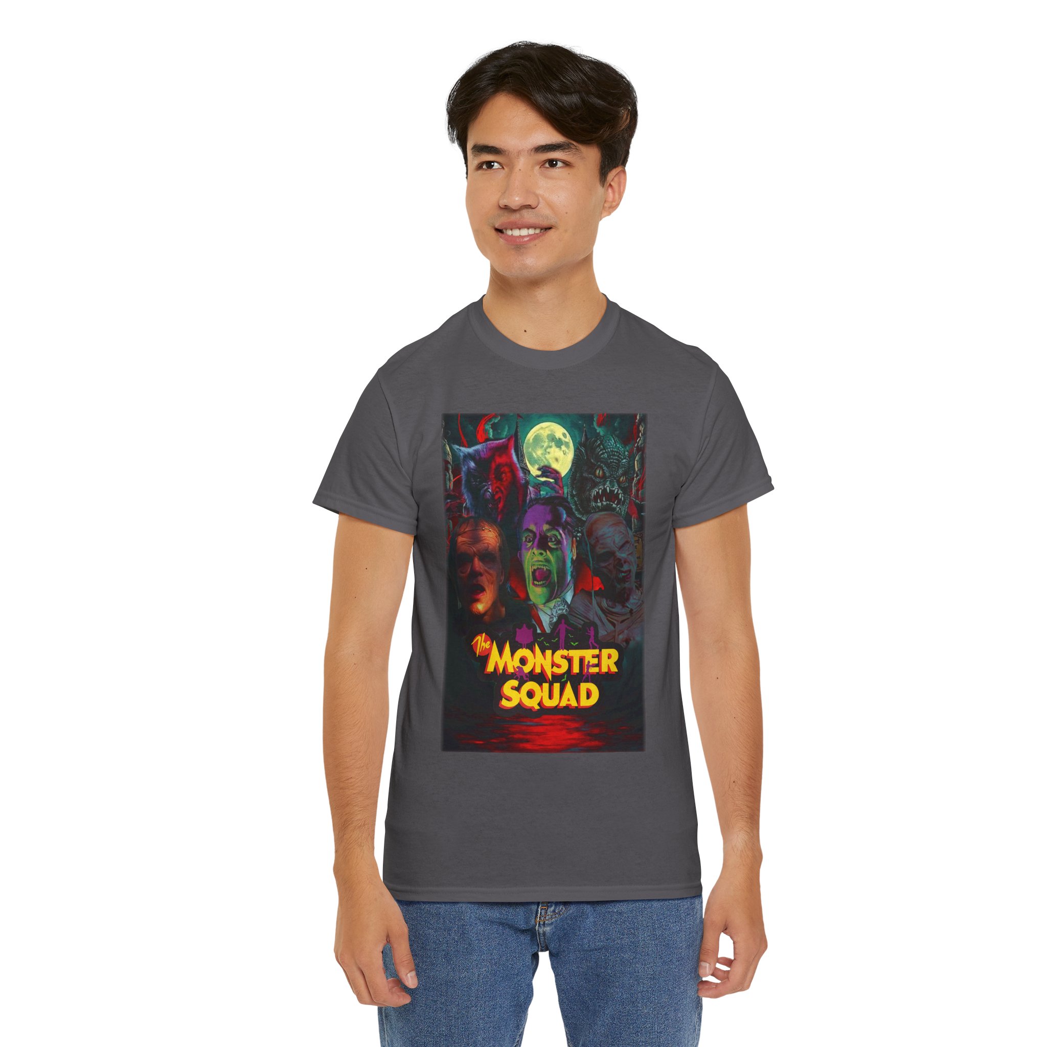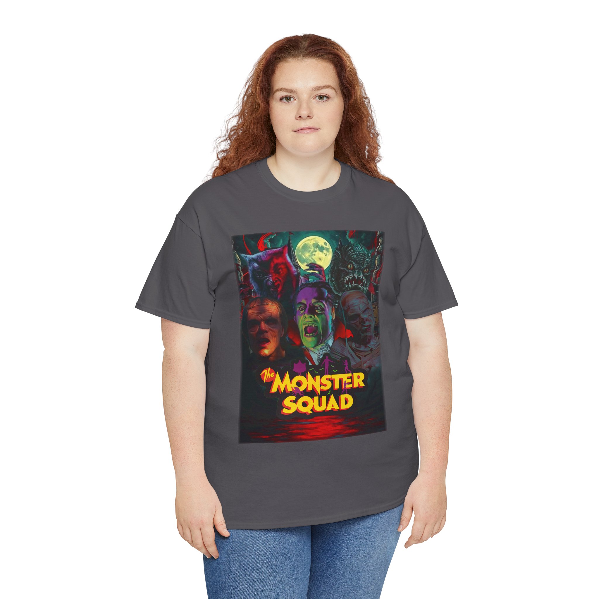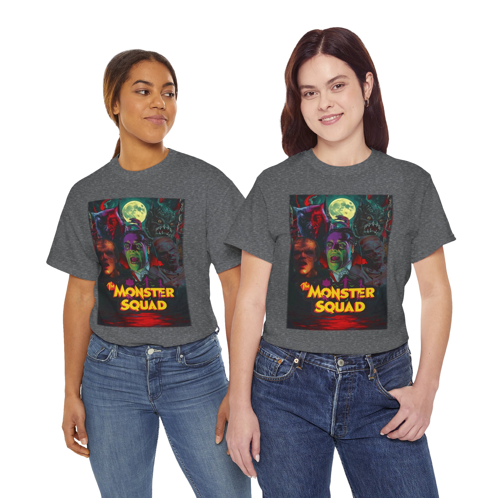 This black graphic tee brings neon-soaked horror nostalgia to everyday wear. The bold, poster-style artwork layers classic monster faces under a glowing full moon, with rich reds and eerie greens that pop against the dark fabric. It feels like stepping into a late-night drive-in — grainy film, electric buzz, and the thrill of shared chills. Wear it to movie nights, horror conventions, or when you want your look to announce that you know and love cult-classic scares. The relaxed classic fit and smooth, mid-weight cotton keep the shirt comfortable for long nights out or lazy days in. Details like the ribbed collar and taped shoulders keep the silhouette sharp, while the tear-away label and quality printing make it easy to wear again and again.