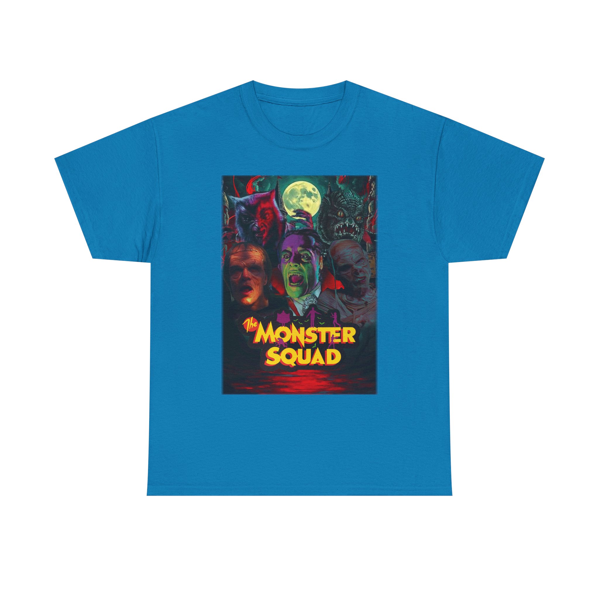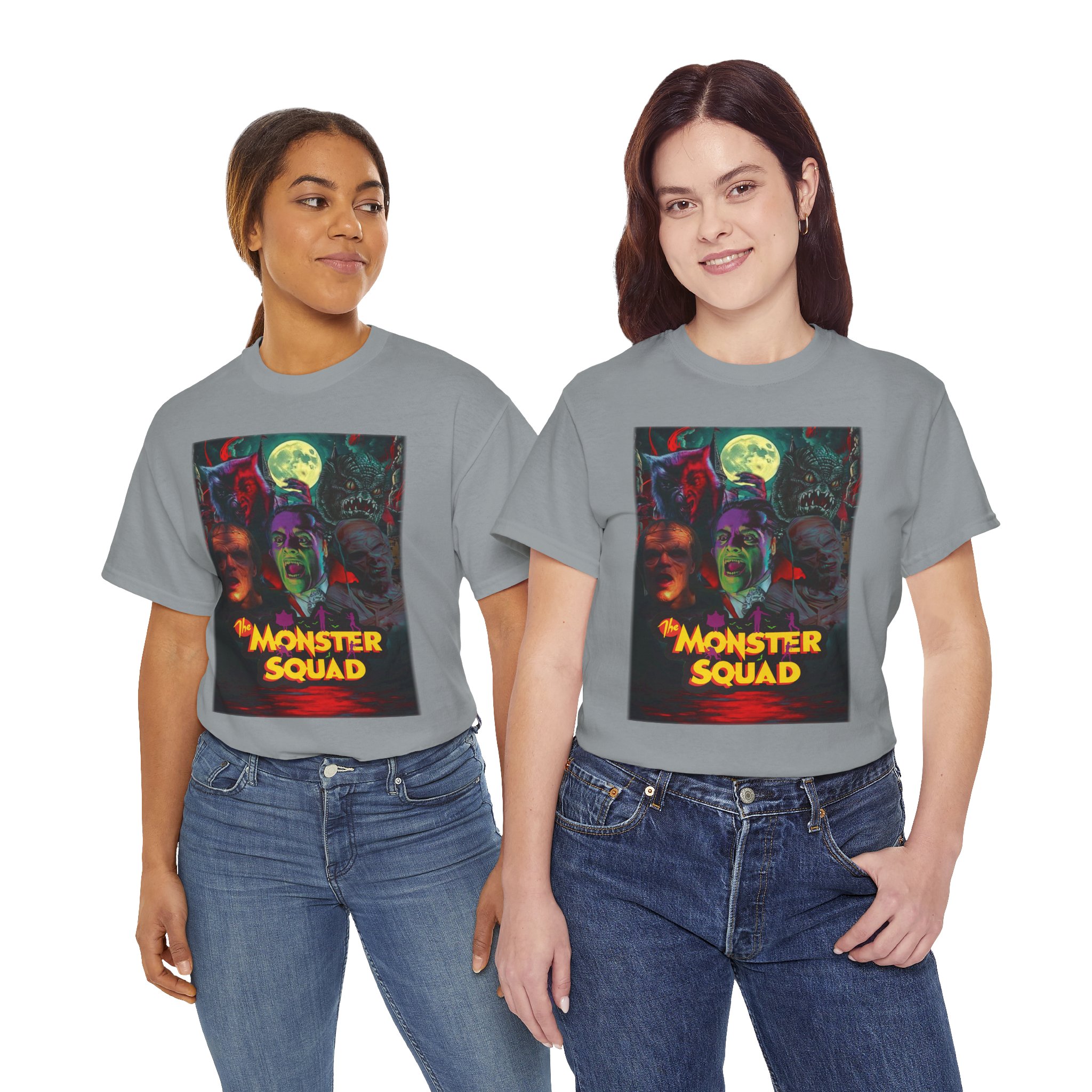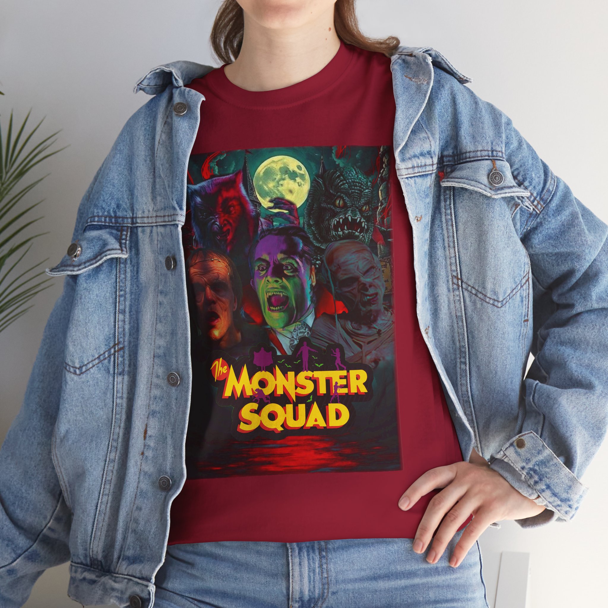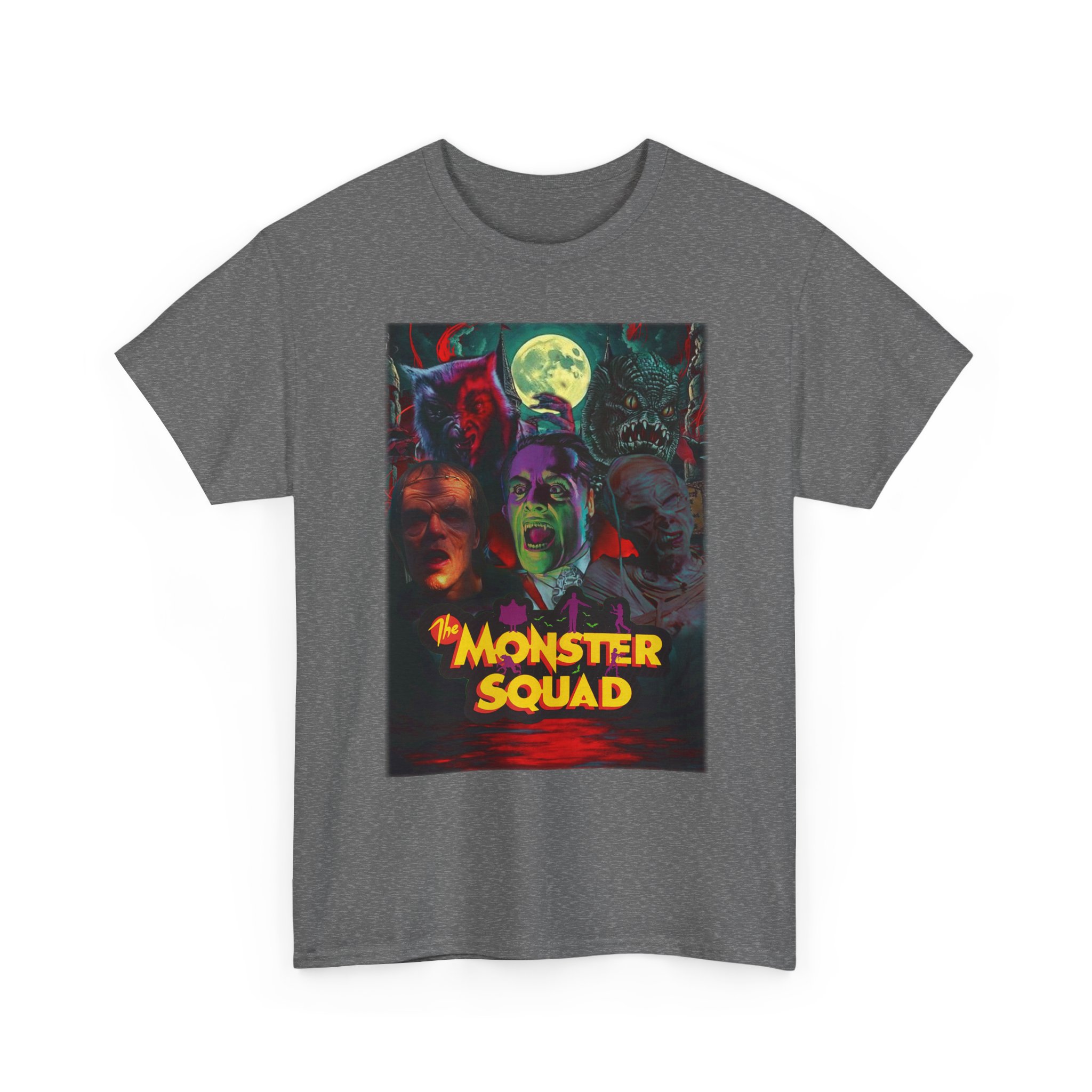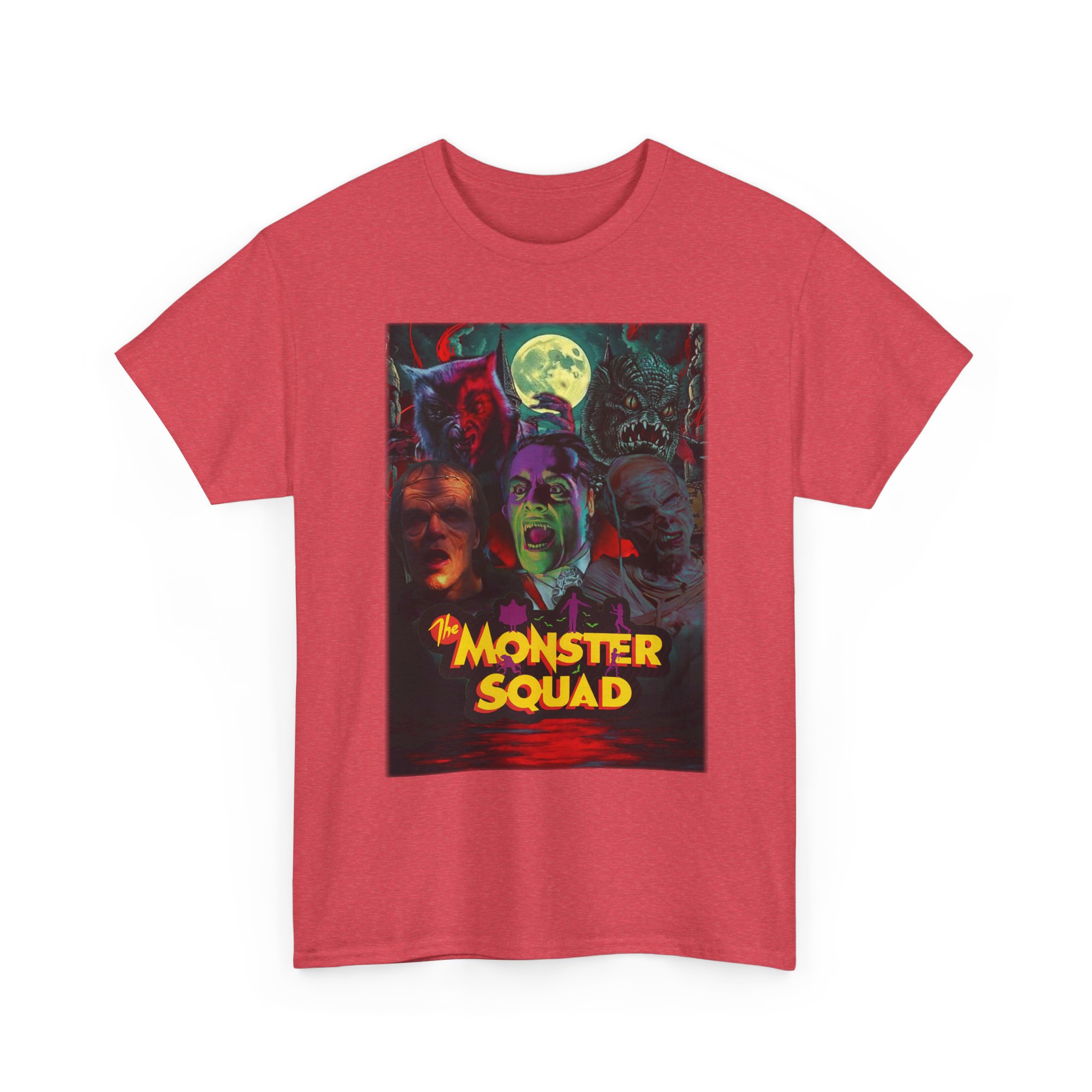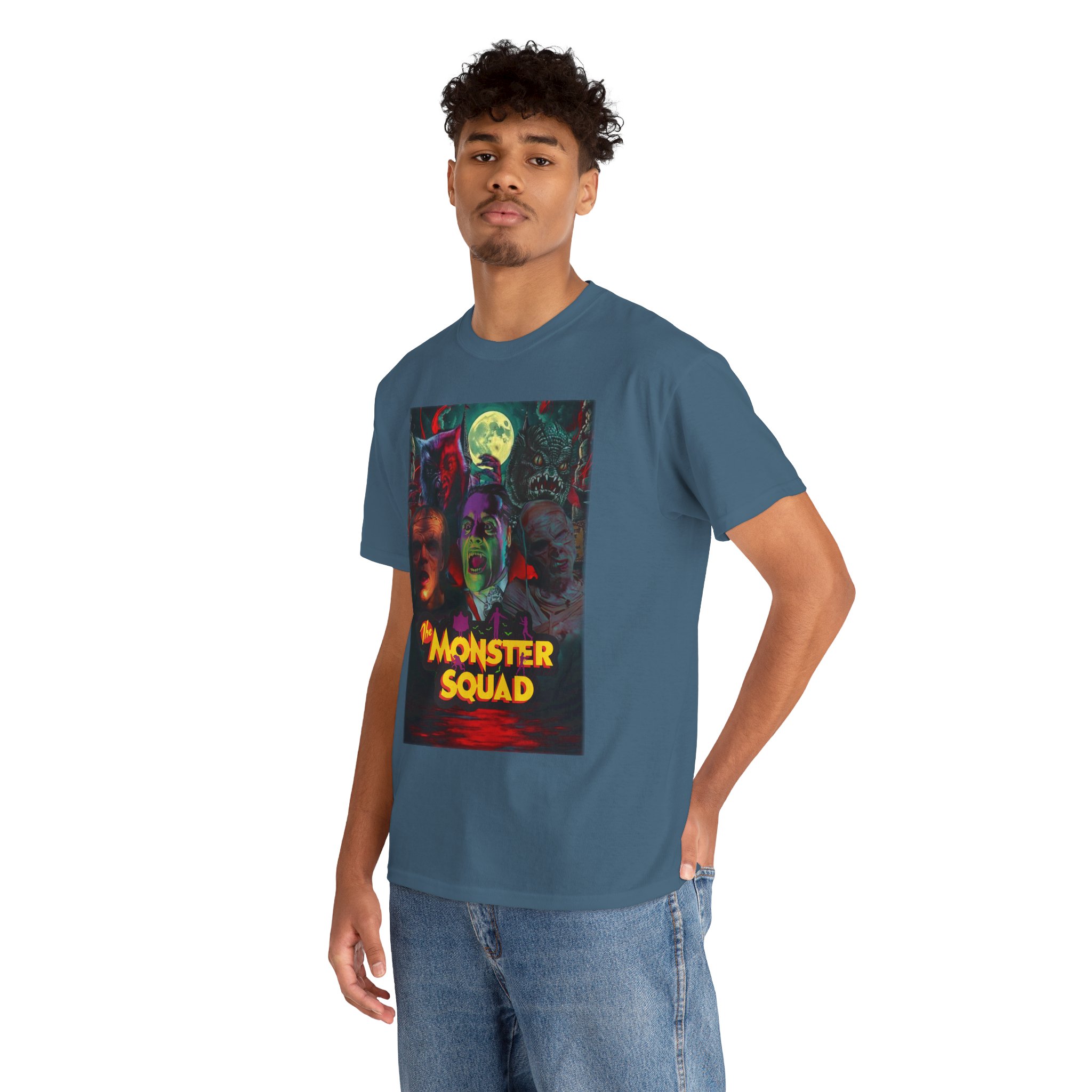 This black graphic tee brings neon-soaked horror nostalgia to everyday wear. The bold, poster-style artwork layers classic monster faces under a glowing full moon, with rich reds and eerie greens that pop against the dark fabric. It feels like stepping into a late-night drive-in — grainy film, electric buzz, and the thrill of shared chills. Wear it to movie nights, horror conventions, or when you want your look to announce that you know and love cult-classic scares. The relaxed classic fit and smooth, mid-weight cotton keep the shirt comfortable for long nights out or lazy days in. Details like the ribbed collar and taped shoulders keep the silhouette sharp, while the tear-away label and quality printing make it easy to wear again and again.