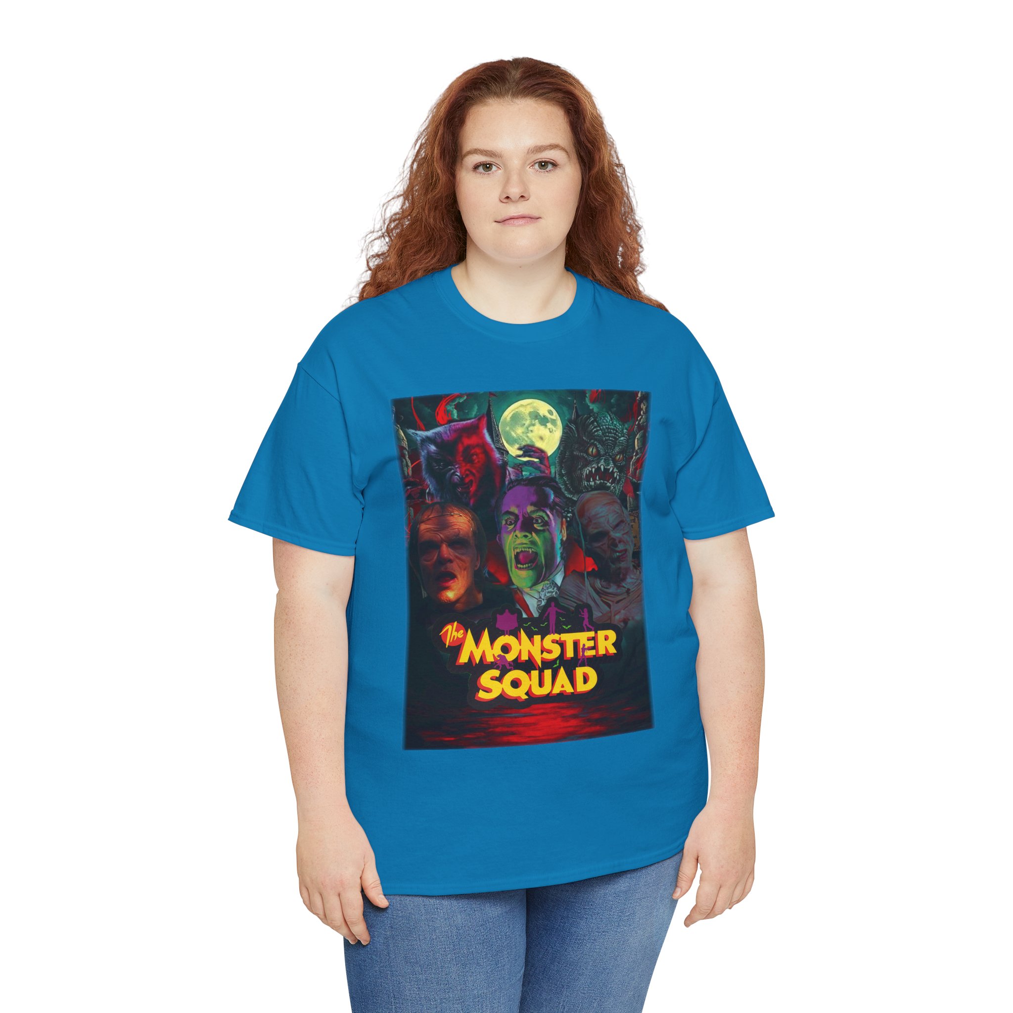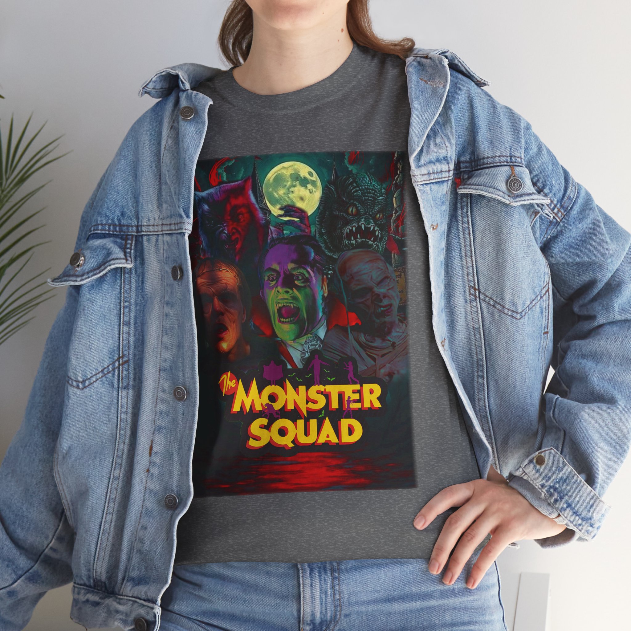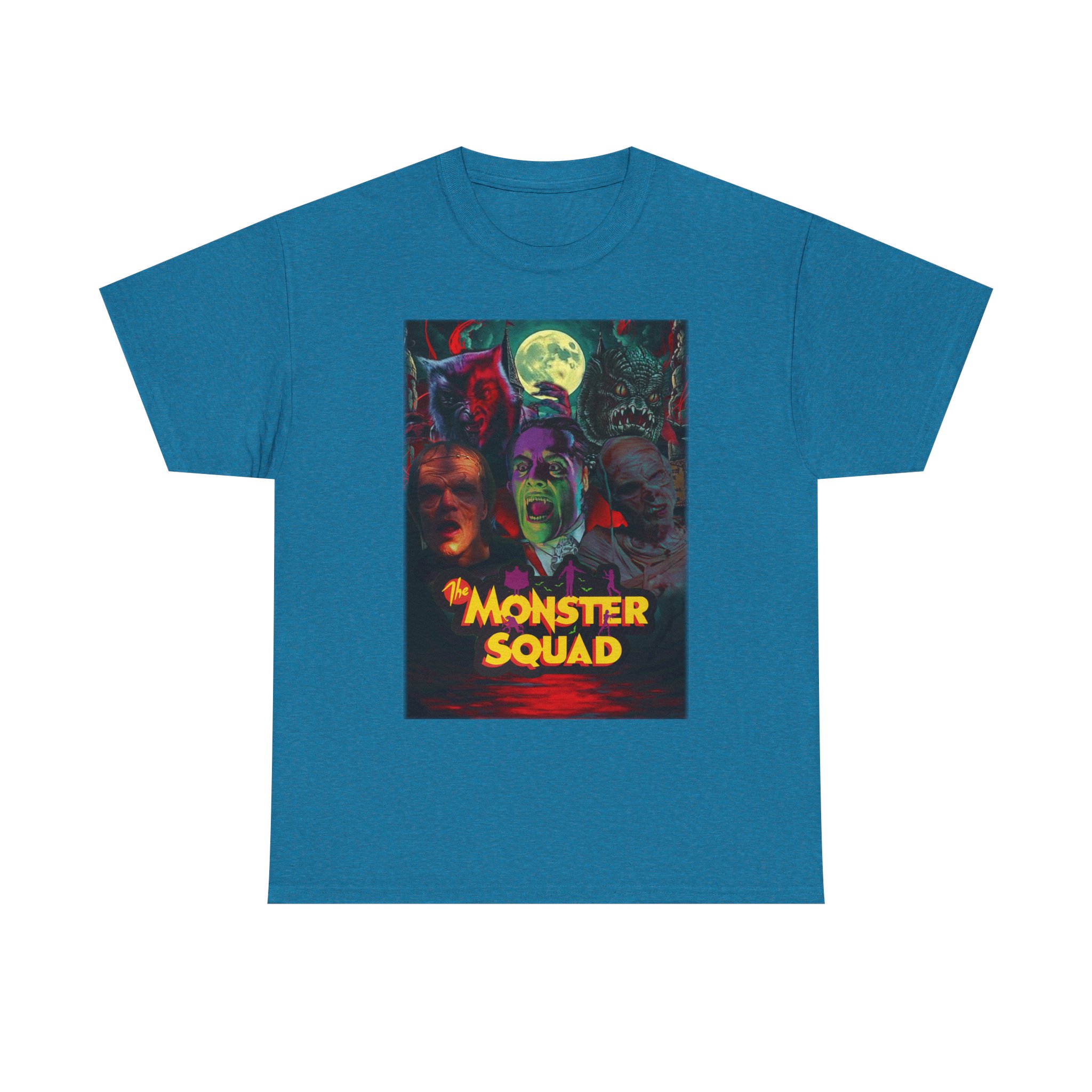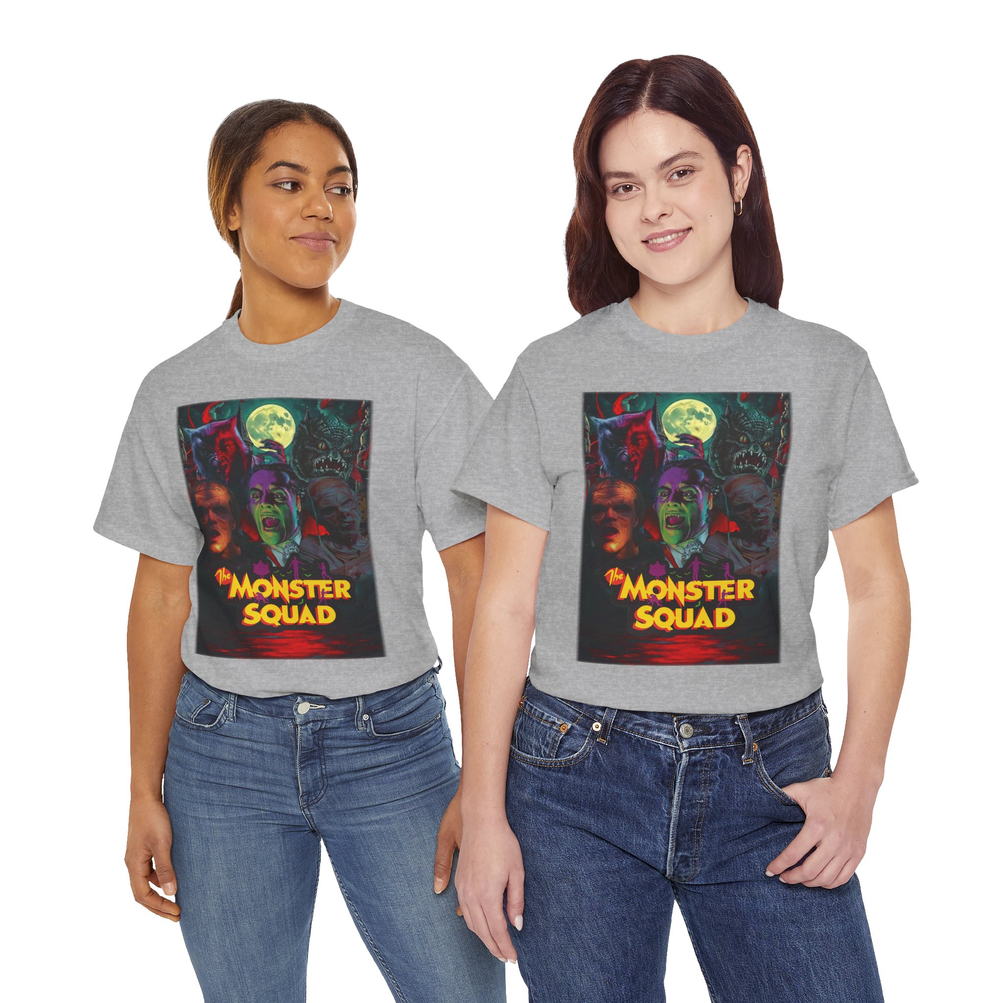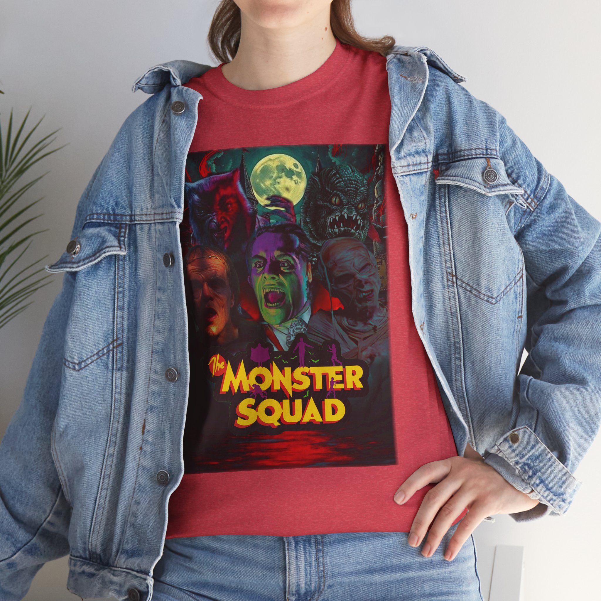 This black graphic tee brings neon-soaked horror nostalgia to everyday wear. The bold, poster-style artwork layers classic monster faces under a glowing full moon, with rich reds and eerie greens that pop against the dark fabric. It feels like stepping into a late-night drive-in — grainy film, electric buzz, and the thrill of shared chills. Wear it to movie nights, horror conventions, or when you want your look to announce that you know and love cult-classic scares. The relaxed classic fit and smooth, mid-weight cotton keep the shirt comfortable for long nights out or lazy days in. Details like the ribbed collar and taped shoulders keep the silhouette sharp, while the tear-away label and quality printing make it easy to wear again and again.