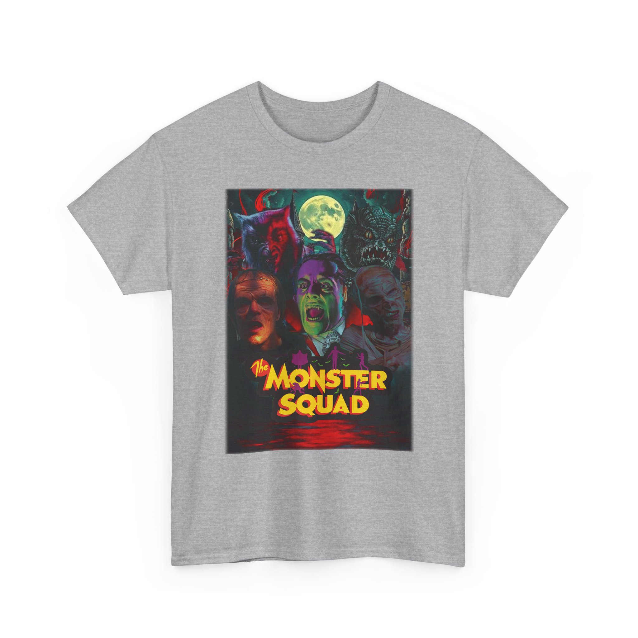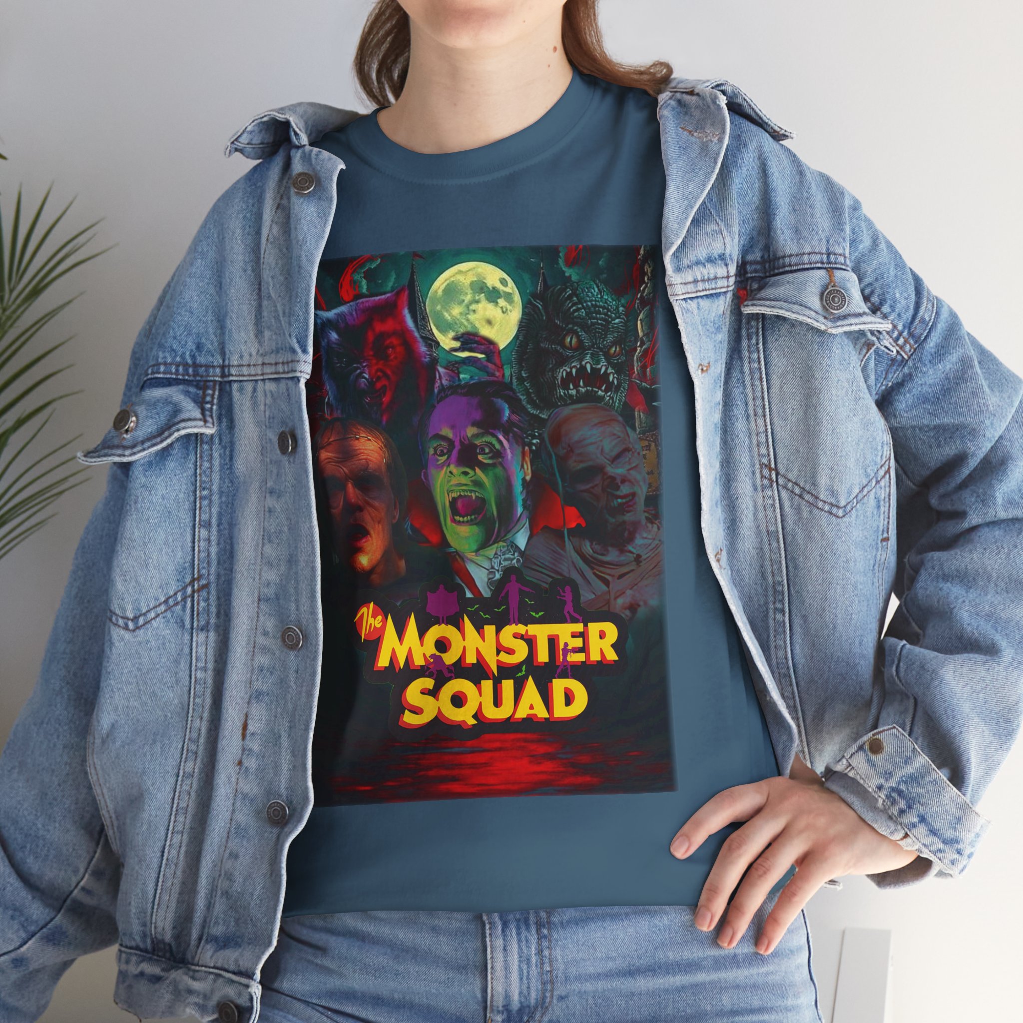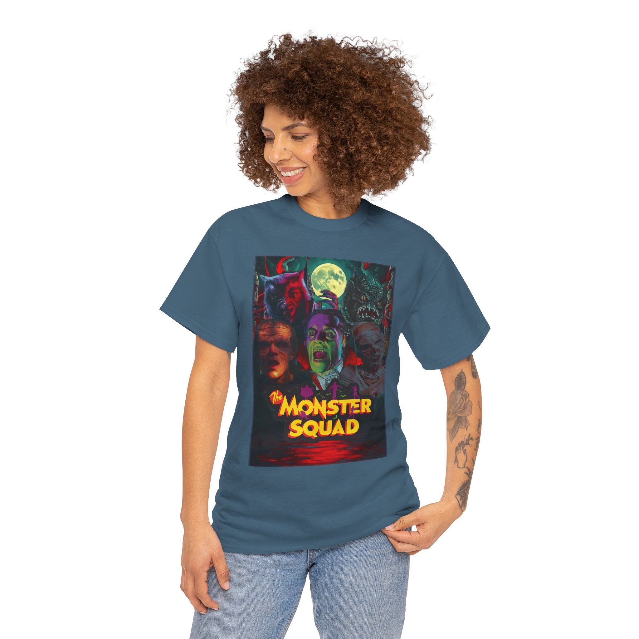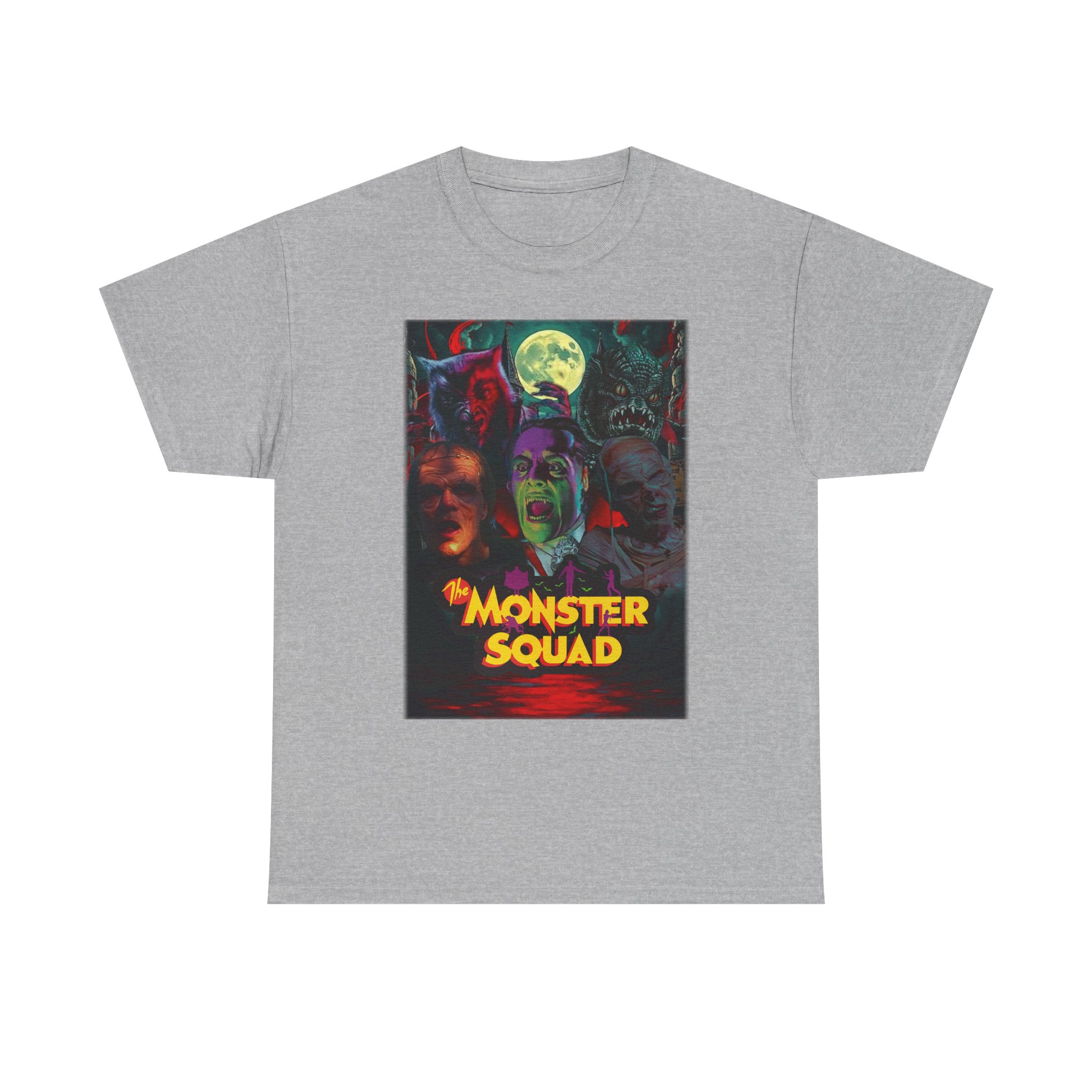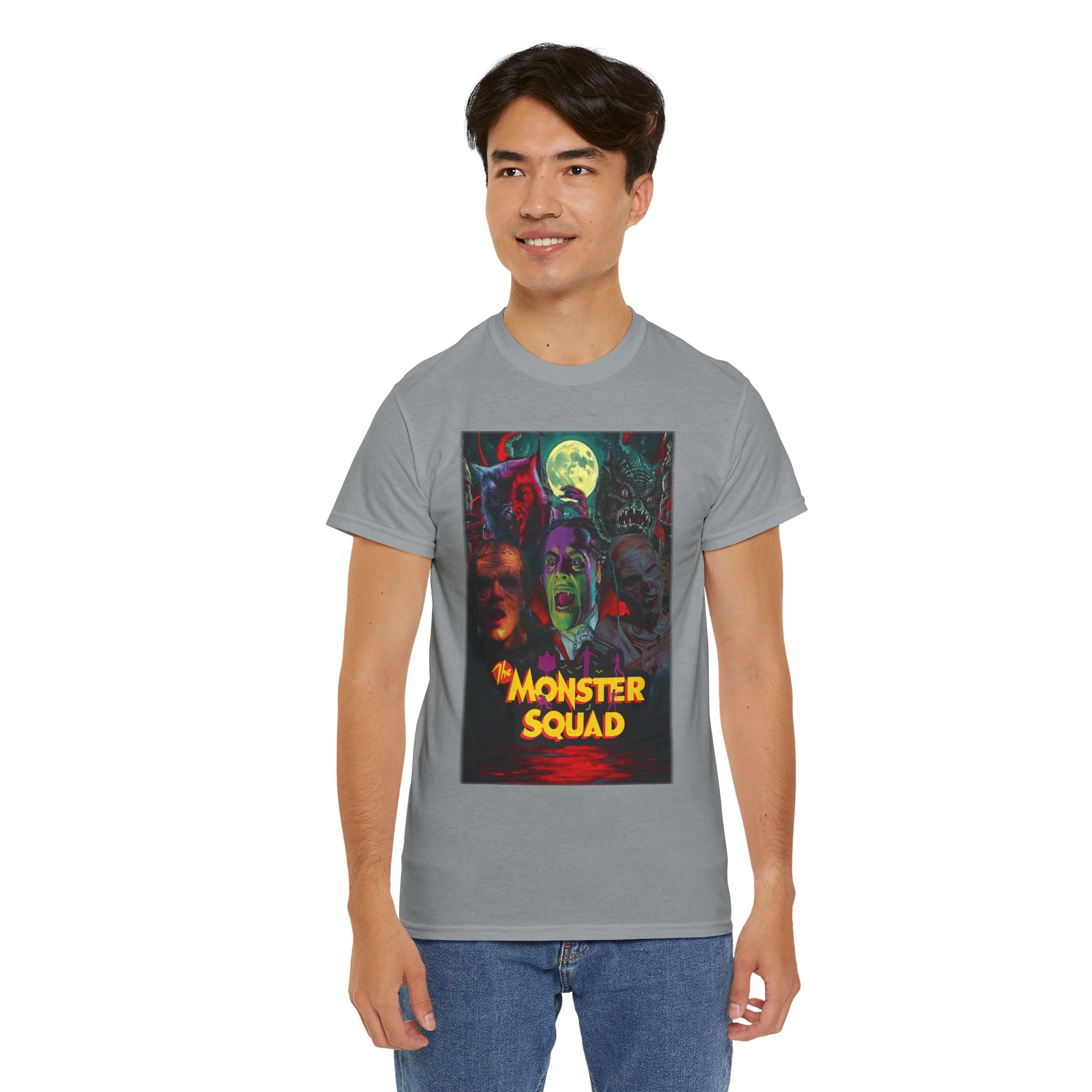 This black graphic tee brings neon-soaked horror nostalgia to everyday wear. The bold, poster-style artwork layers classic monster faces under a glowing full moon, with rich reds and eerie greens that pop against the dark fabric. It feels like stepping into a late-night drive-in — grainy film, electric buzz, and the thrill of shared chills. Wear it to movie nights, horror conventions, or when you want your look to announce that you know and love cult-classic scares. The relaxed classic fit and smooth, mid-weight cotton keep the shirt comfortable for long nights out or lazy days in. Details like the ribbed collar and taped shoulders keep the silhouette sharp, while the tear-away label and quality printing make it easy to wear again and again.