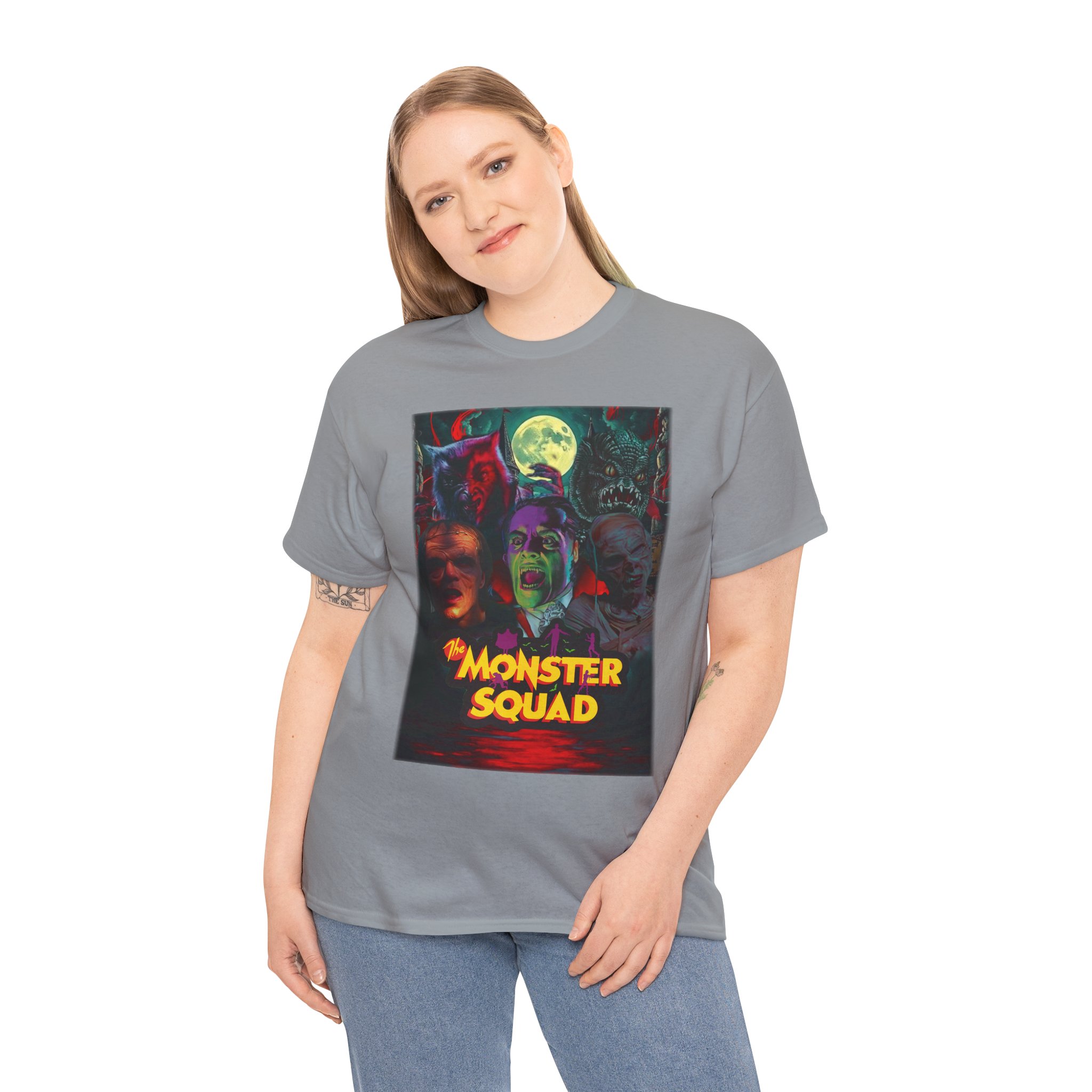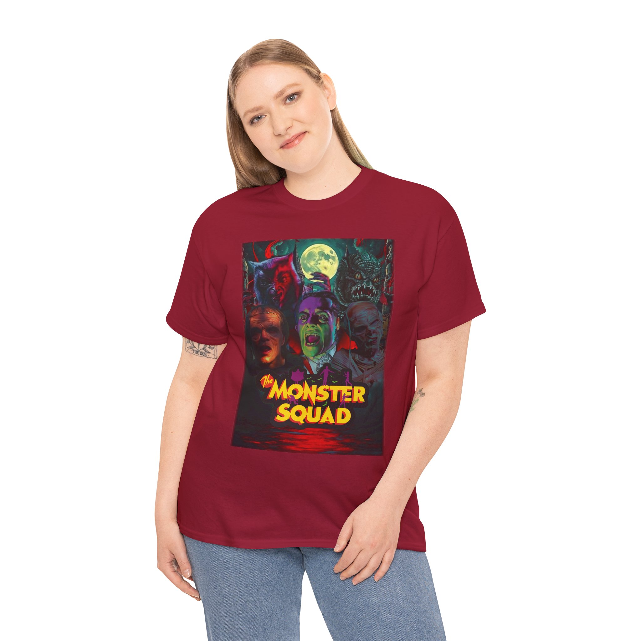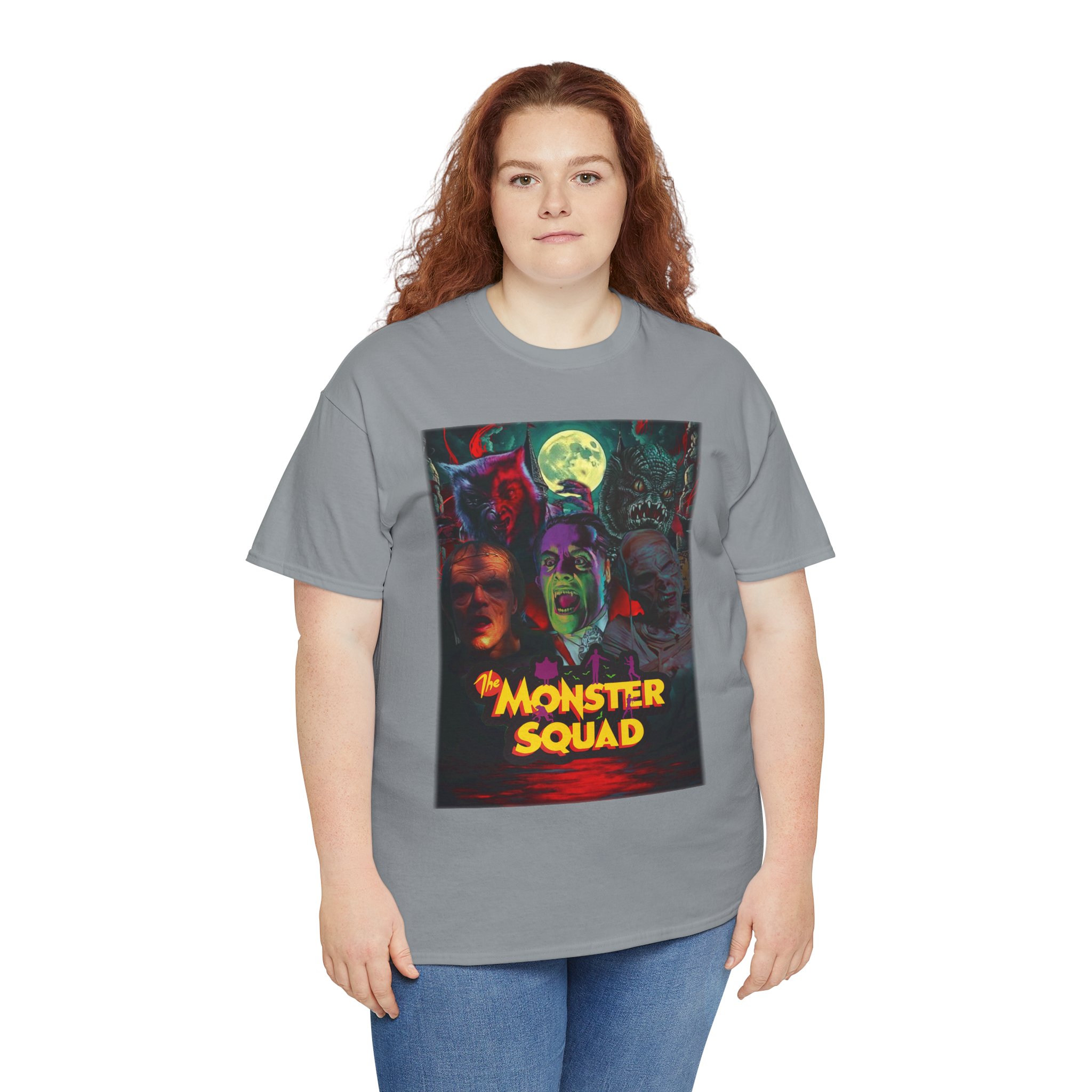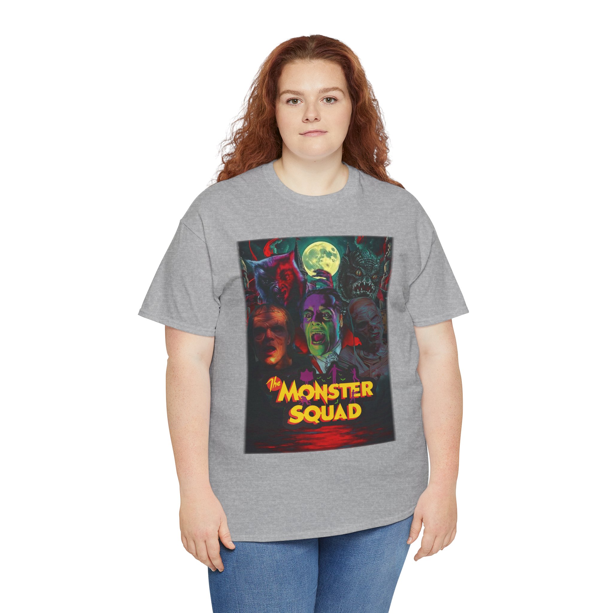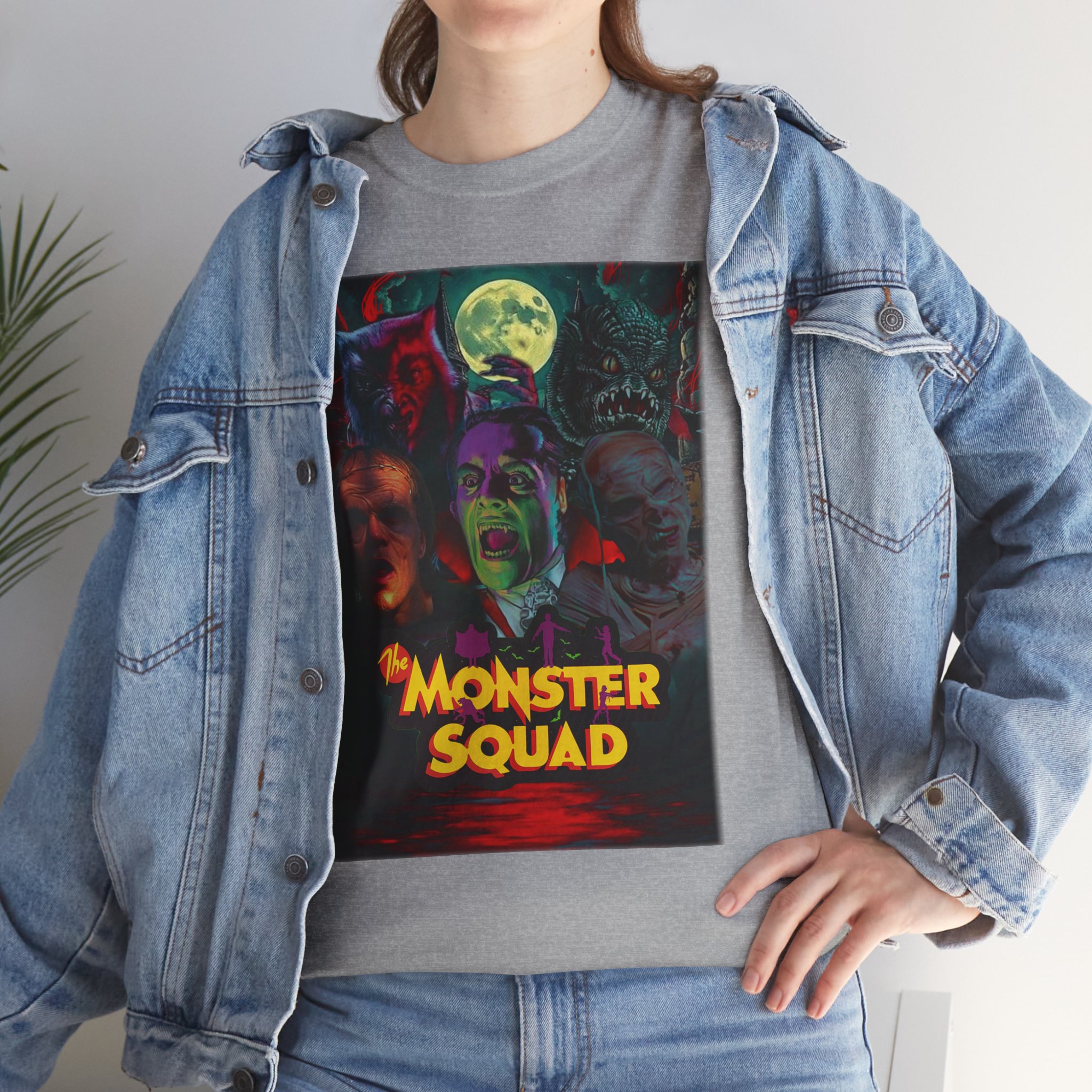 This black graphic tee brings neon-soaked horror nostalgia to everyday wear. The bold, poster-style artwork layers classic monster faces under a glowing full moon, with rich reds and eerie greens that pop against the dark fabric. It feels like stepping into a late-night drive-in — grainy film, electric buzz, and the thrill of shared chills. Wear it to movie nights, horror conventions, or when you want your look to announce that you know and love cult-classic scares. The relaxed classic fit and smooth, mid-weight cotton keep the shirt comfortable for long nights out or lazy days in. Details like the ribbed collar and taped shoulders keep the silhouette sharp, while the tear-away label and quality printing make it easy to wear again and again.