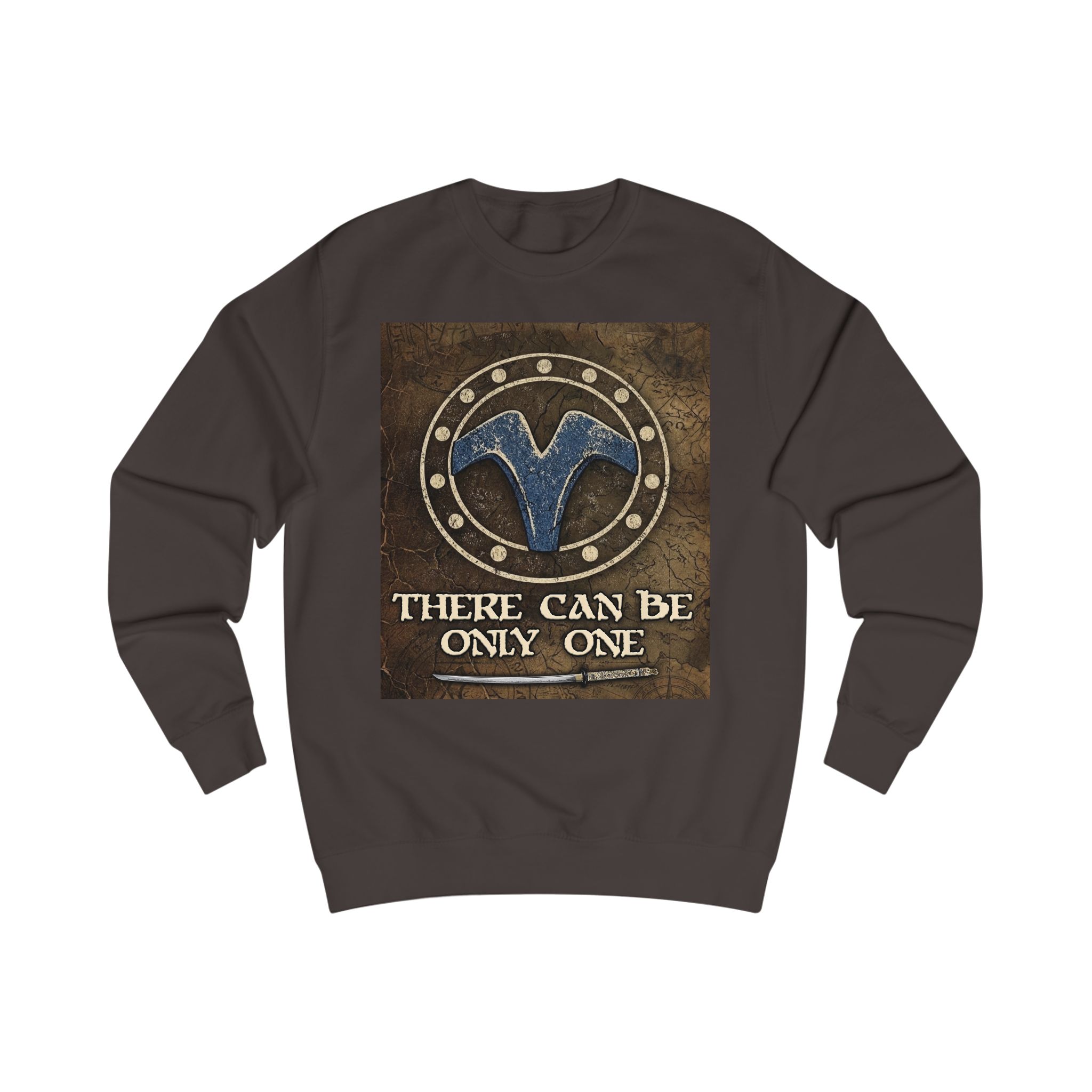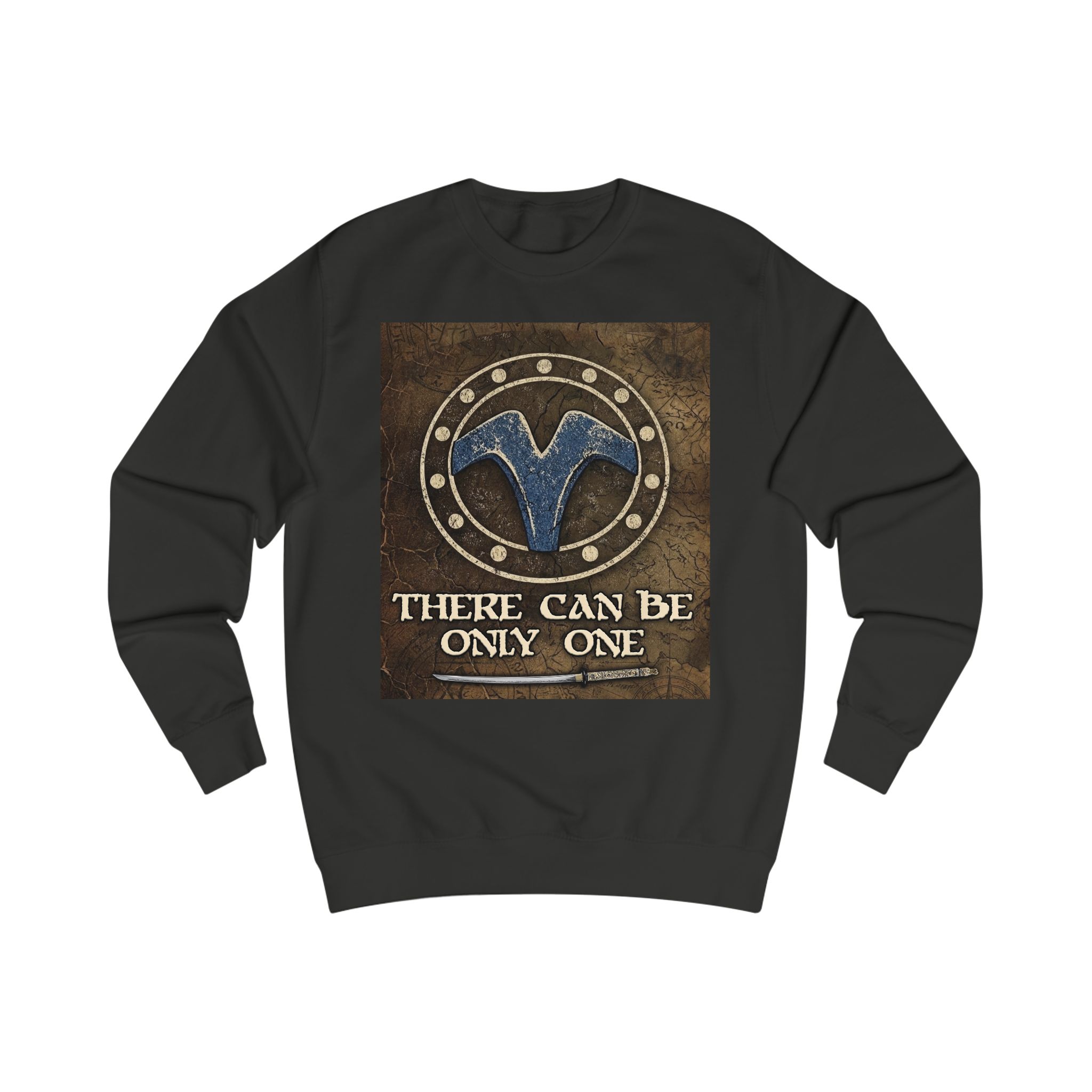 This midweight sweatshirt brings a rugged, mythic vibe to everyday wear. The front features a weathered emblem and the phrase “There Can Be Only One,” set against a distressed leather-like backdrop that reads like a banner from a long road or a battle-worn crest. The fit is relaxed but structured, with ribbed collar and cuffs that hold shape, side seams for durability, and a soft, substantial fabric that warms without weighing you down. It settles into the wardrobe as a go-to layer for chilly mornings, late-night drives, and moments when you want your look to feel storied and unmistakable.