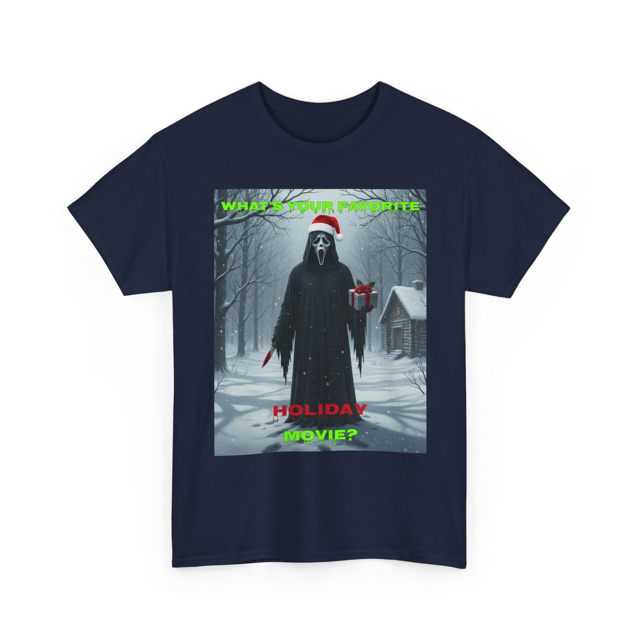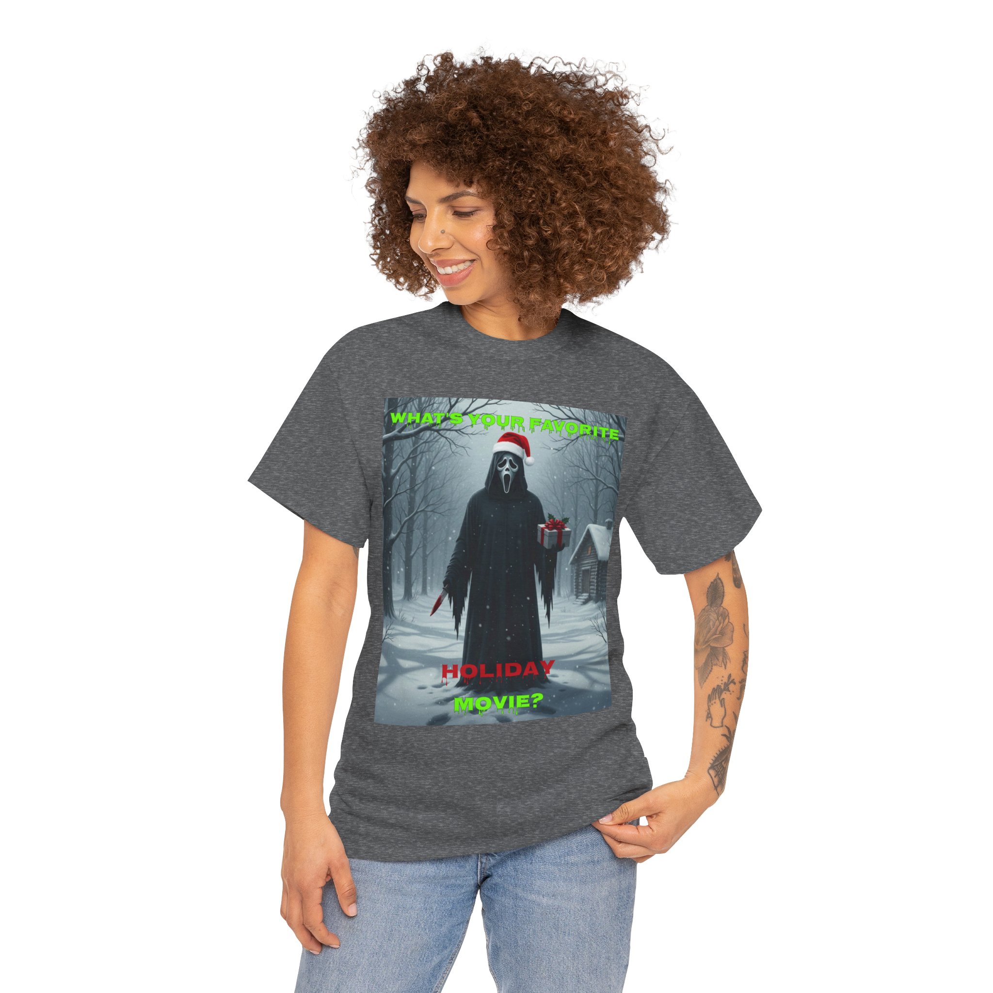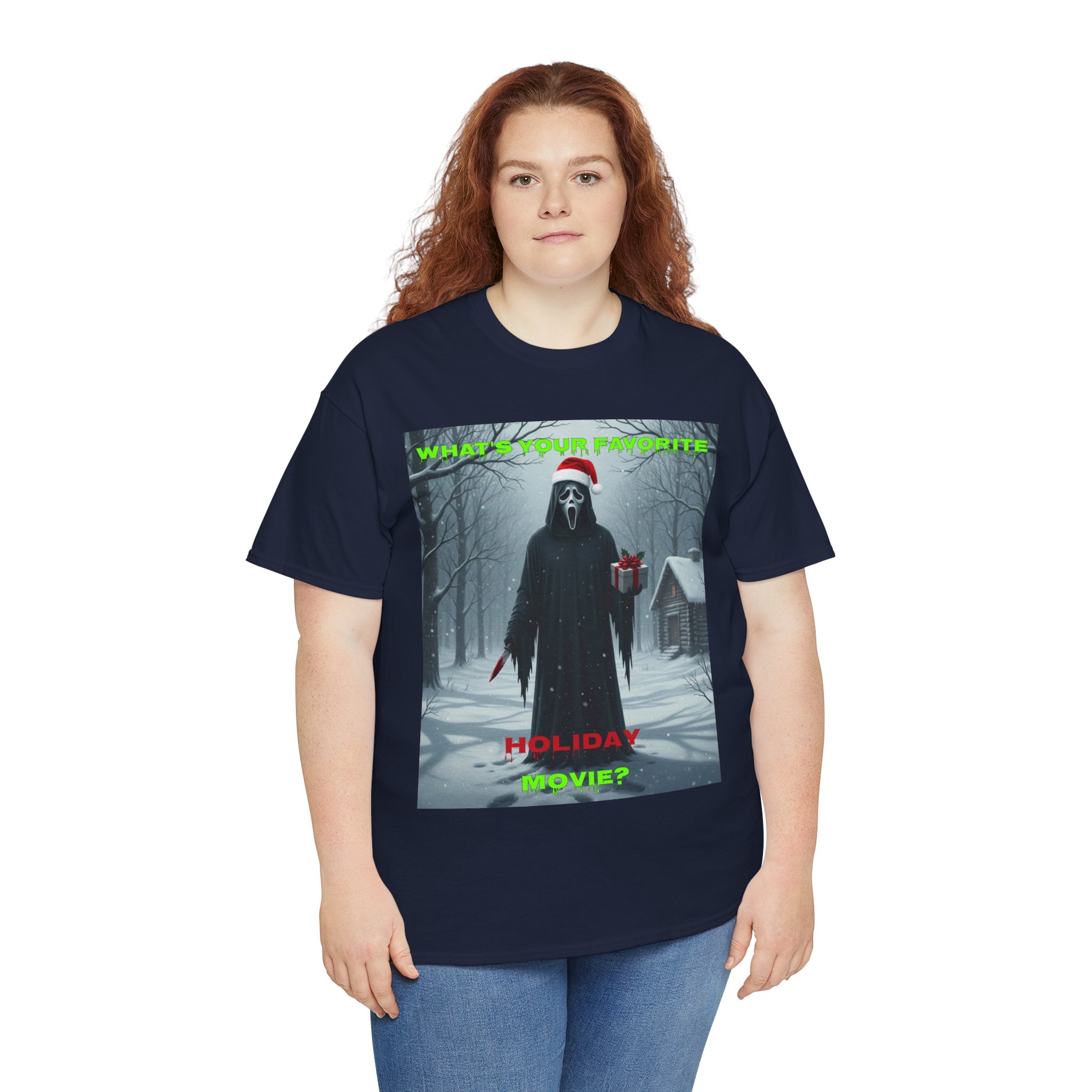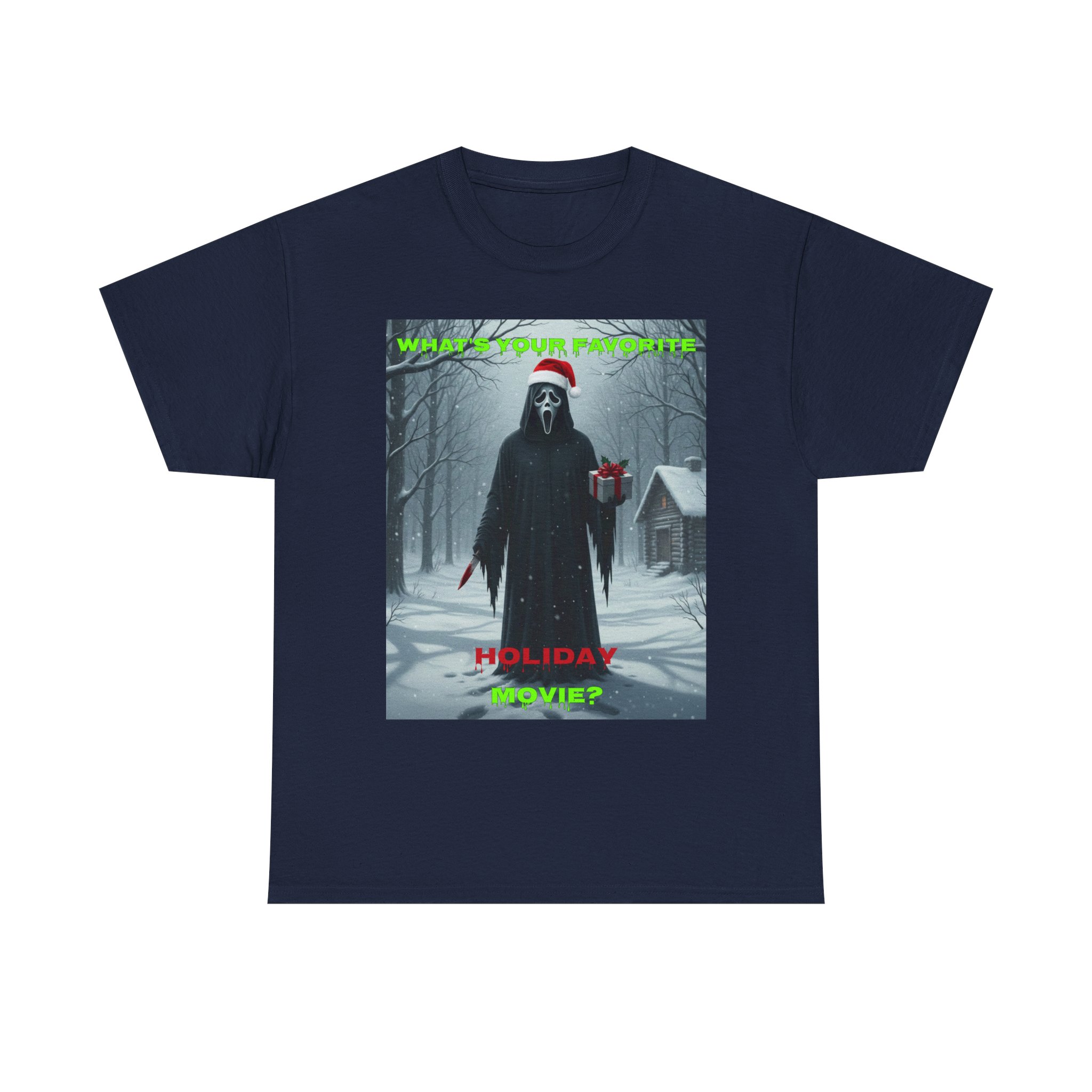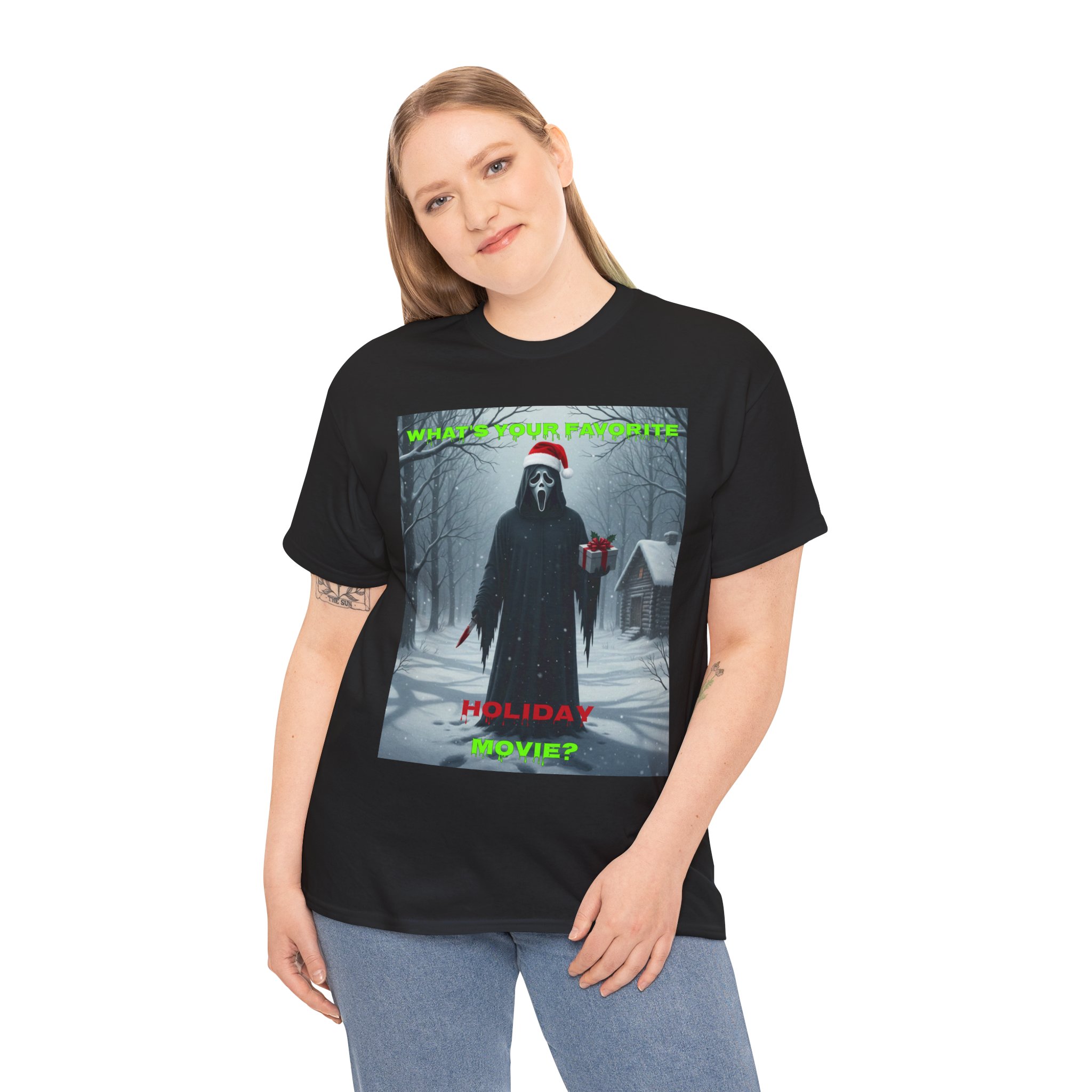 Remember the thrill of the opening credits and that sudden, delicious chill as the first scream cuts the silence? This tee brings that electric, spooky-fun energy into everyday wear. A bold Ghost Face silhouette and the cheeky line about favorite holiday movies sit crisp on the chest — a wink to late-night horror fans and people who trade cozy traditions for jump-scare marathons. It layers easily under hoodies or stands alone with jeans; wear it to movie nights, campfire screenings, or while wrapping presents with a soundtrack of cult classics. Comfortable, understated, and a little bit wicked — it’s for anyone who loves the goosebumps as much as the popcorn.