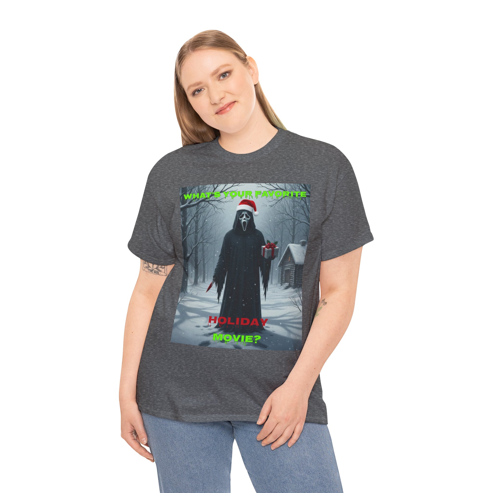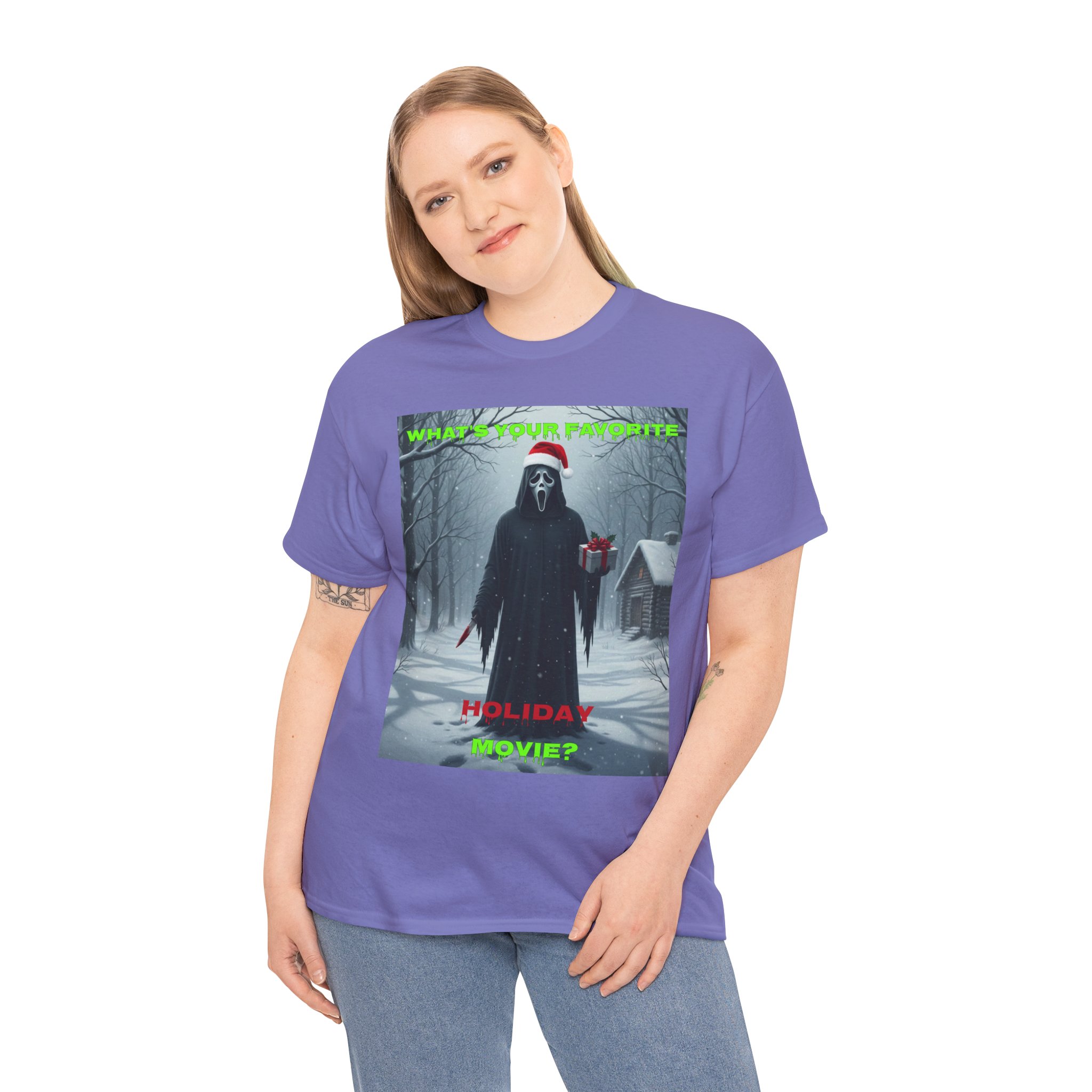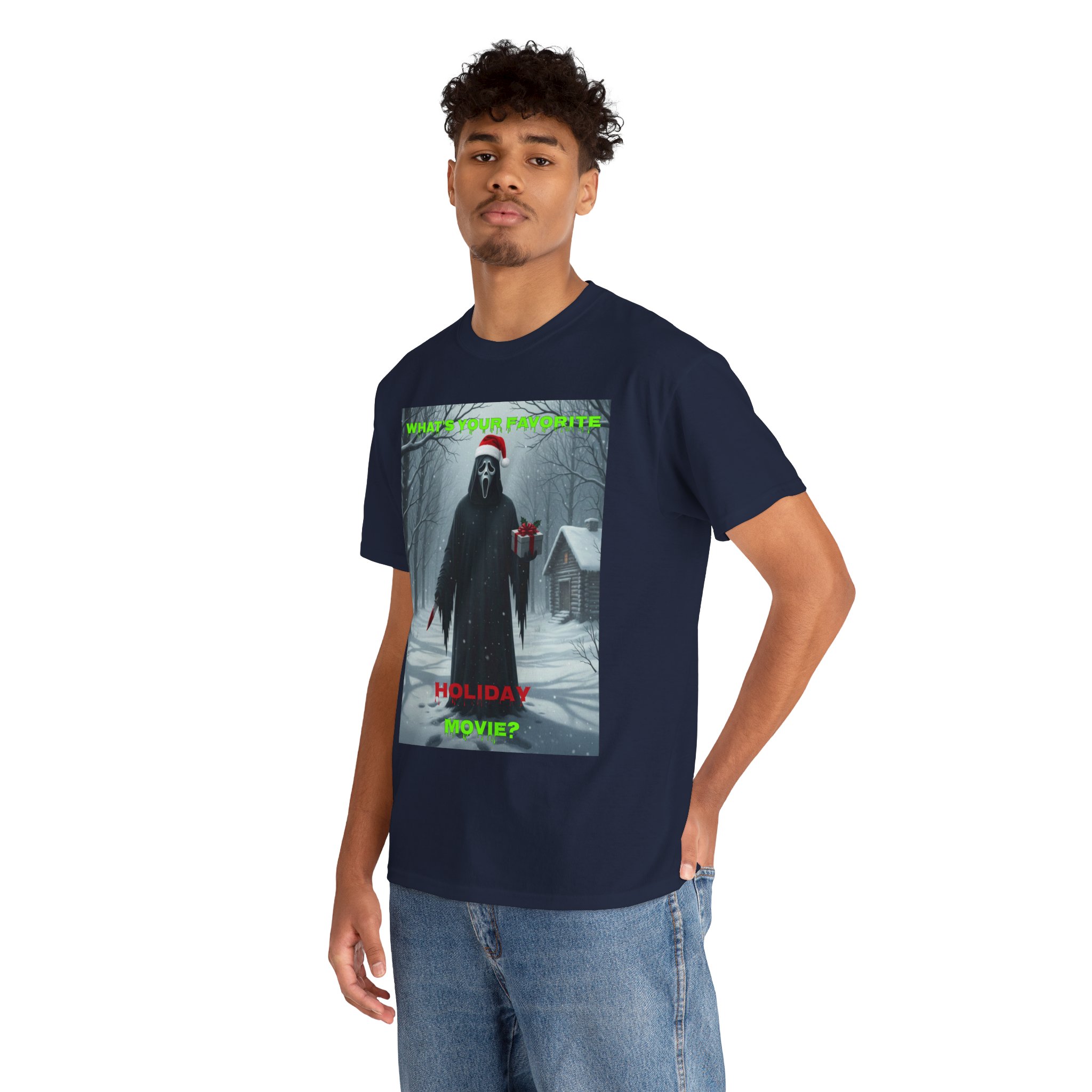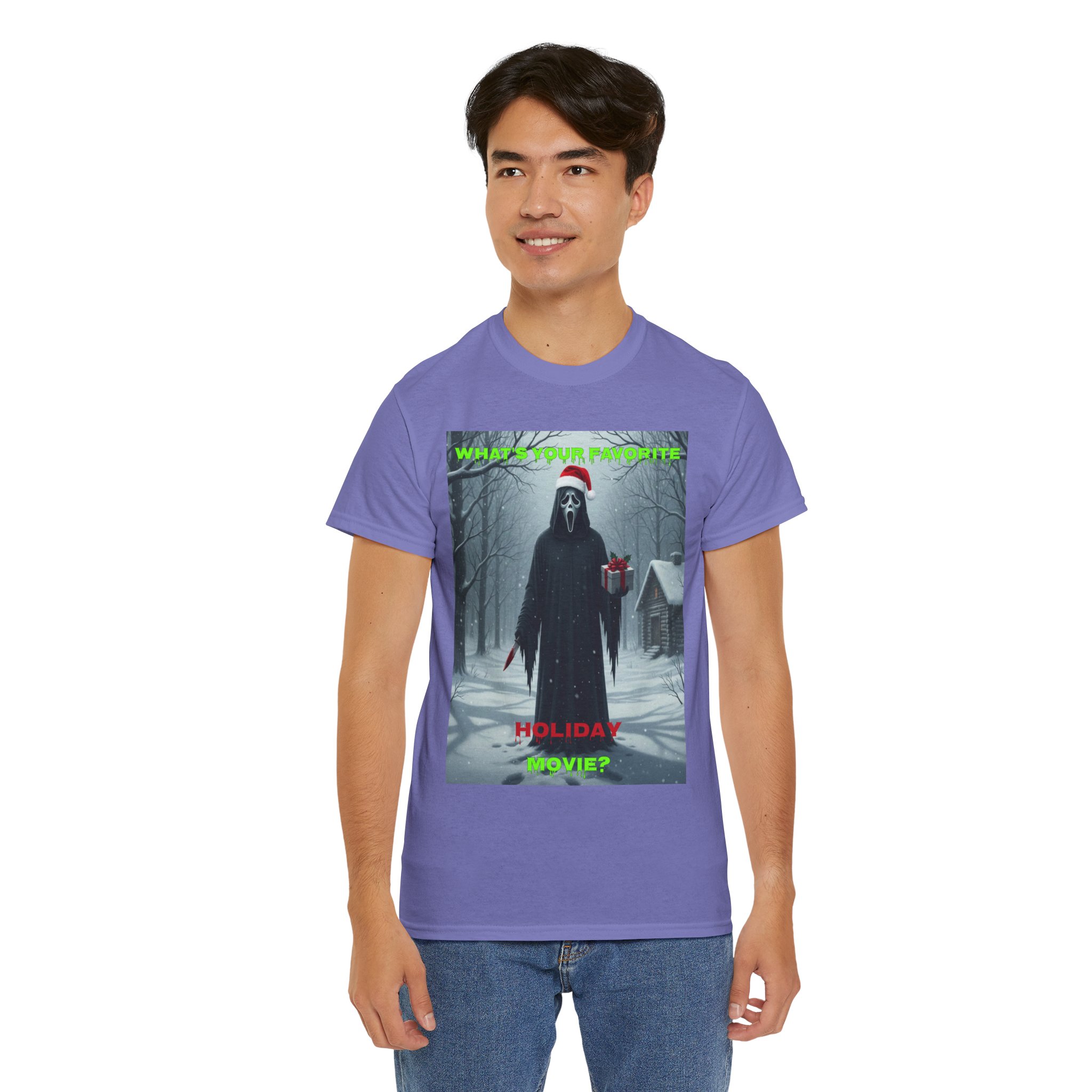 Remember the thrill of the opening credits and that sudden, delicious chill as the first scream cuts the silence? This tee brings that electric, spooky-fun energy into everyday wear. A bold Ghost Face silhouette and the cheeky line about favorite holiday movies sit crisp on the chest — a wink to late-night horror fans and people who trade cozy traditions for jump-scare marathons. It layers easily under hoodies or stands alone with jeans; wear it to movie nights, campfire screenings, or while wrapping presents with a soundtrack of cult classics. Comfortable, understated, and a little bit wicked — it’s for anyone who loves the goosebumps as much as the popcorn.