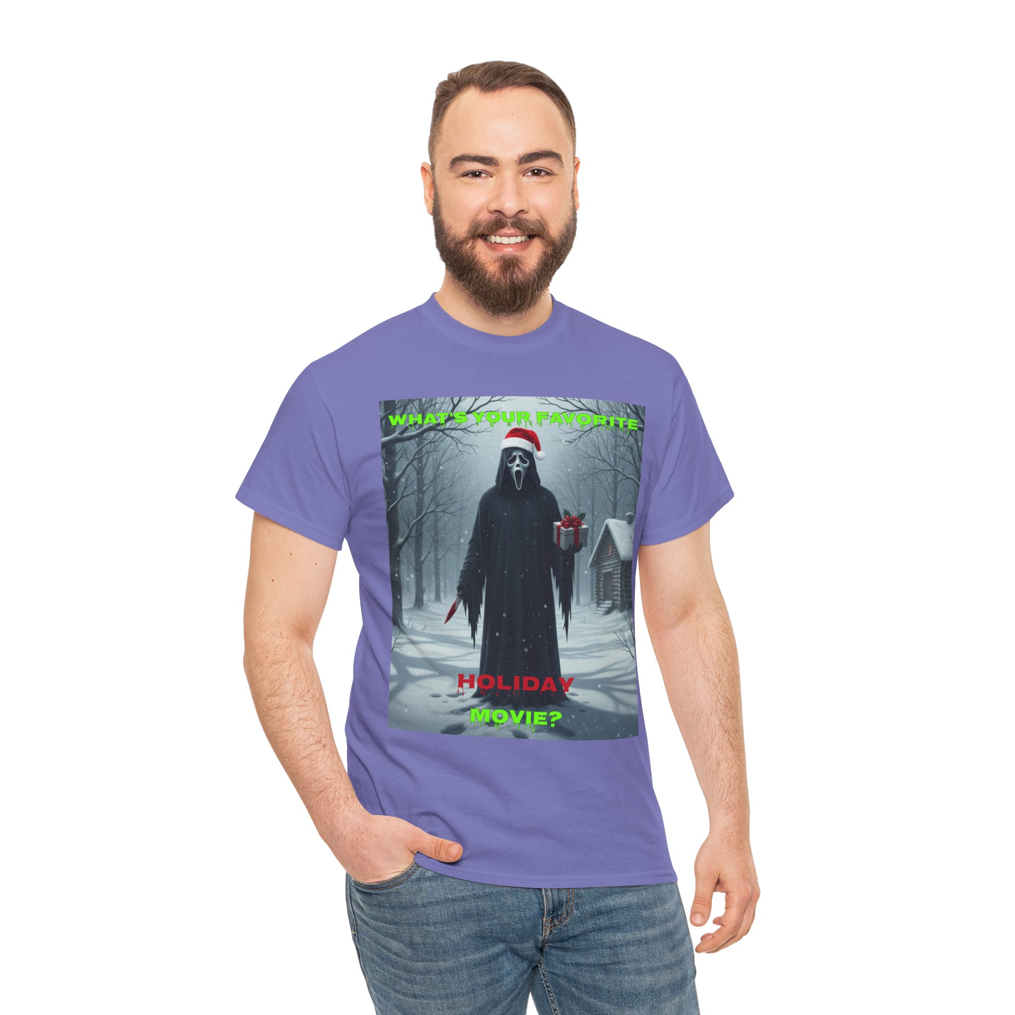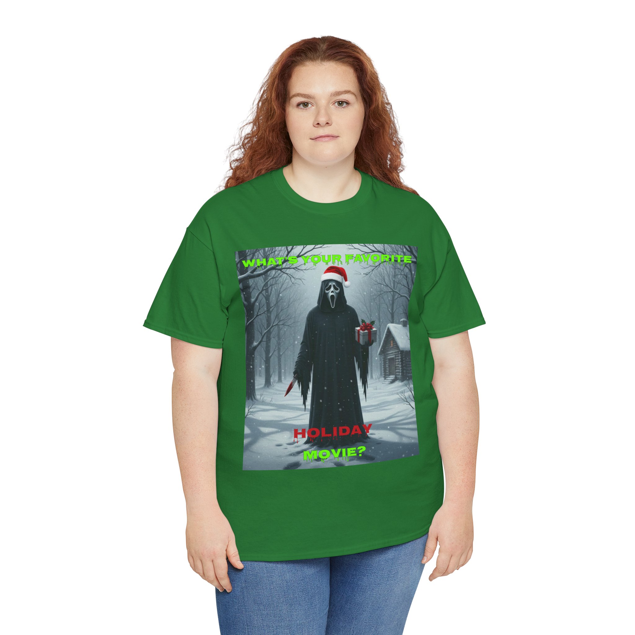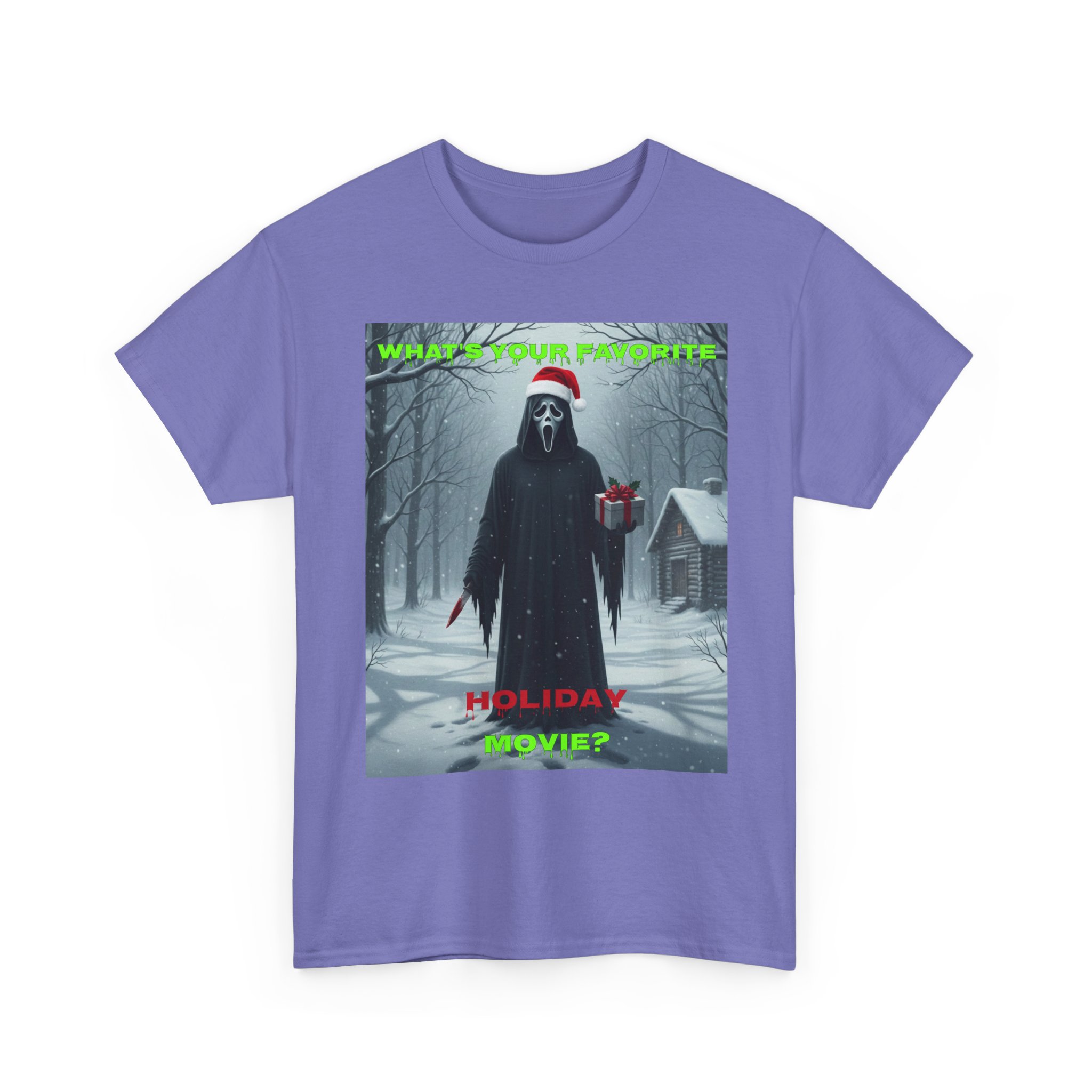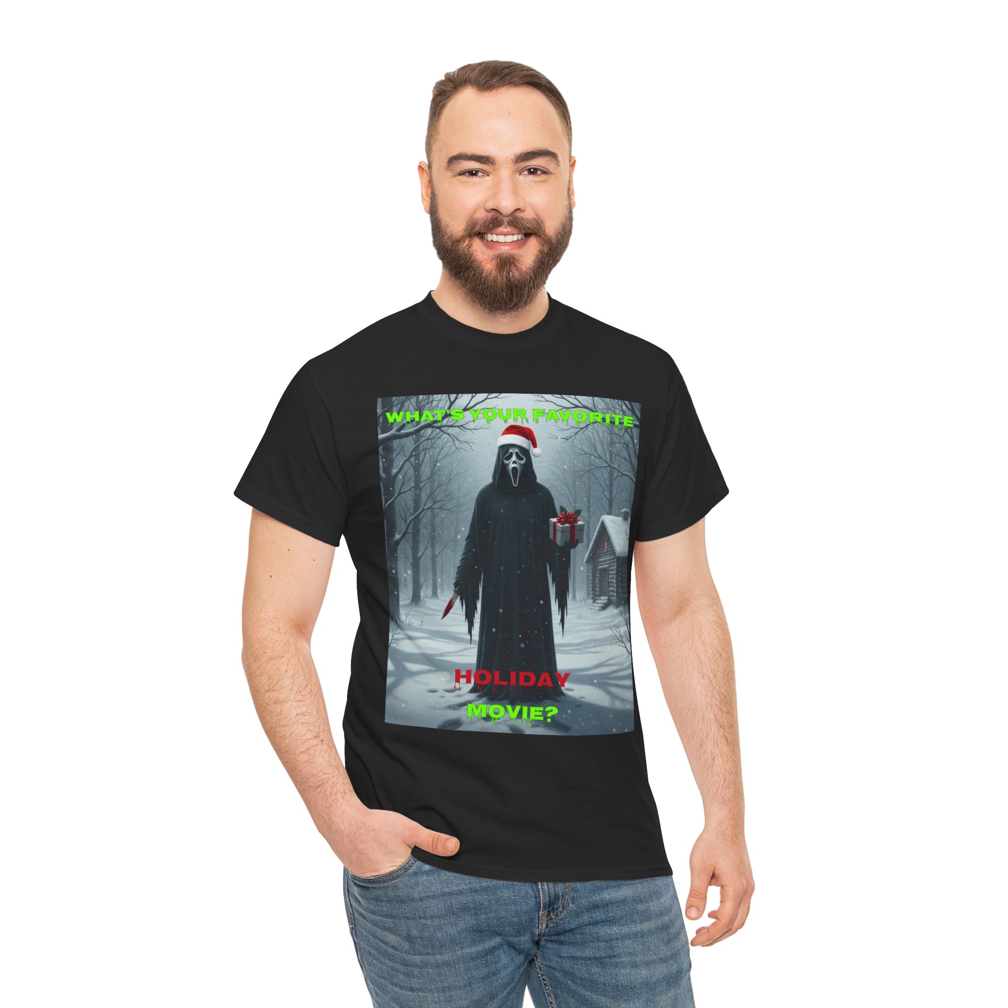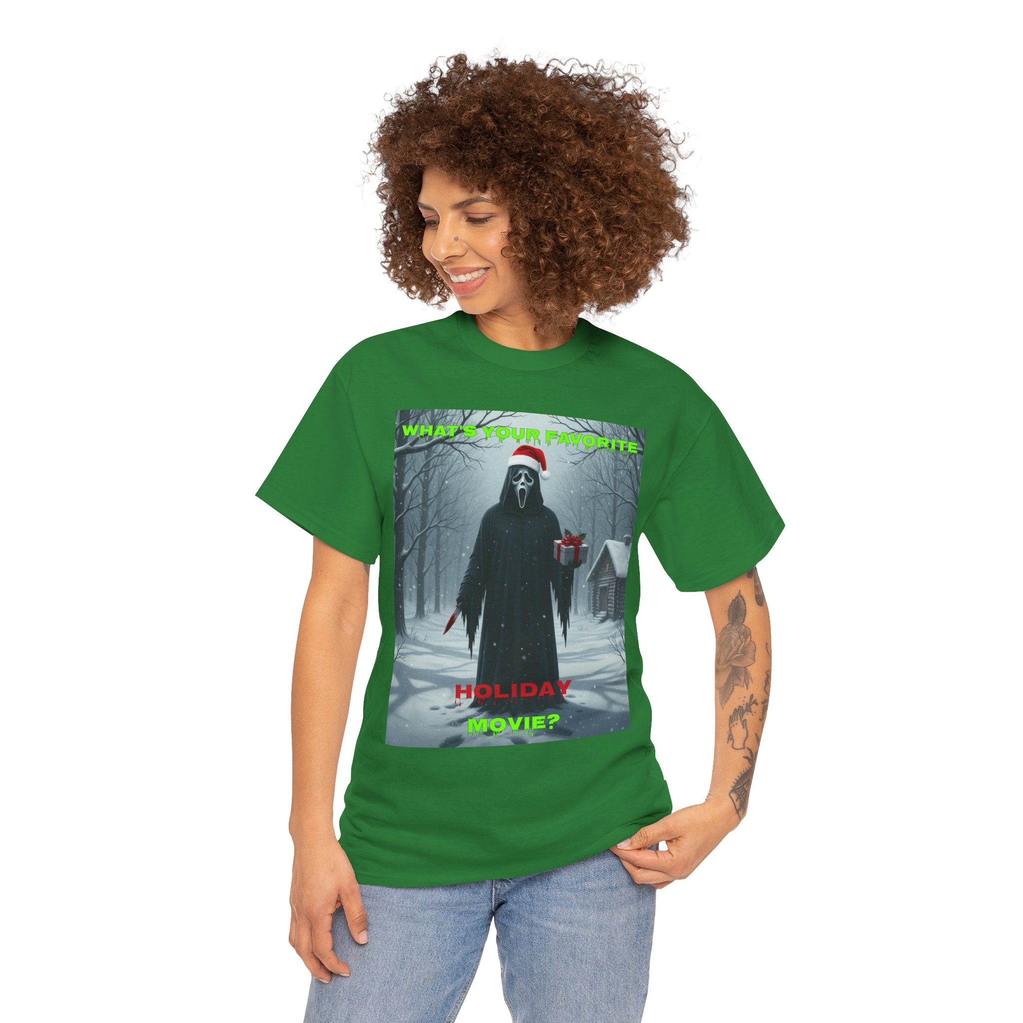 Remember the thrill of the opening credits and that sudden, delicious chill as the first scream cuts the silence? This tee brings that electric, spooky-fun energy into everyday wear. A bold Ghost Face silhouette and the cheeky line about favorite holiday movies sit crisp on the chest — a wink to late-night horror fans and people who trade cozy traditions for jump-scare marathons. It layers easily under hoodies or stands alone with jeans; wear it to movie nights, campfire screenings, or while wrapping presents with a soundtrack of cult classics. Comfortable, understated, and a little bit wicked — it’s for anyone who loves the goosebumps as much as the popcorn.