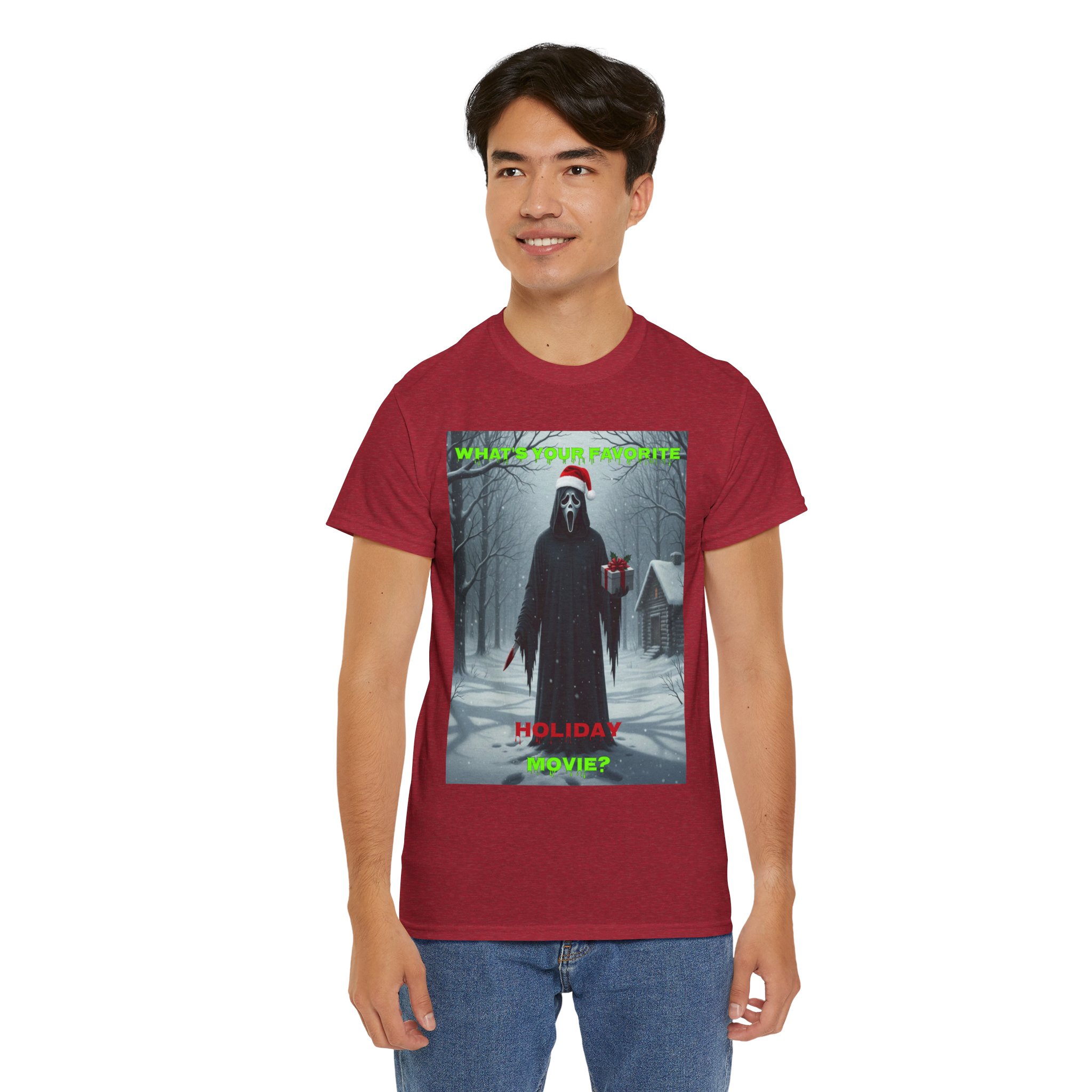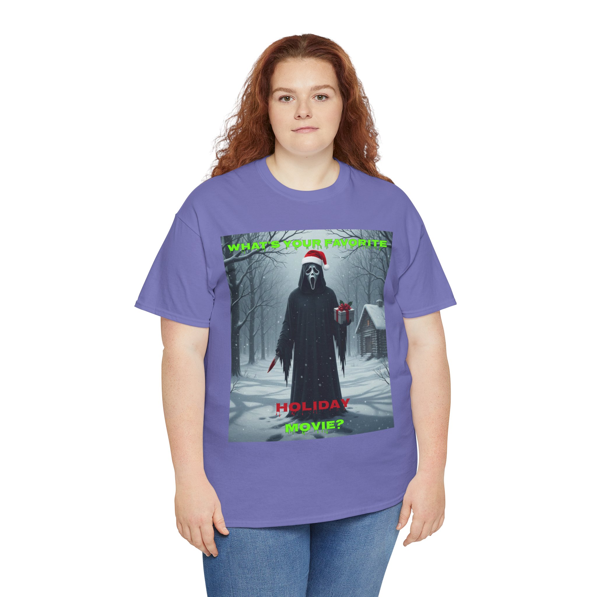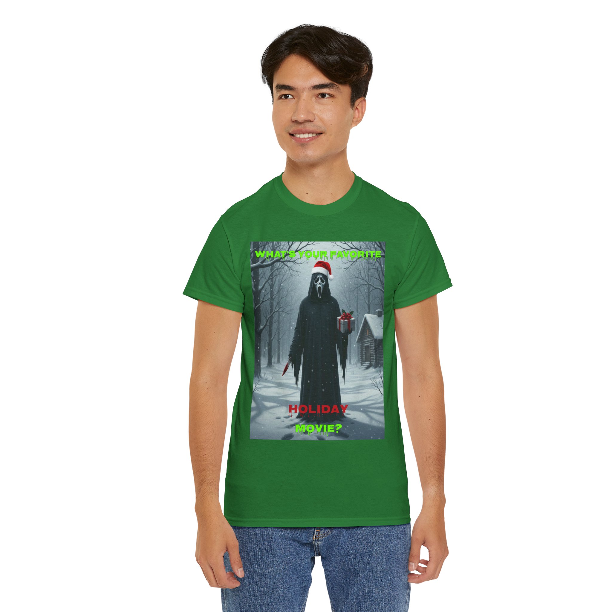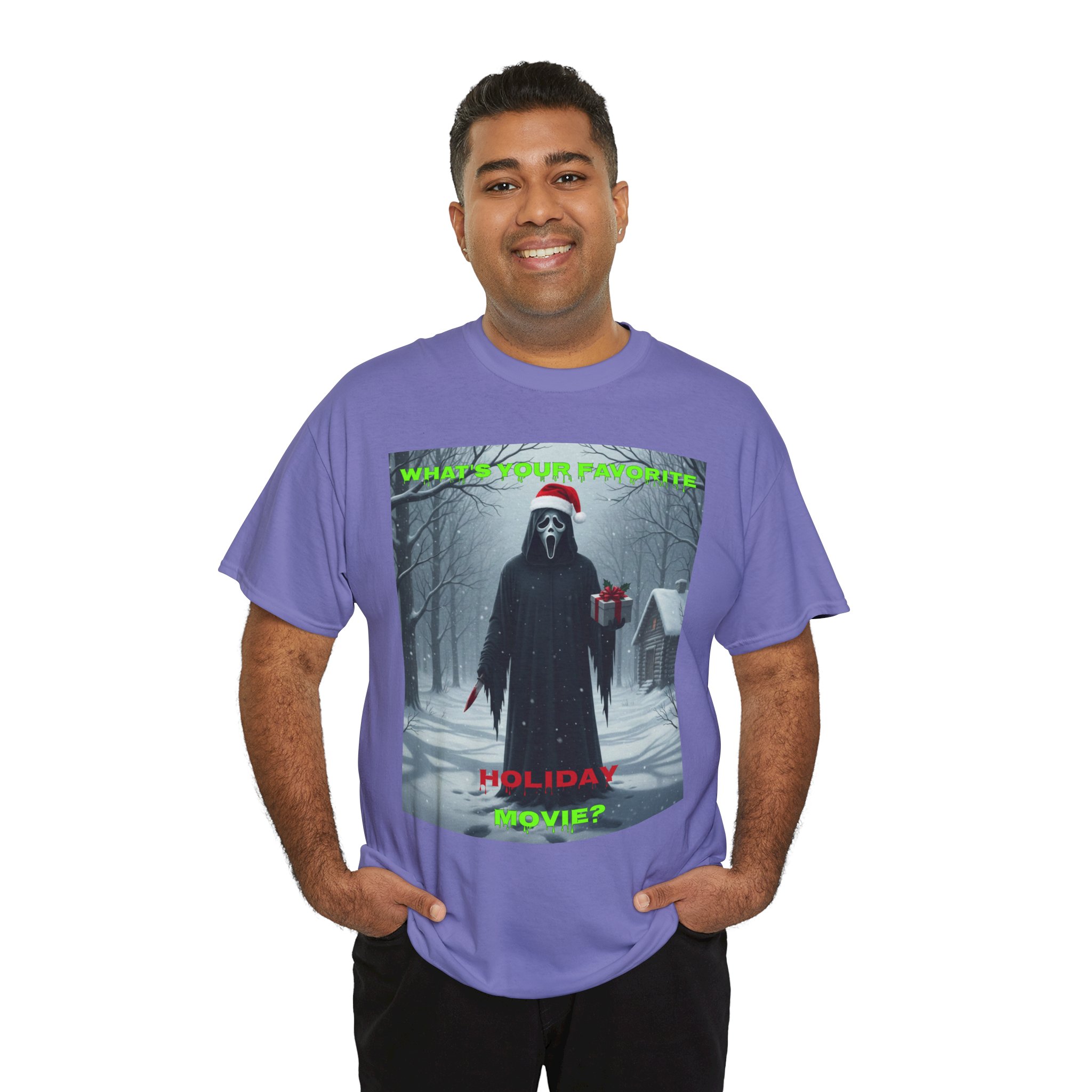 Remember the thrill of the opening credits and that sudden, delicious chill as the first scream cuts the silence? This tee brings that electric, spooky-fun energy into everyday wear. A bold Ghost Face silhouette and the cheeky line about favorite holiday movies sit crisp on the chest — a wink to late-night horror fans and people who trade cozy traditions for jump-scare marathons. It layers easily under hoodies or stands alone with jeans; wear it to movie nights, campfire screenings, or while wrapping presents with a soundtrack of cult classics. Comfortable, understated, and a little bit wicked — it’s for anyone who loves the goosebumps as much as the popcorn.