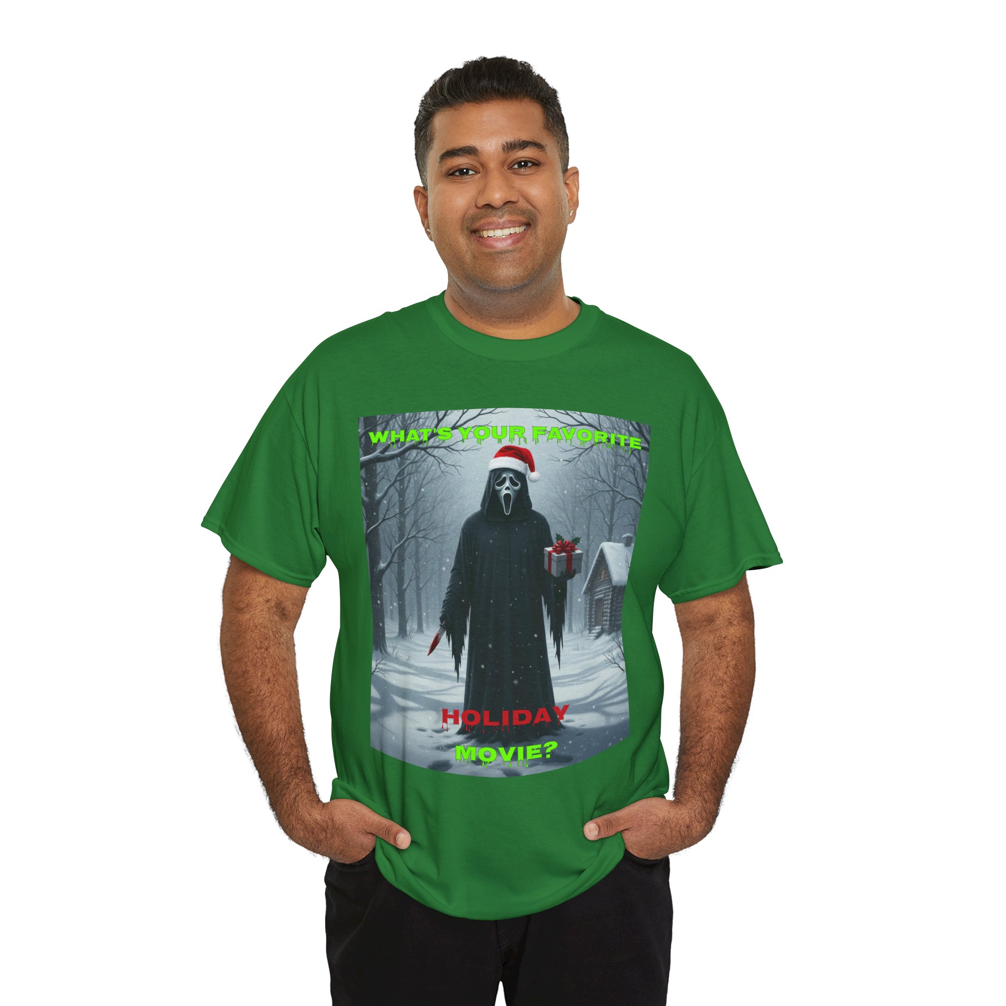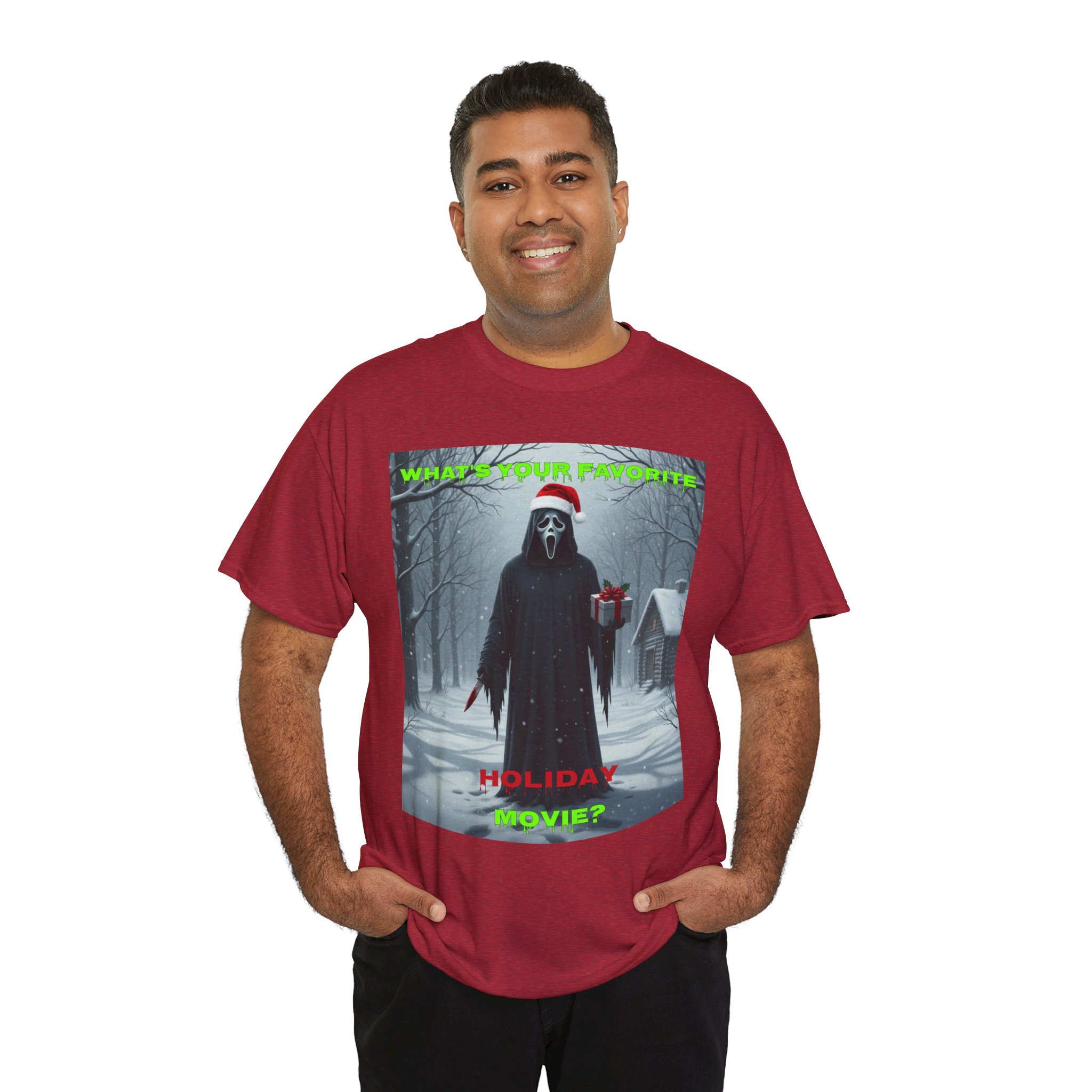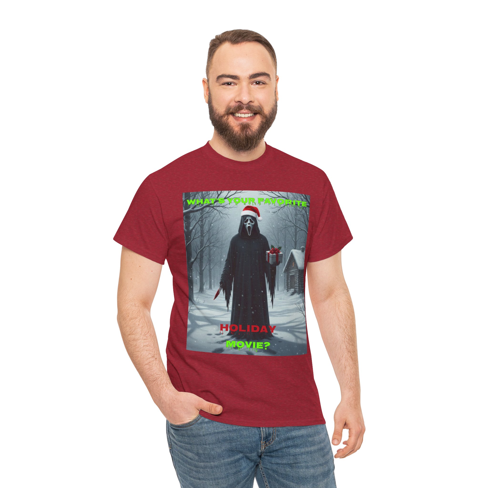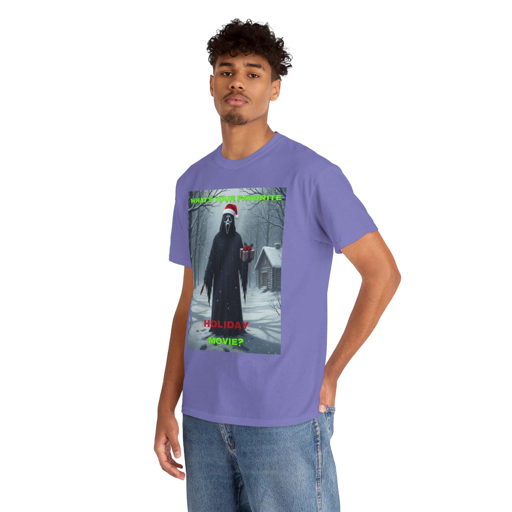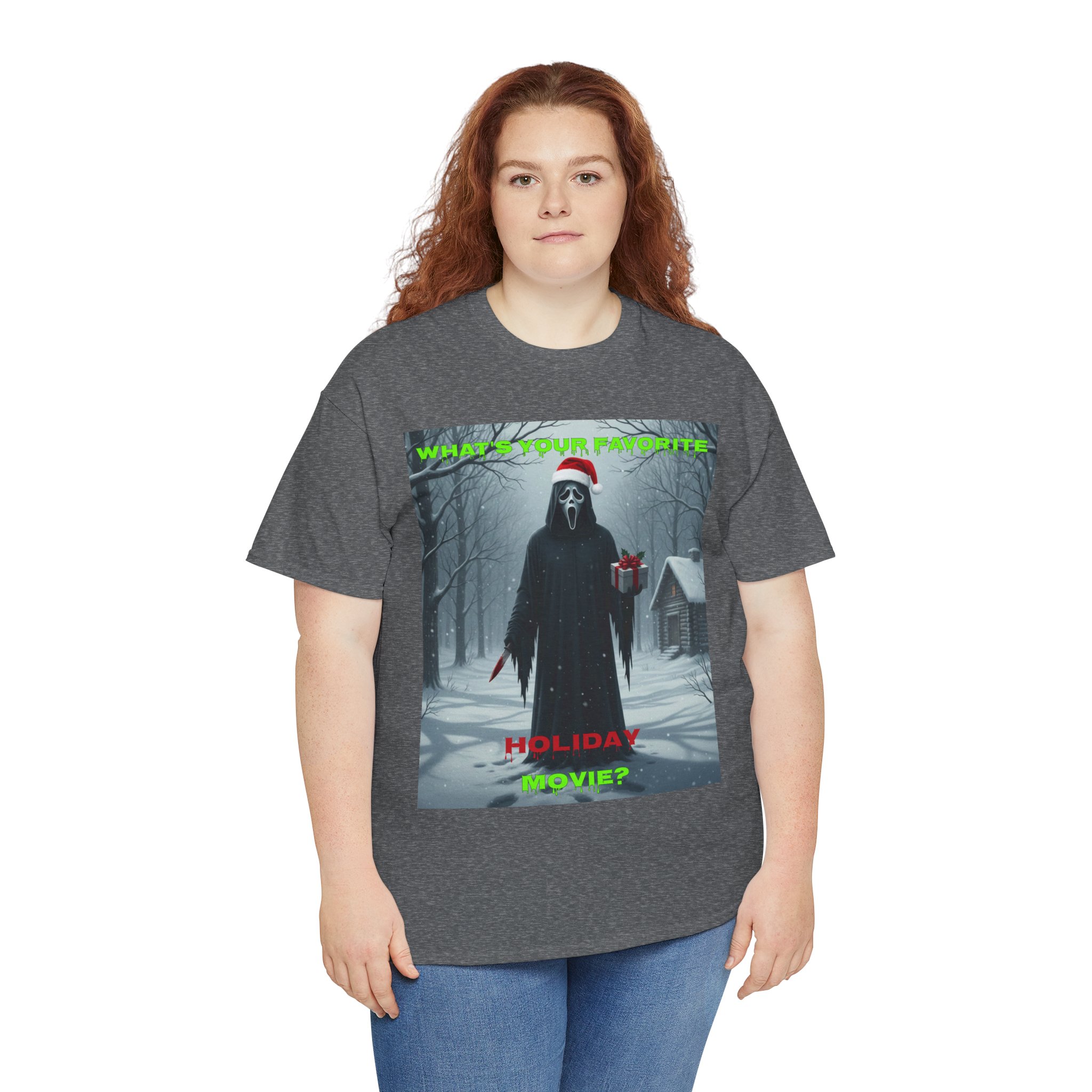 Remember the thrill of the opening credits and that sudden, delicious chill as the first scream cuts the silence? This tee brings that electric, spooky-fun energy into everyday wear. A bold Ghost Face silhouette and the cheeky line about favorite holiday movies sit crisp on the chest — a wink to late-night horror fans and people who trade cozy traditions for jump-scare marathons. It layers easily under hoodies or stands alone with jeans; wear it to movie nights, campfire screenings, or while wrapping presents with a soundtrack of cult classics. Comfortable, understated, and a little bit wicked — it’s for anyone who loves the goosebumps as much as the popcorn.